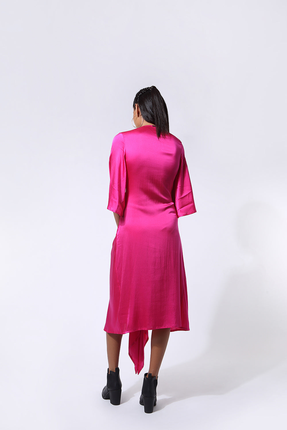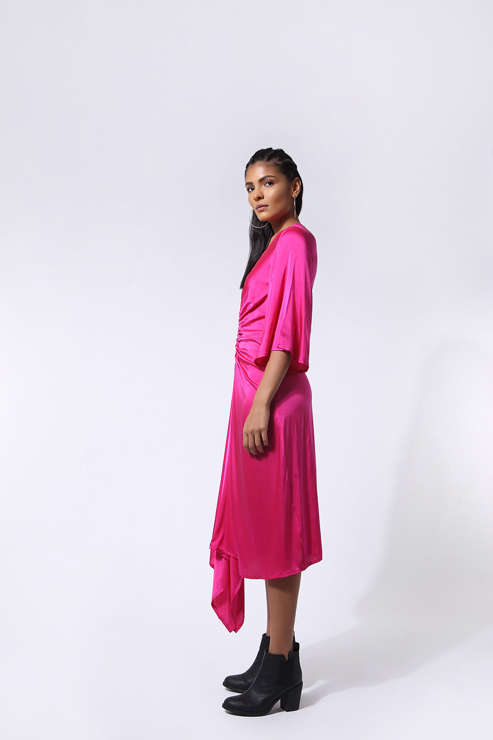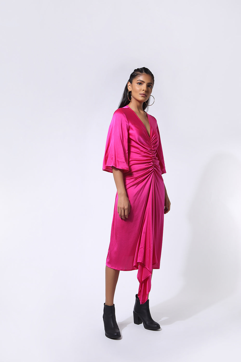 The Nivi Dress is beautifully draped and has a gathered detail on the front that extends into a slit towards the end of the front flap. Slightly skims the body with free-flowing sleeves. Pairs best with our Safa Pant and perfect for work to dinner days.