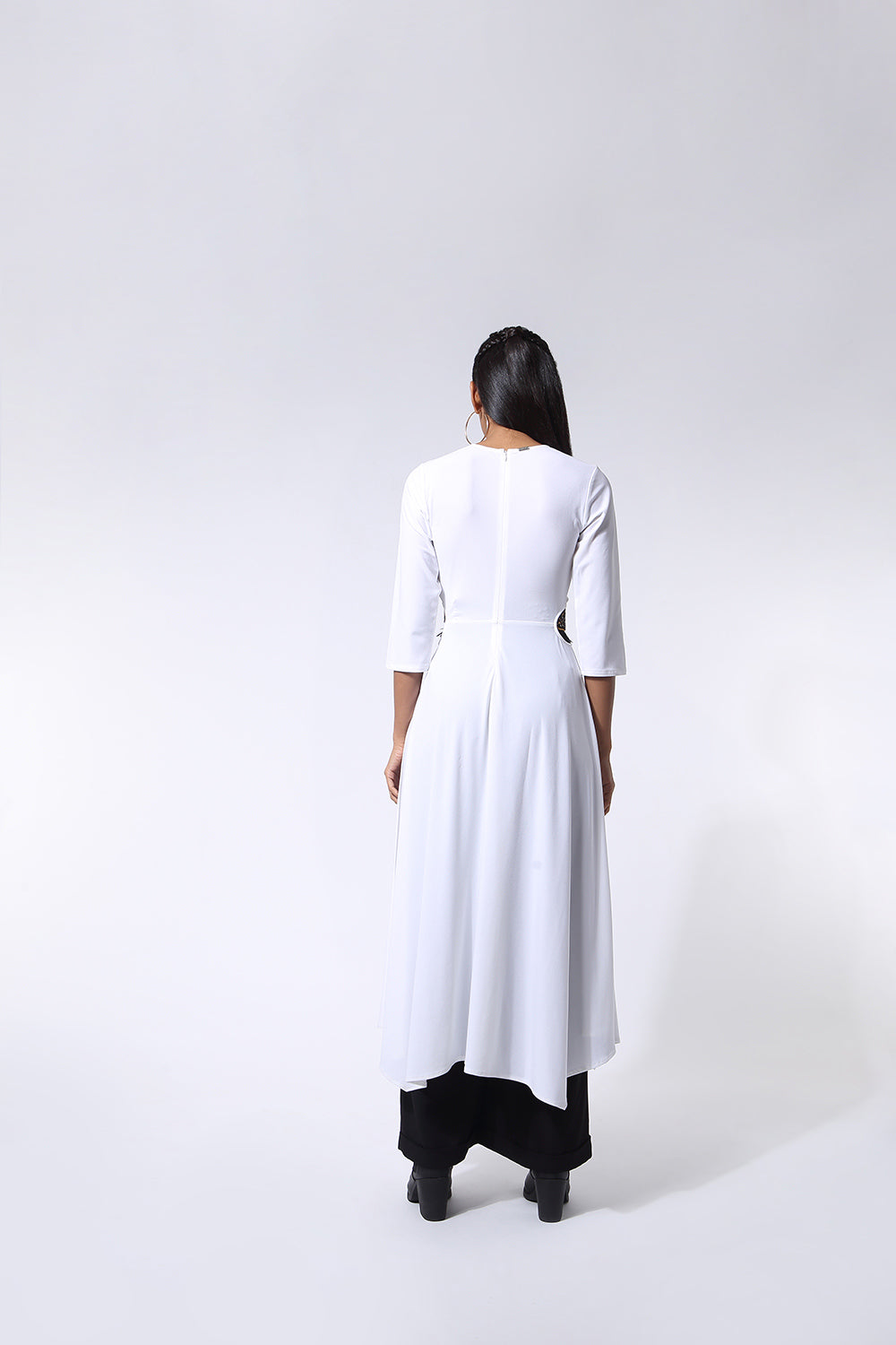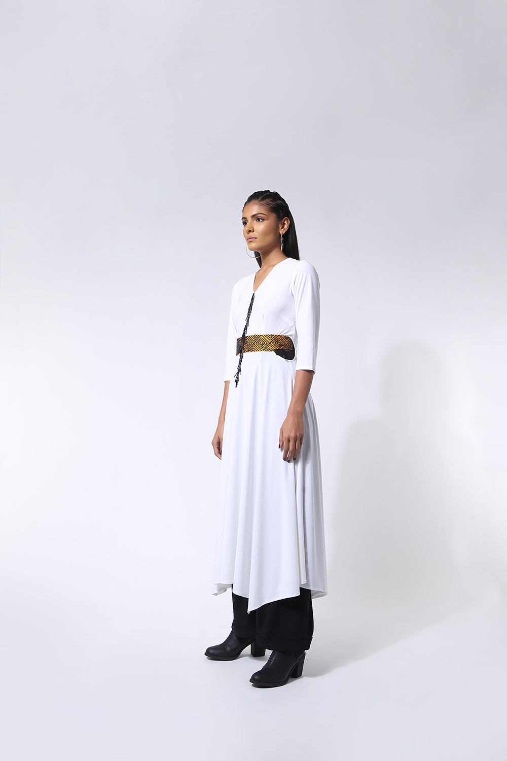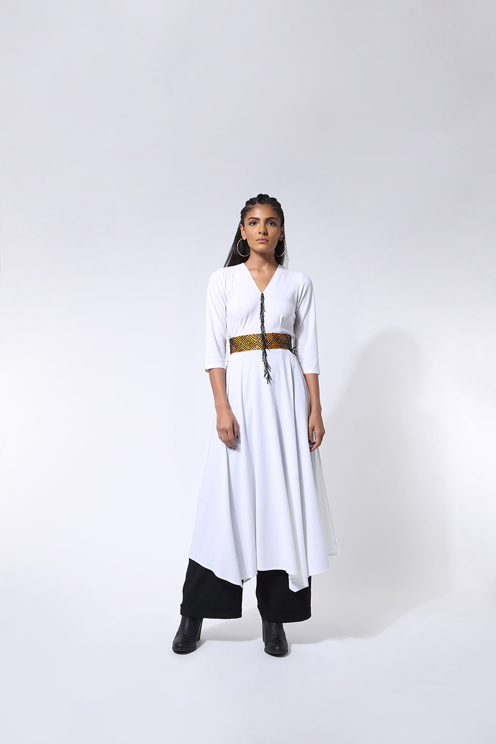 Our Pina Dress features a mid-length V-neck dress in jersey and a hanging embroidered detail from the neckline. Dress it up with a pair of heels and some jewellery.