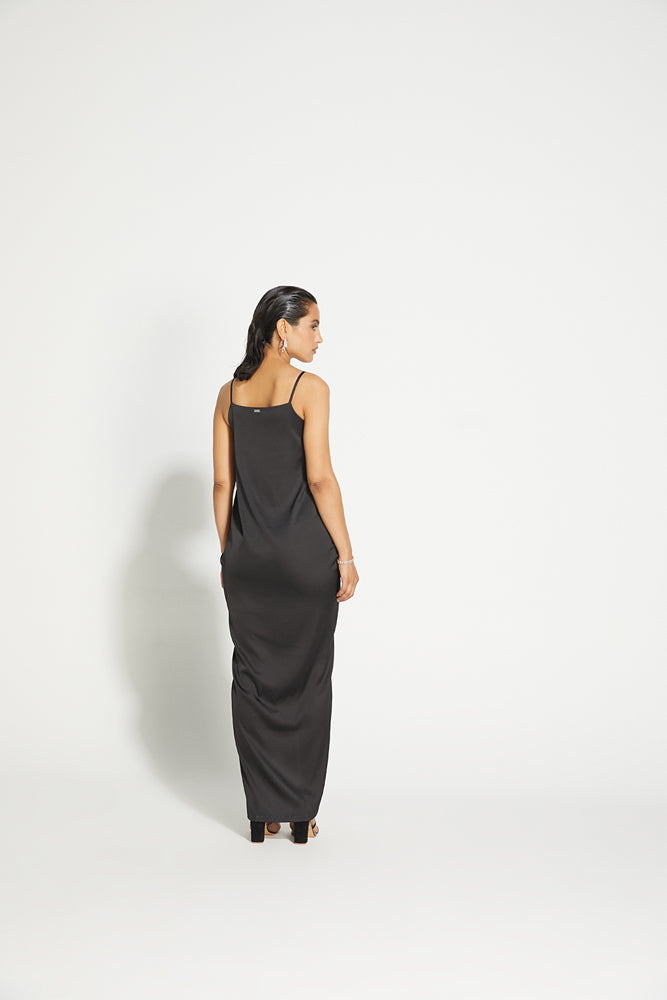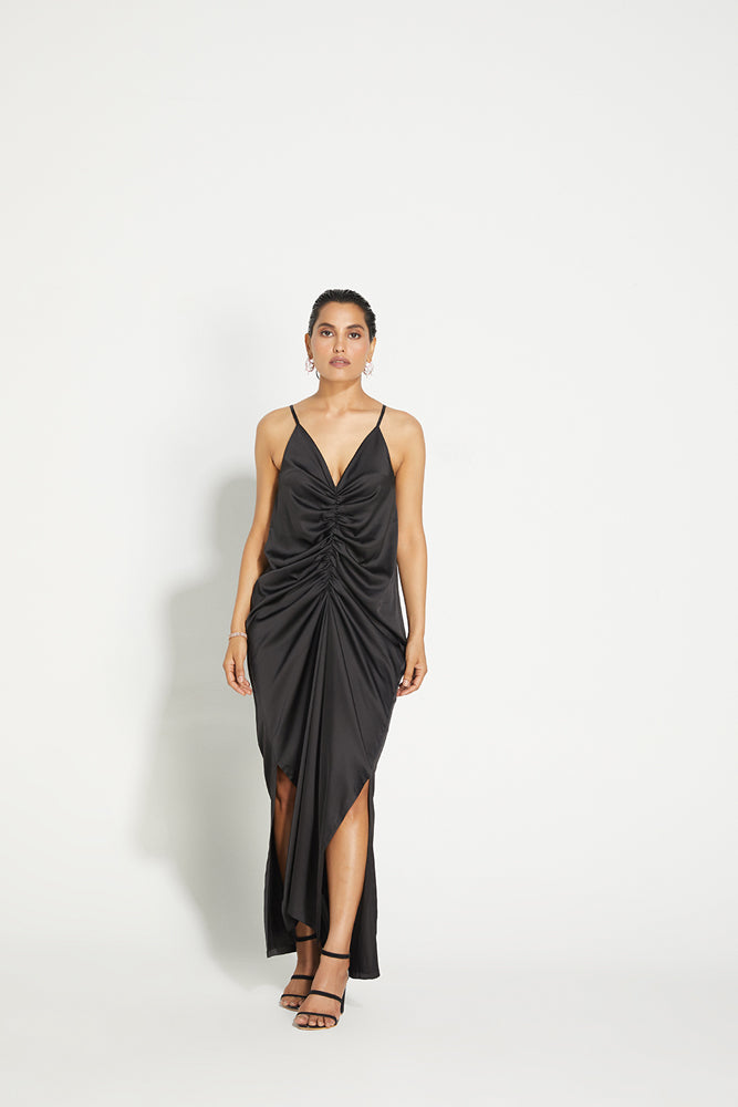 The ease of a Slip Dress enhanced with a ruched detailing on the front. With a deep neckline, dainty straps and slits along the side, the Slip Dress is oh so flirty and a must have.