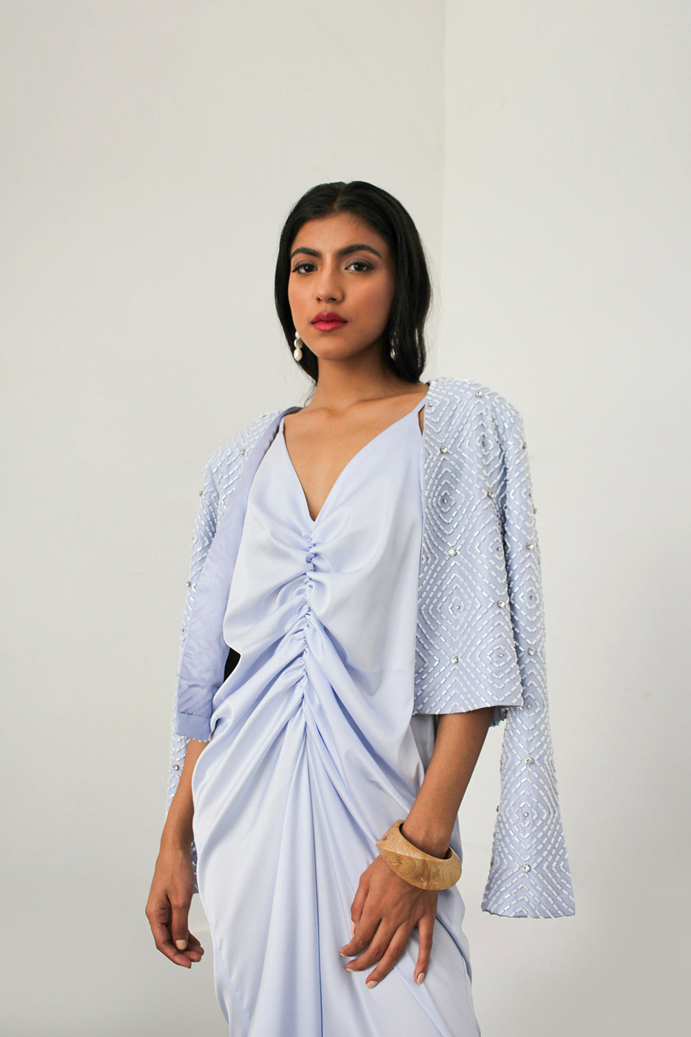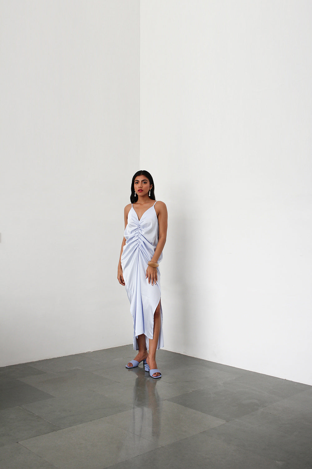 The ease of a Slip Dress, but enhanced with a ruched detailing along the front creates a flattering silhouette for you. Detailed with a deep V neckline, dainty straps and slits along the side makes this slip dress oh so flirty and a must have.