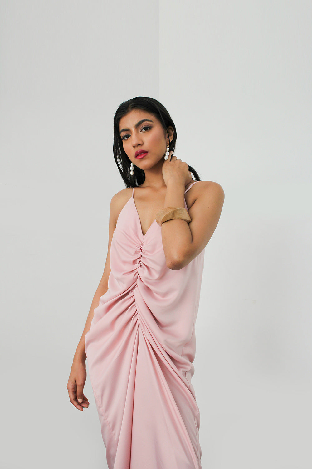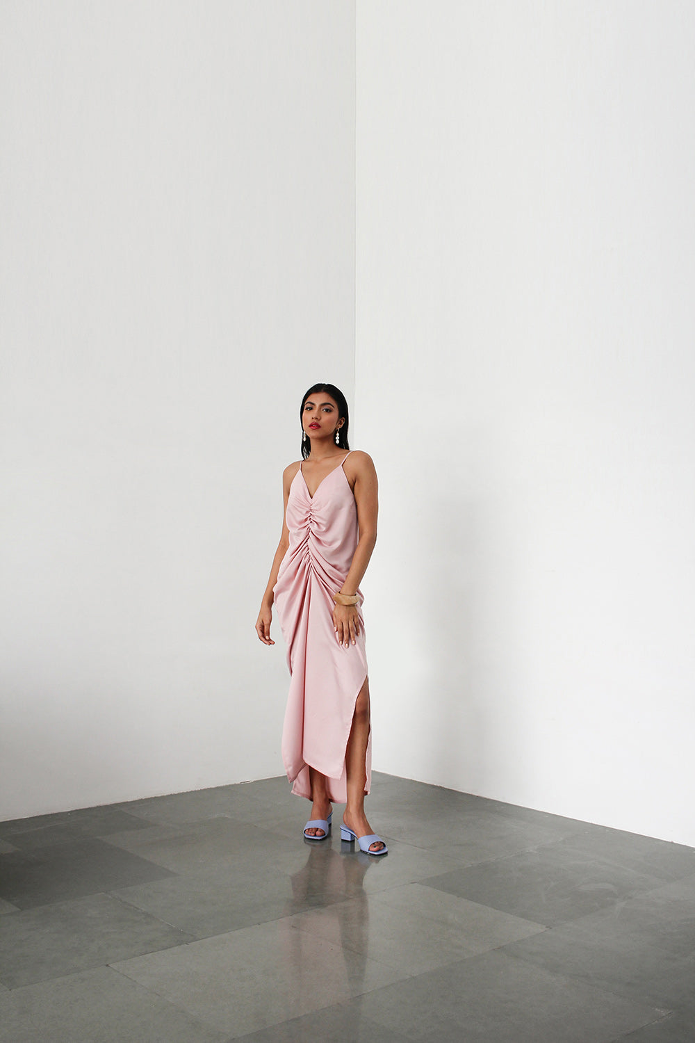 The ease of a Slip Dress, but enhanced with a ruched detailing along the front creates a flattering silhouette for you. Detailed with a deep V neckline, dainty straps and slits along the side makes this slip dress oh so flirty and a must have.