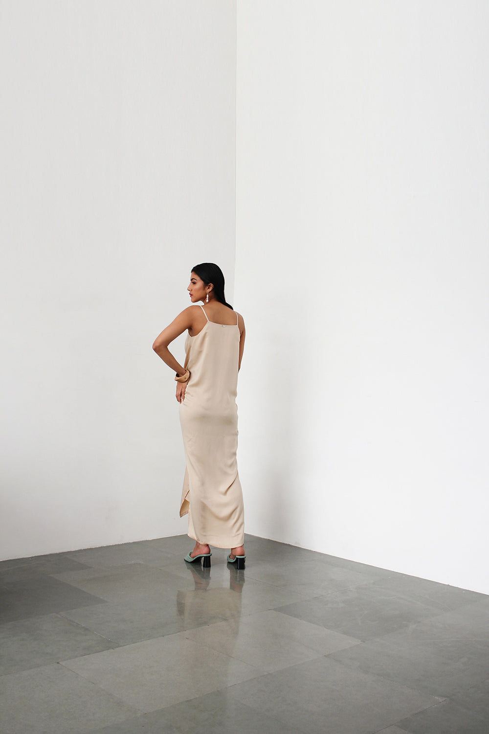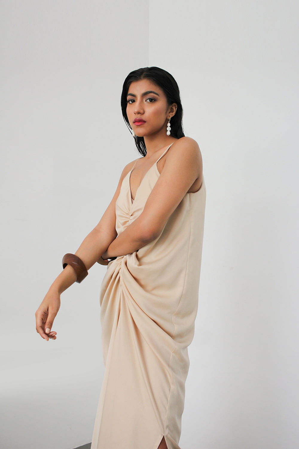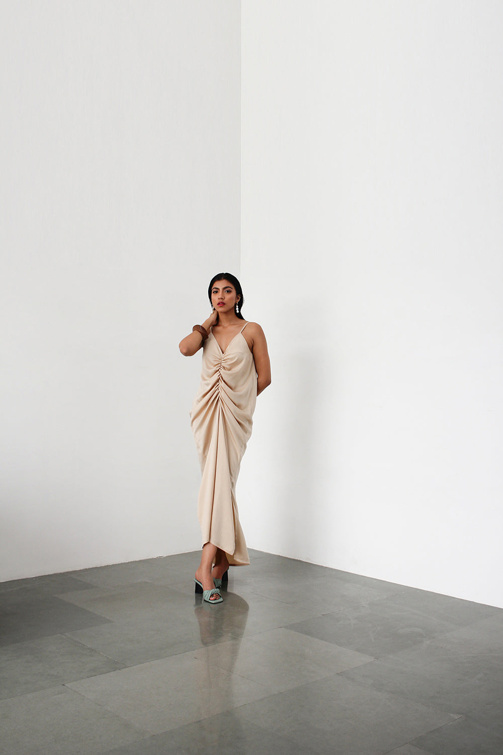 The ease of a Slip Dress, but enhanced with a ruched detailing along the front creates a flattering silhouette for you. Detailed with a deep V neckline, dainty straps and slits along the side makes this slip dress oh so flirty and a must have.