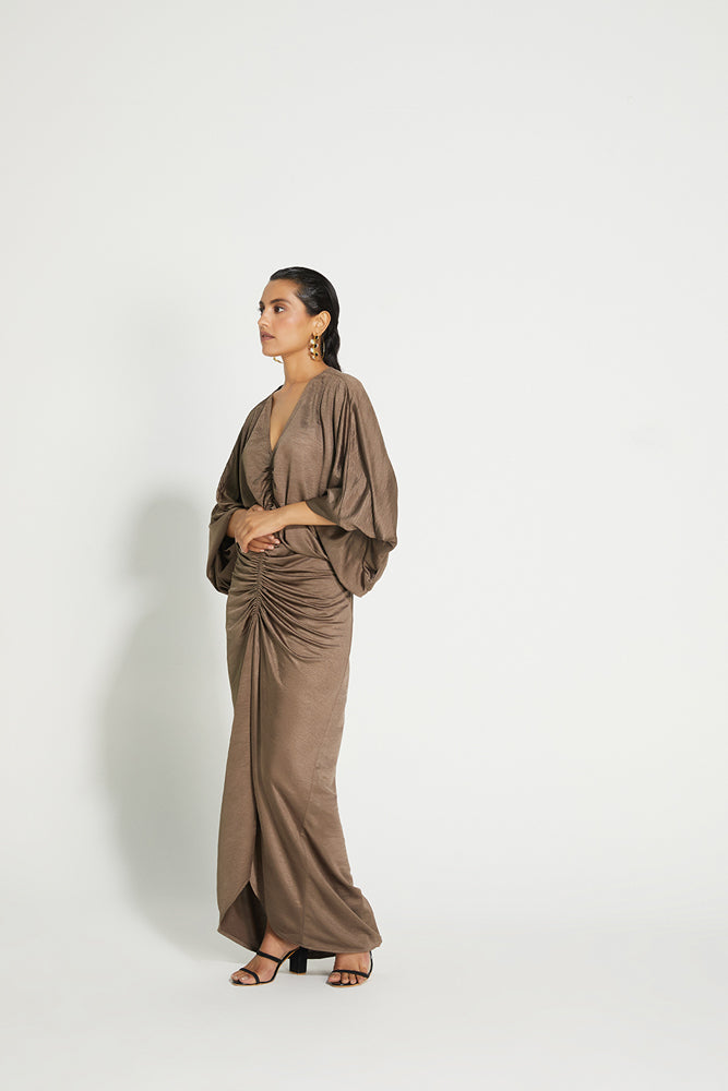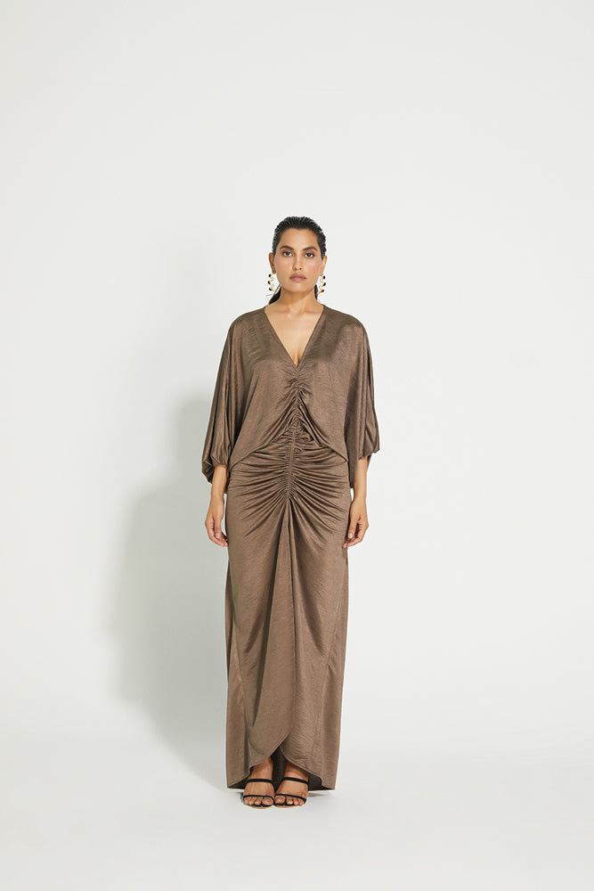 The Sophia Kaftan Dress features a relaxed fit kaftan dress with a draped ruched detail along the front that shapes the body. It has dramatic sleeves and a deep V neckline. Dress it up with a pair of heels and some jewellery.