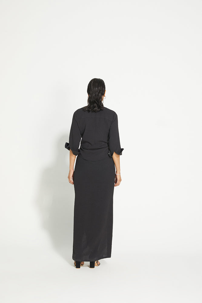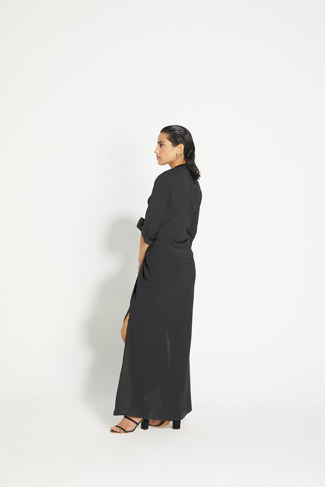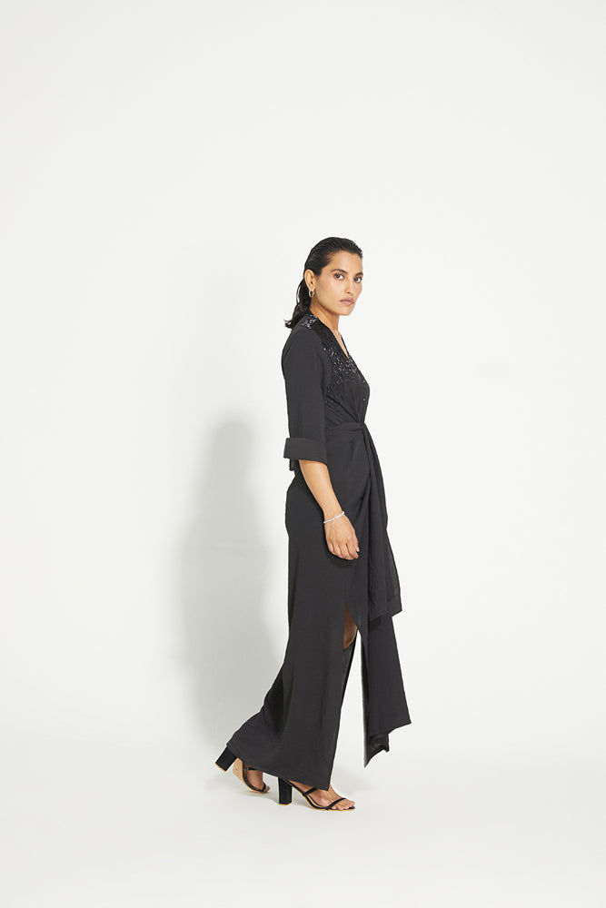 A super flattering silhouette, our Twisted Dress comes with a draped tie front detail to cinch the waist. This calf-length dress is made in crepe and comes with slits on the side, a 3/4th sleeve and a sexy deep neckline. Hand-embroidered details on the shoulder make it a perfect dress for your next dinner date.
