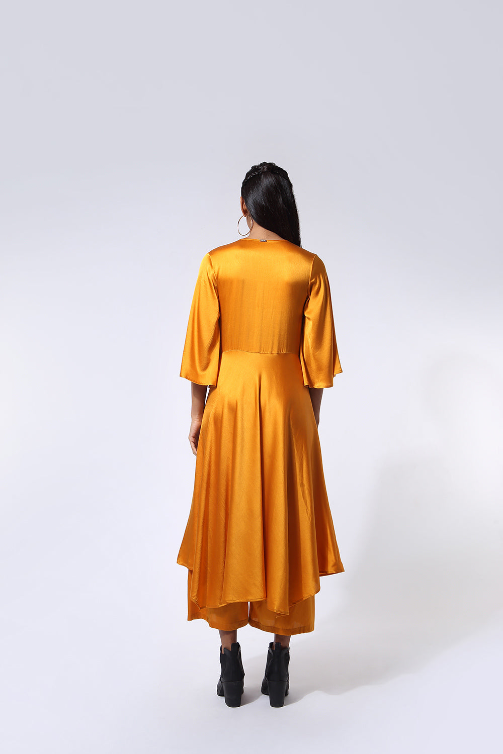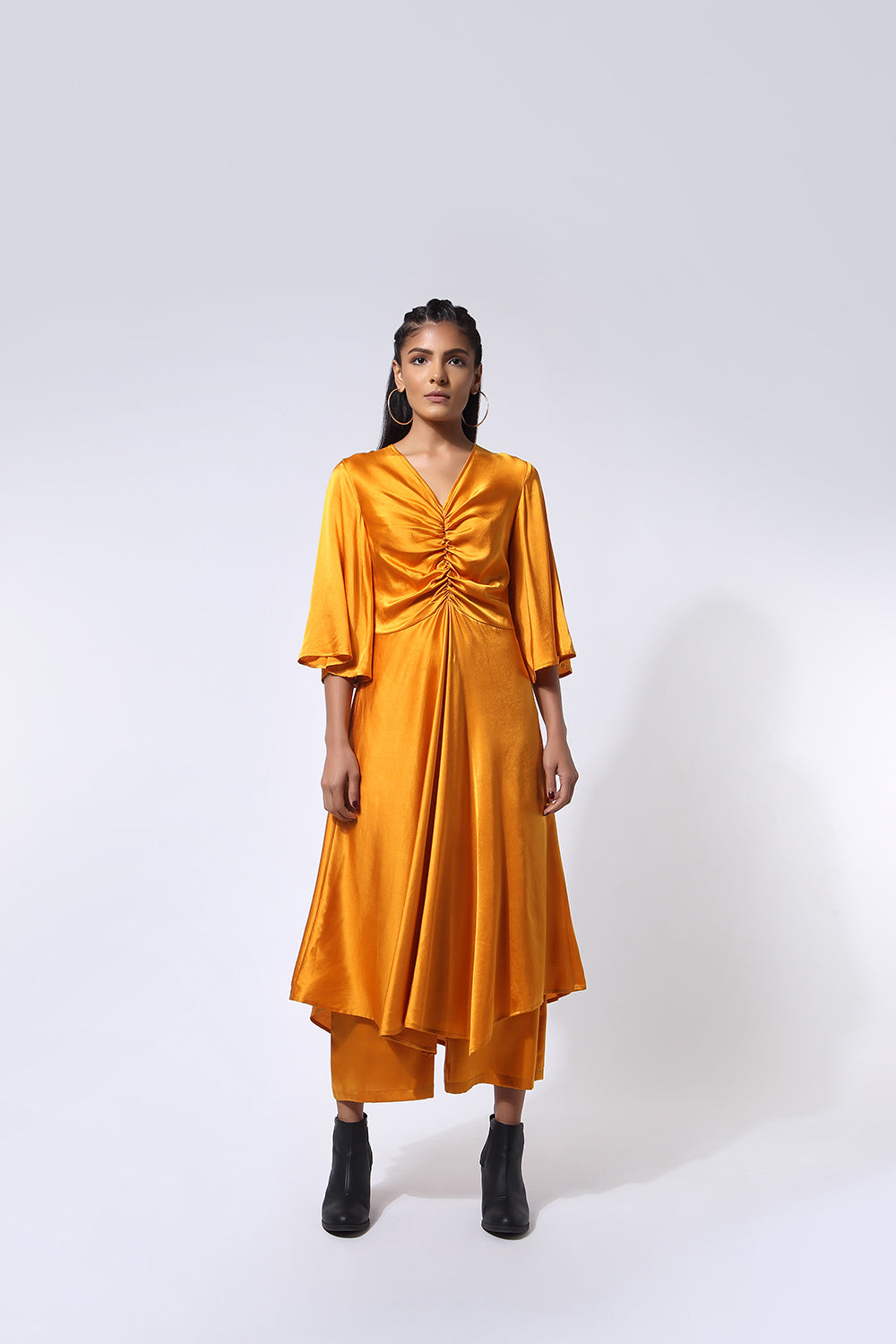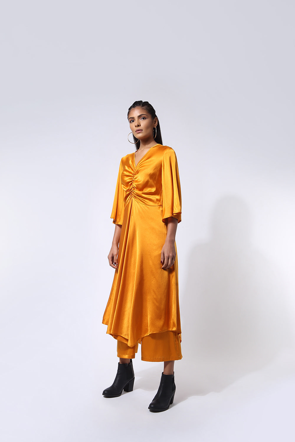 A V neckline Dress enhanced with a ruched detail on the front that flares at the bottom. Flared sleeves add to the effortless ease. dress it up with a pair of heels and some jewellery.
