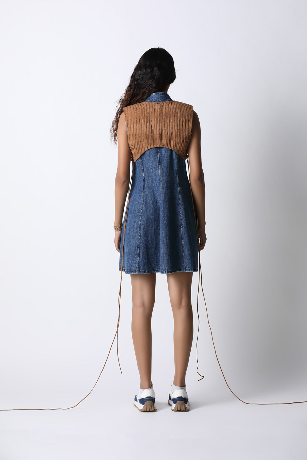 The Dana Dress seamlessly blends the relaxed appearance of denim with a sophisticated V-neckline and flared hem. Tailored with darts to fit and flare on the body. The design is elevated with a detachable suede overlay worn over the shoulders. It is travel friendly and will be a perfect addition for your next trip.