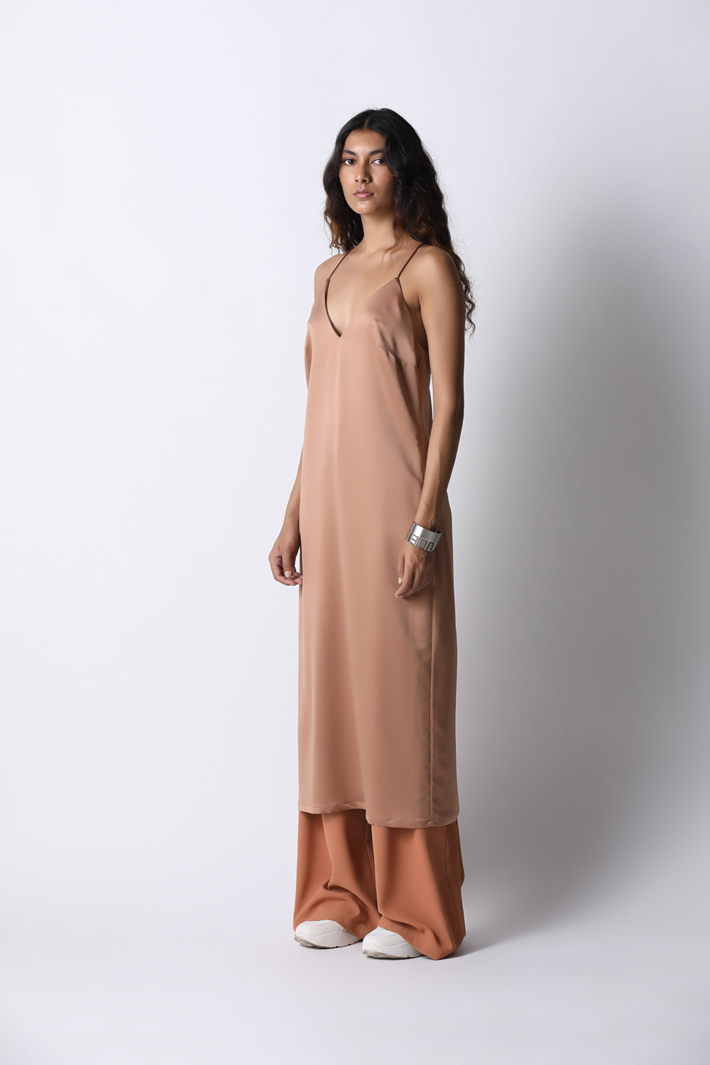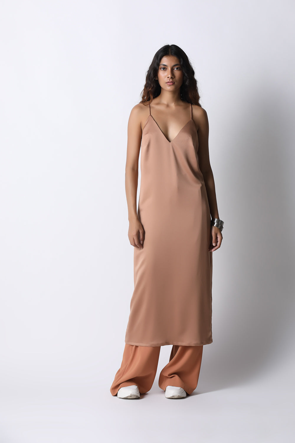 The classic slip dress that we all need. A straight fit slip dress with a deep V neckline and dainty straps and a cross back detail. Just slip it over pants, jeans or wear as is. Paired here with our wide legged trousers tailored to give it that perfect fit.