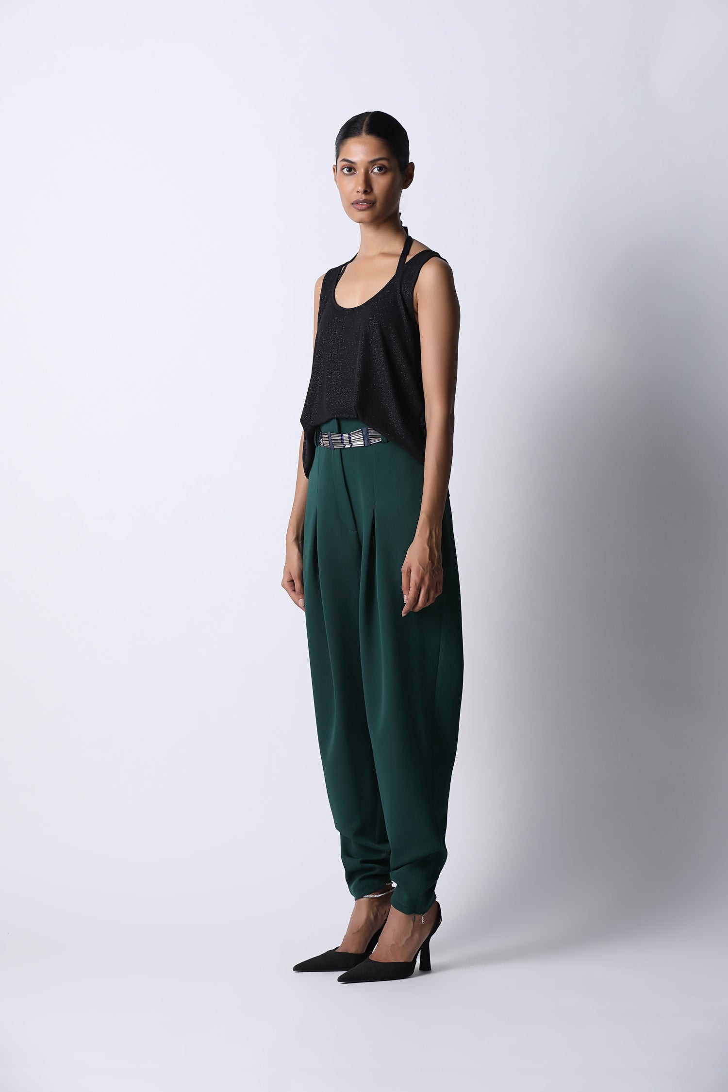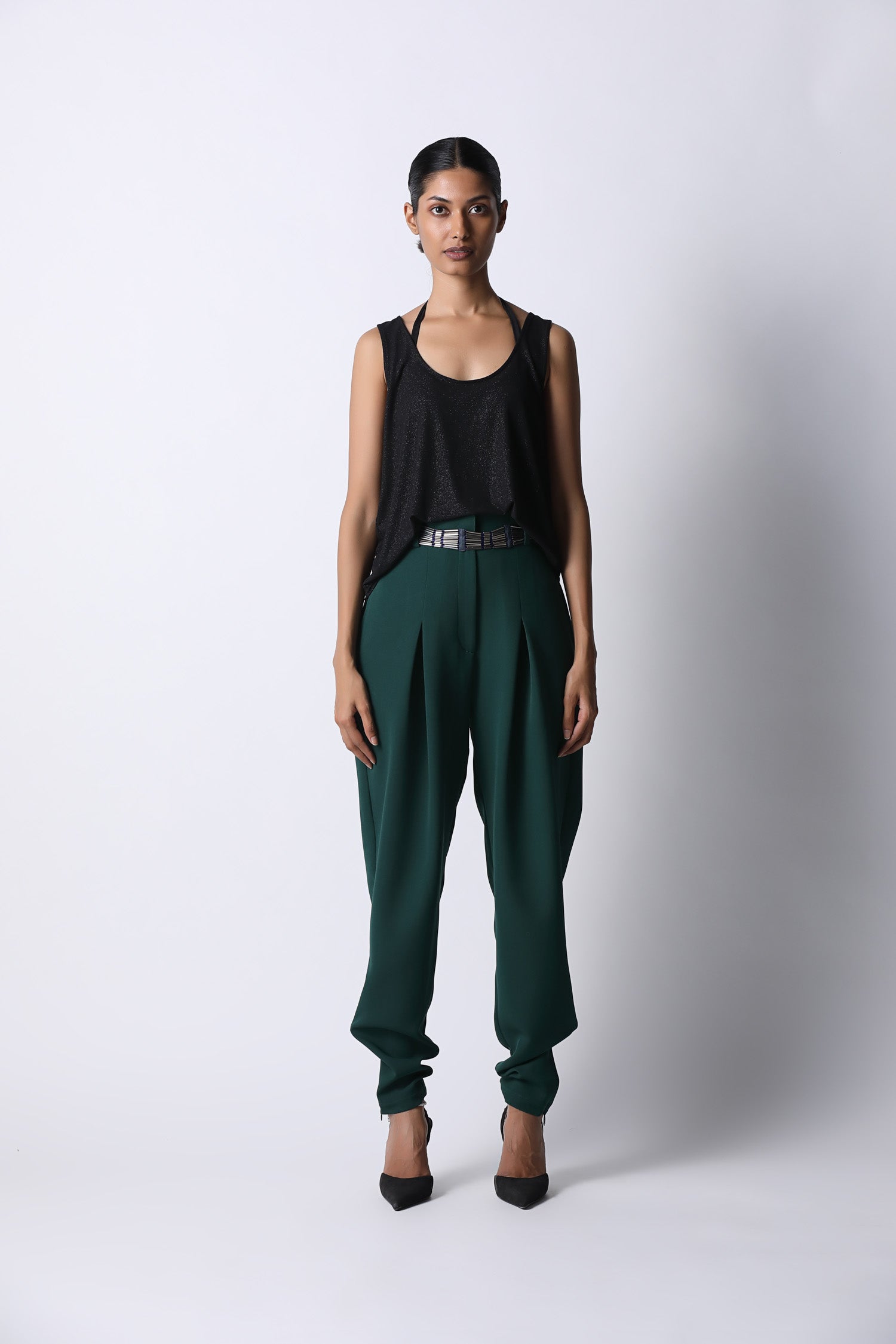 The Pegged Trousers is our signature cargo pants with pleated darts that are flattering to the body. Comes with pockets on both sides and has a zip detail at the bottom hem. Wear it with our shimmer ganji and heels for a casual dinner date.