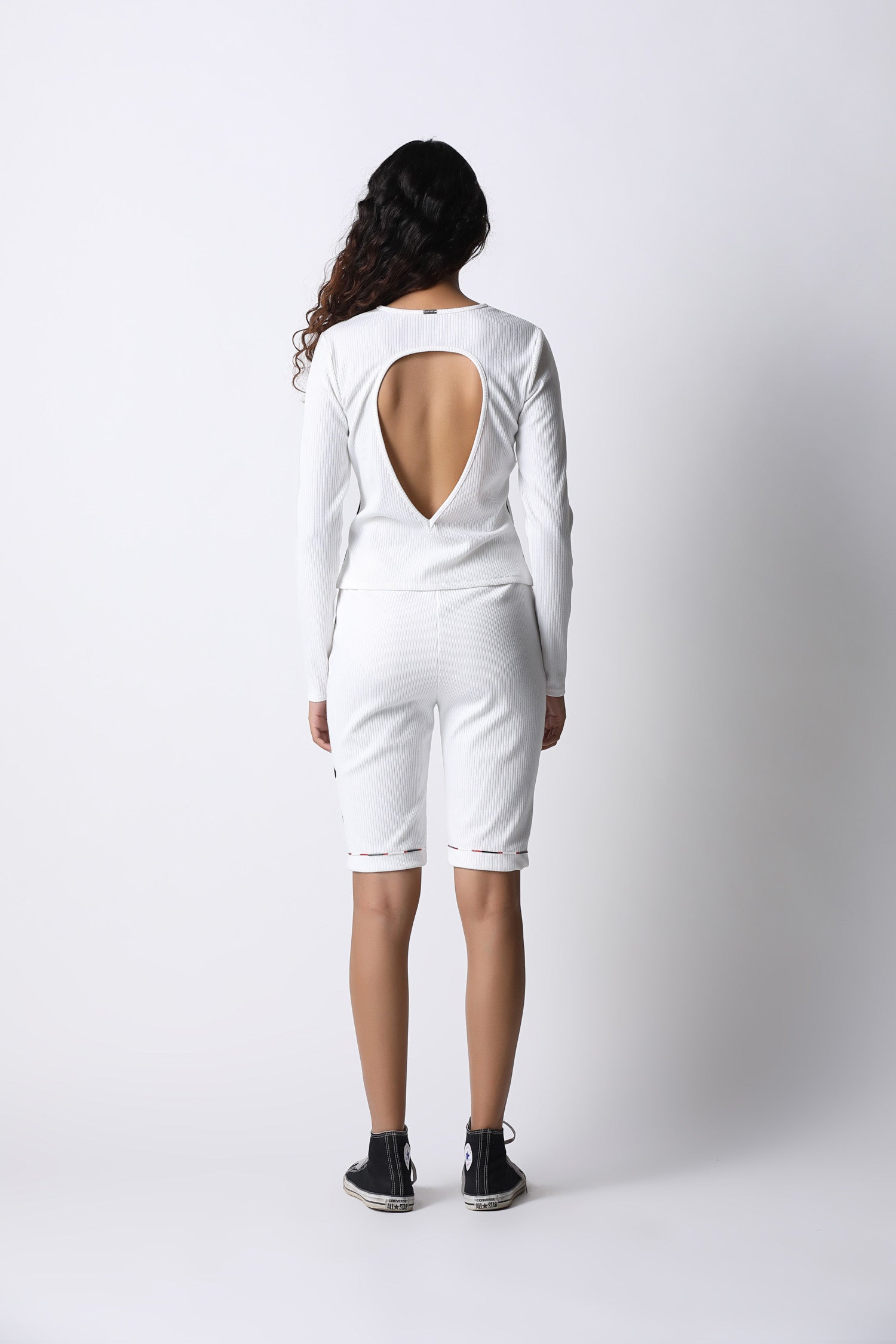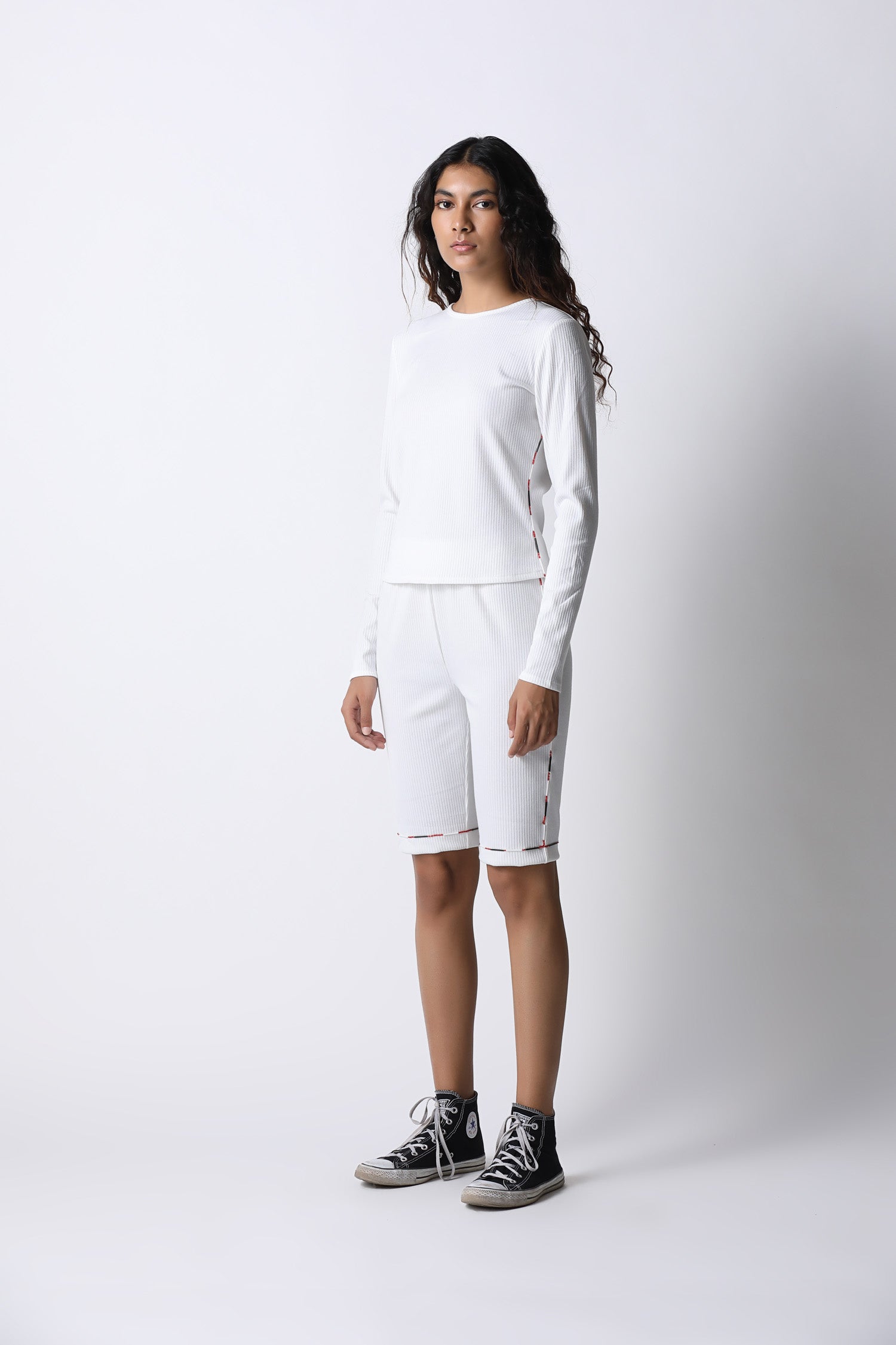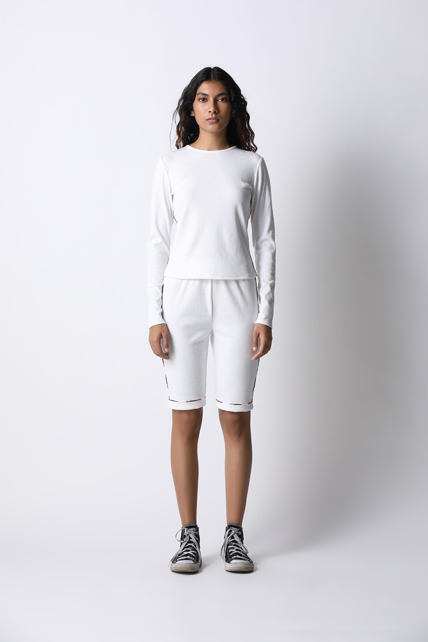 The Ribbed Shorts features a high waist and elasticated waistband cut in a ribbed stretch lycra. Enhanced with hand embroidered beads along the side seam and hem.