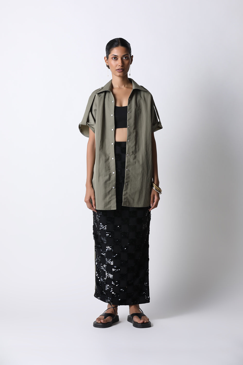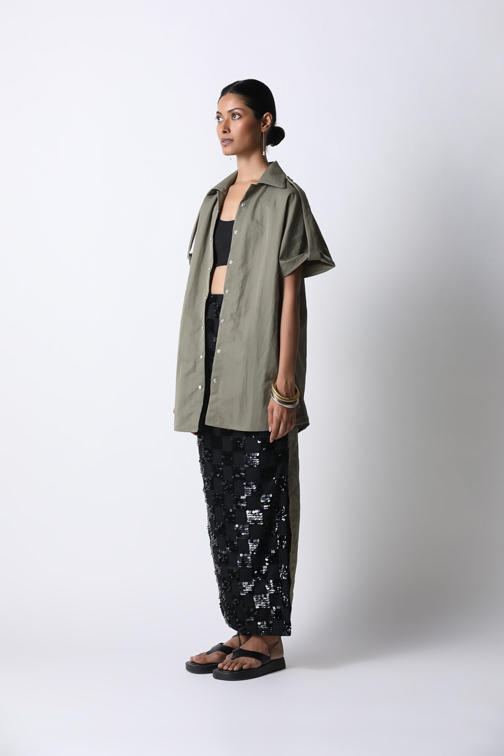 An everyday basic shirt for the summer days. The Sleeveless Taff Shirt is cut in a sandwashed tafetta fabric. It is sleeveless and has a dropped shoulder with a flap that buttons on your shoulder. With a classic shirt collar it closes on the front with shell snap buttons. You can also style this as an open shirt jacket.