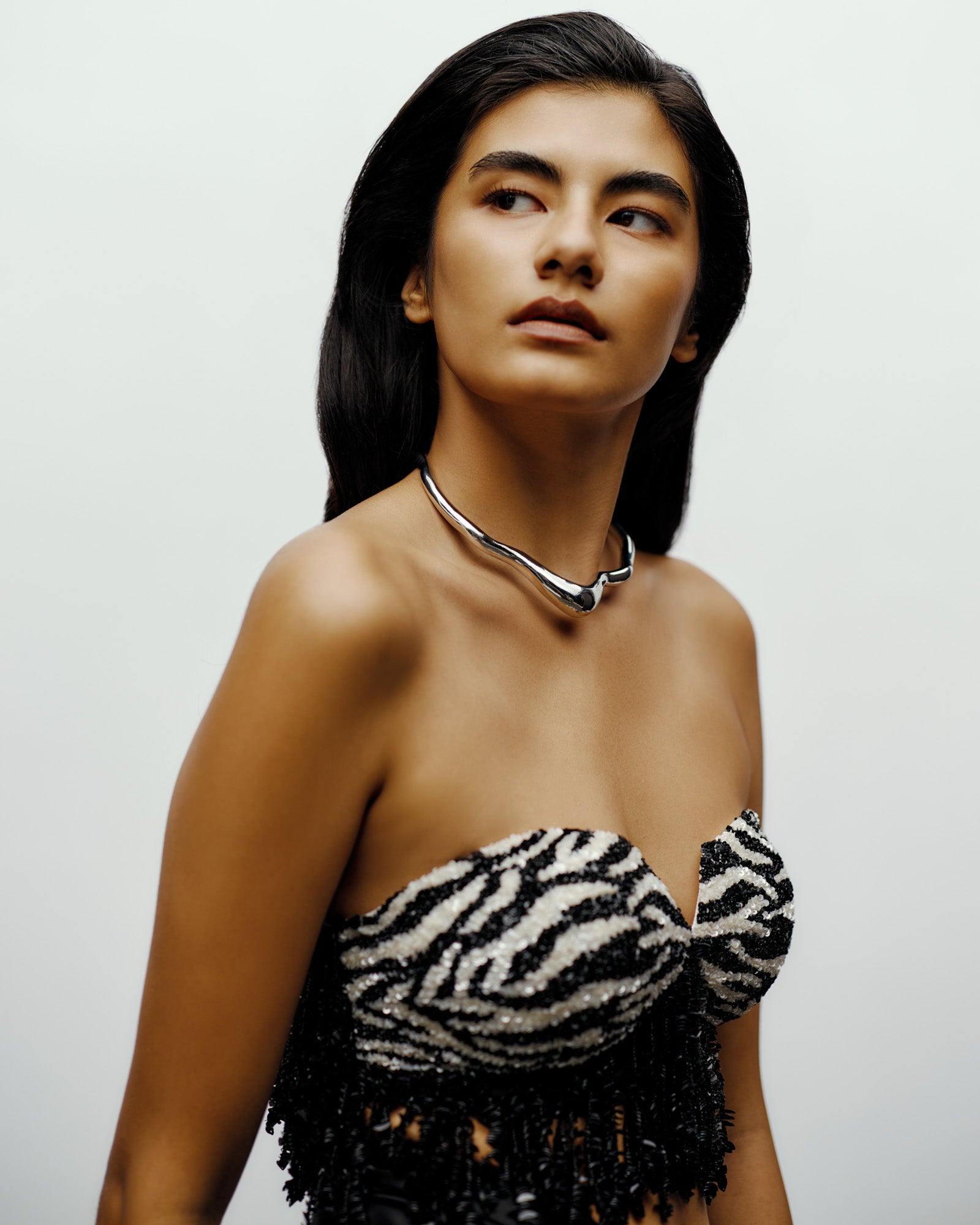 Make a bold statement with the 431-88 structured top, a piece that fuses craftsmanship with contemporary allure. Expertly hand-embellished with intricate beadwork tassels in a striking zebra pattern, this top redefines modern glamour. Designed with a structured, soft sweetheart neckline and subtle plunge detail, it sculpts and accentuates the silhouette. The hemline features fringe bead tassels, adding fluid movement and a touch of drama with every step.