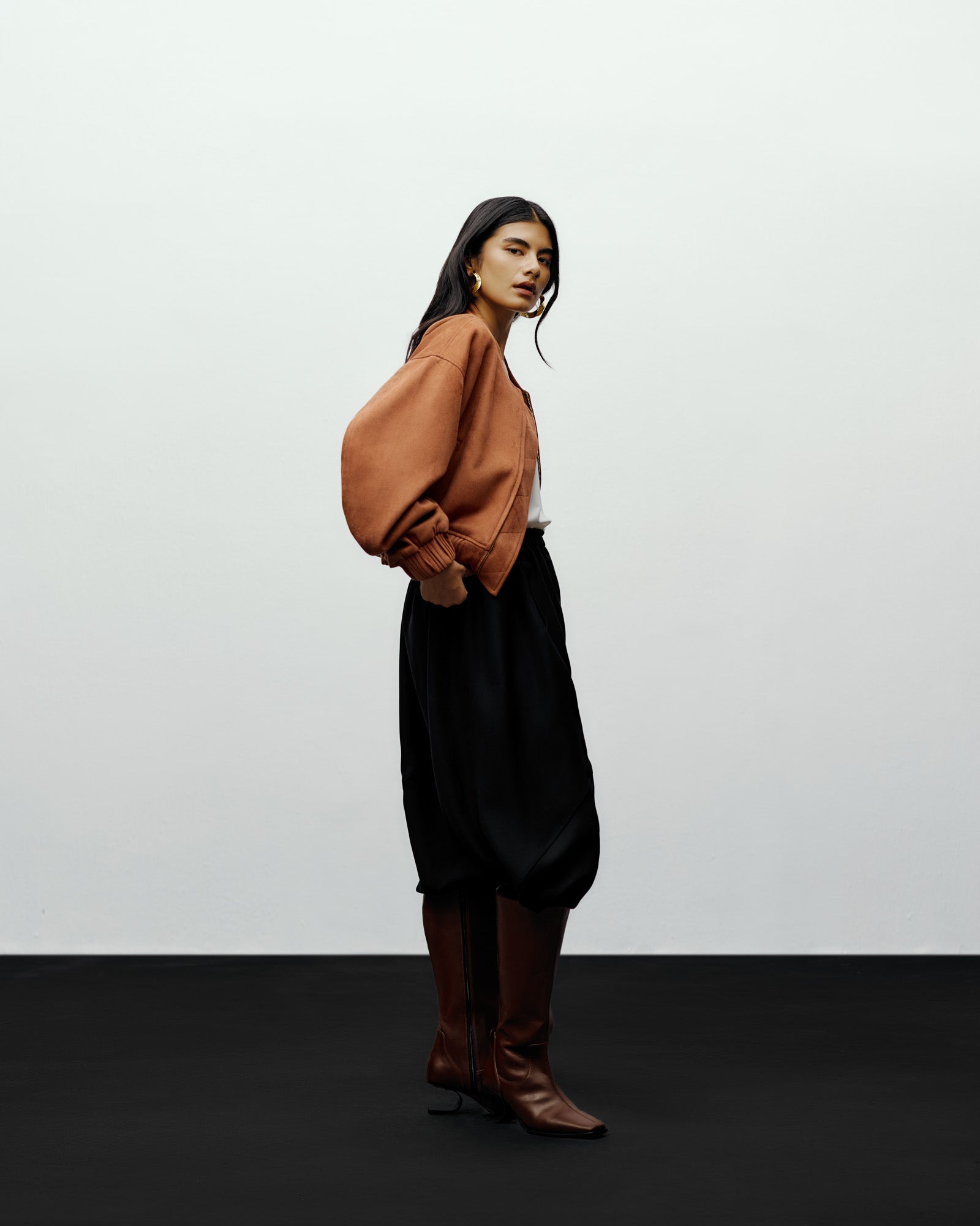 The suede Bomber Jacket redefines utilitarian minimalism with a refined, sculptural edge. Crafted from soft faux suede, this jacket offers a structured yet fluid silhouette, creating a perfect contrast against the brand’s signature draped separates. The boxy fit, exaggerated sleeves, and gold-tone zipper details lend a touch of modern luxury while maintaining effortless wearability. Layered over bold hues or monochrome foundations, this jacket adds dimension, texture, and quiet confidence to any look, a true 431-88 essential for transitional dressing.