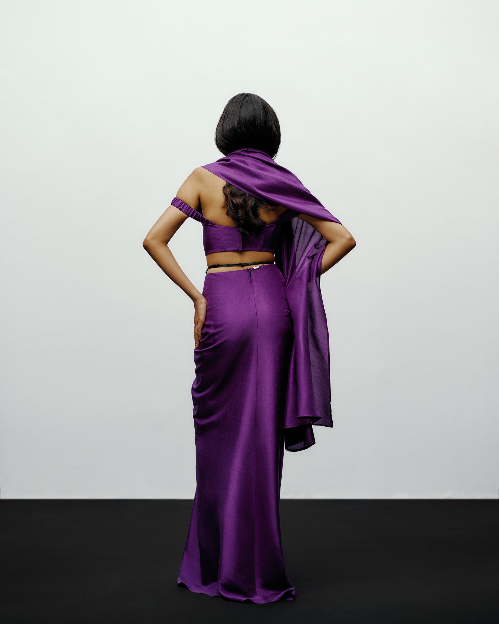 The off-shoulder blouse in purple embodies the brand’s signature balance of sculptural elegance and contemporary ease. Crafted from lustrous silk-blend fabric, the off-shoulder blouse adds a touch of sensuality, contrasted beautifully by the bold, structured pleats. Elasticated sleeve for easy movement.