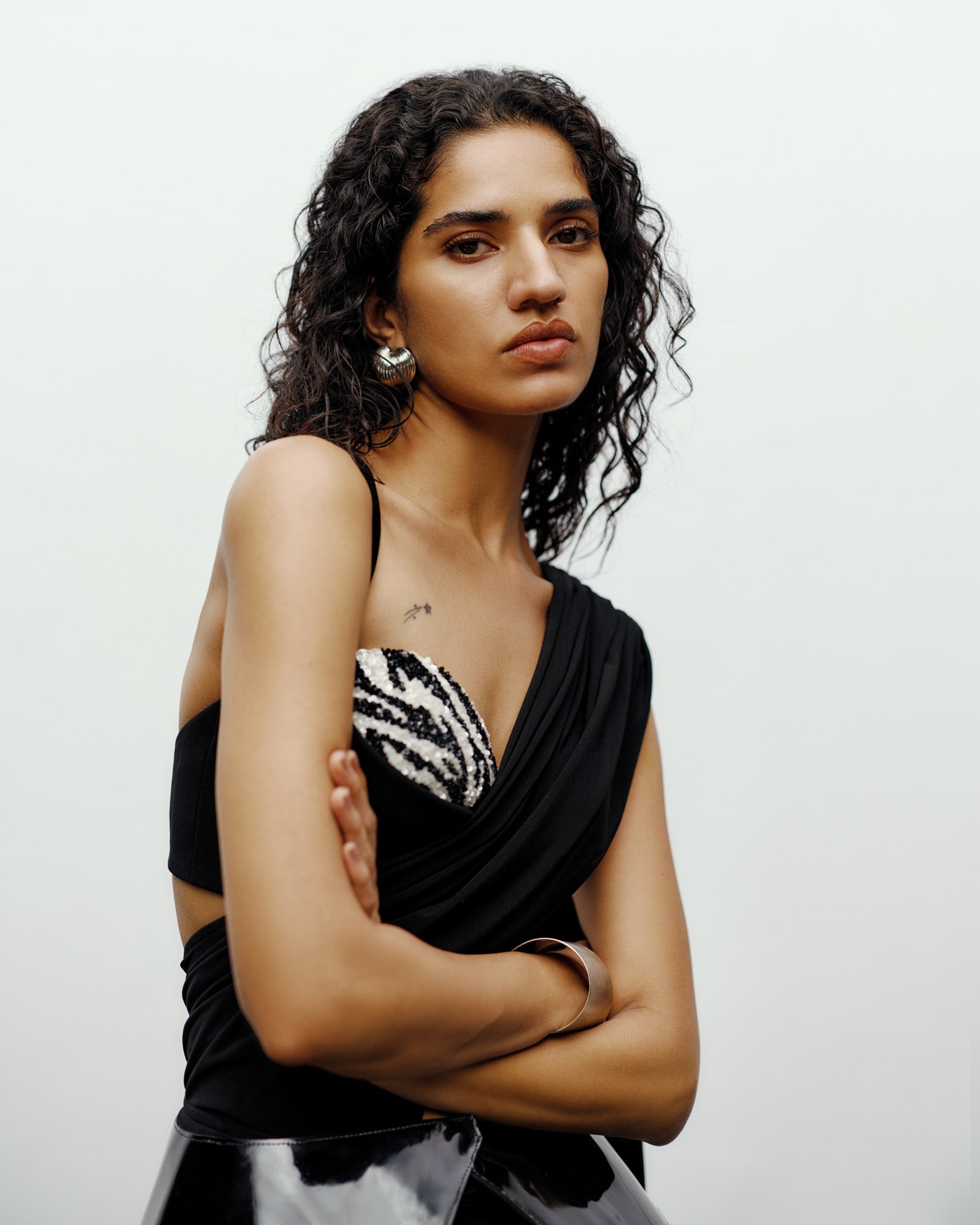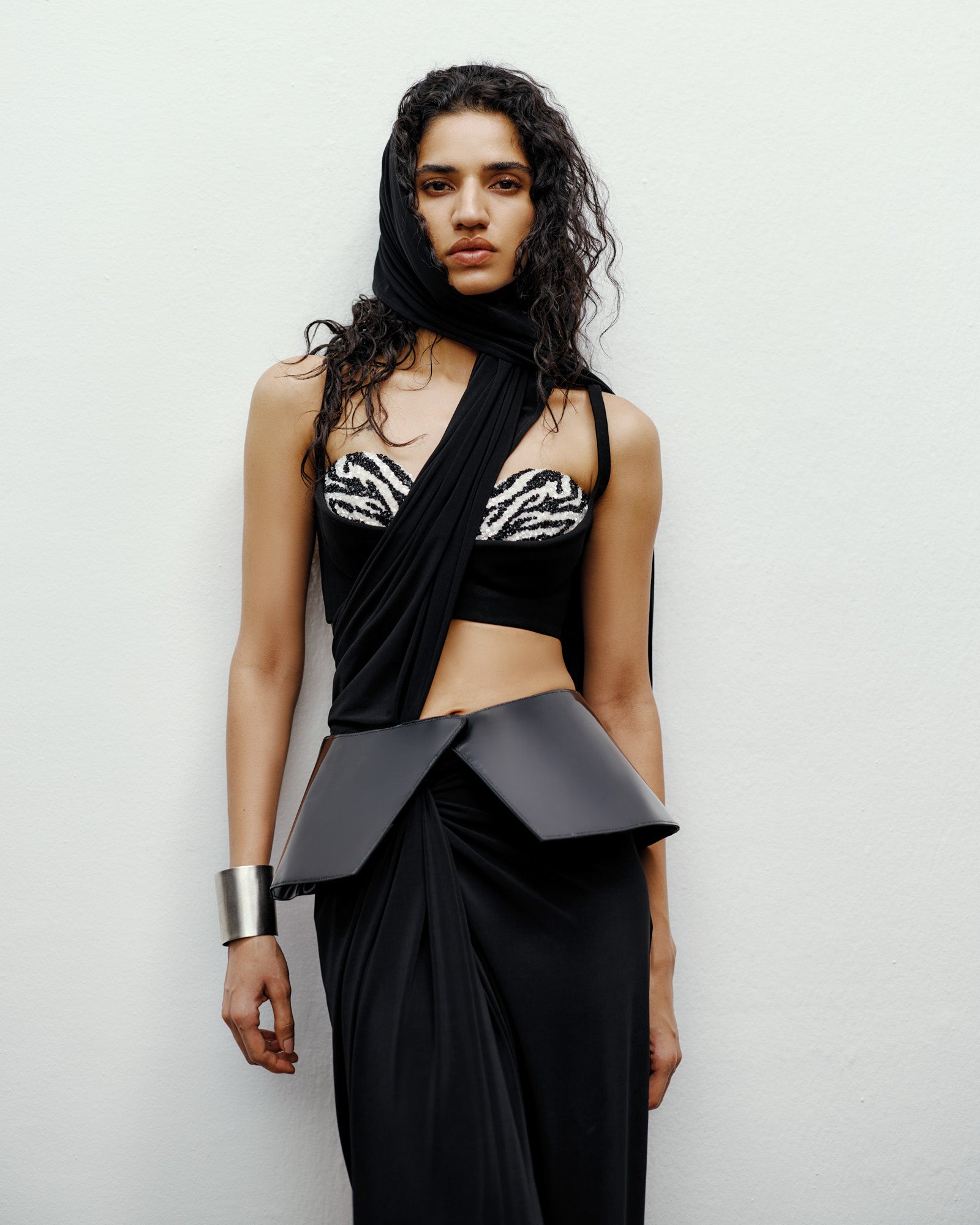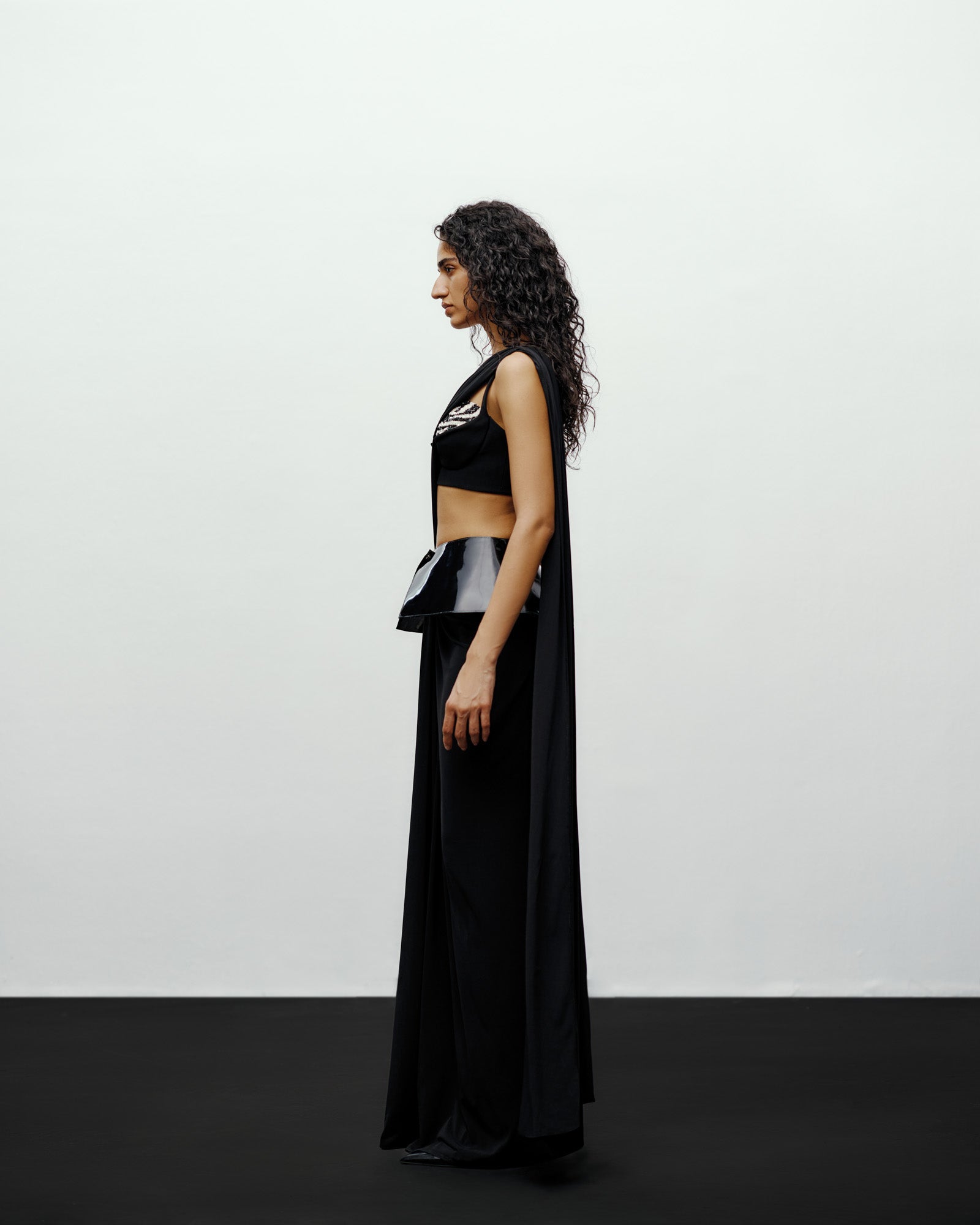 The Eira embroidered Blouse is a statement in contemporary femininity and sculptural design. Crafted with a bold sense of structure, this blouse features a hand-embroidered patterned bust intricately detailed with sequins, embodying the label’s signature craftsmanship and modern sensuality. Creating an artful contrast between softness and edge. The piece is finished with a suiting base that contours the body, blending movement and form with effortless sophistication.