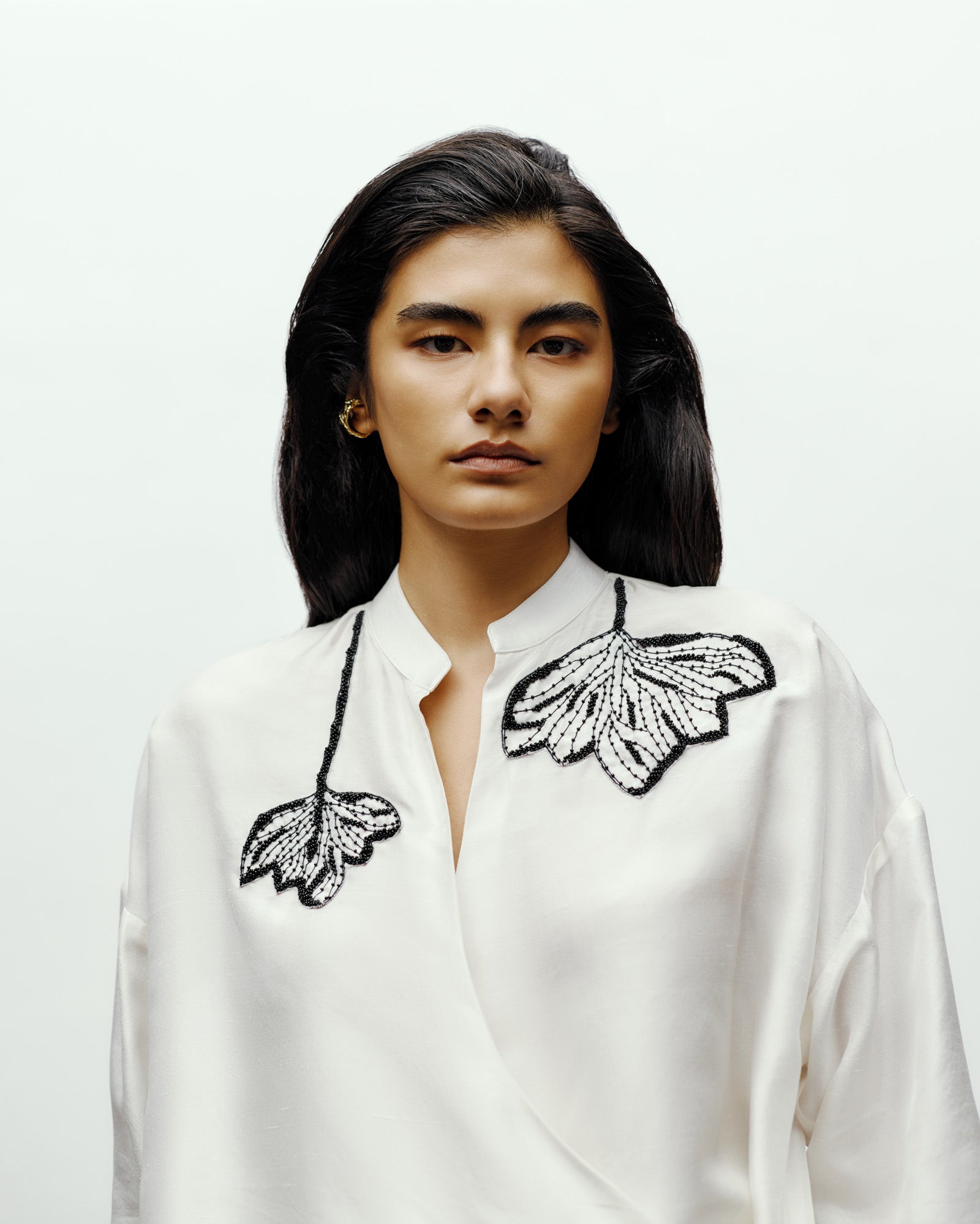Minimalism meets artistry in this embroidered shirt. Crafted from fluid silk, relaxed wrap-style shirt marrying comfort with contemporary elegance. The shirt features a clean, plunging neckline and delicate hand-embroidered Flower appliqués in monochrome tones on the shoulders, offering a signature 431-88 touch of artisanal detail. A subtle tie at the waist cinches the silhouette.
