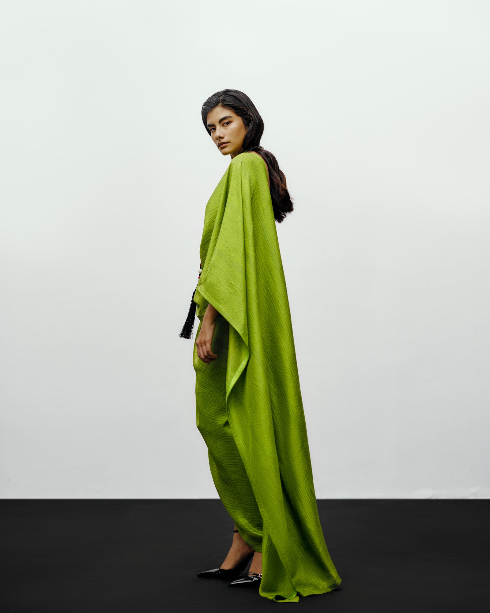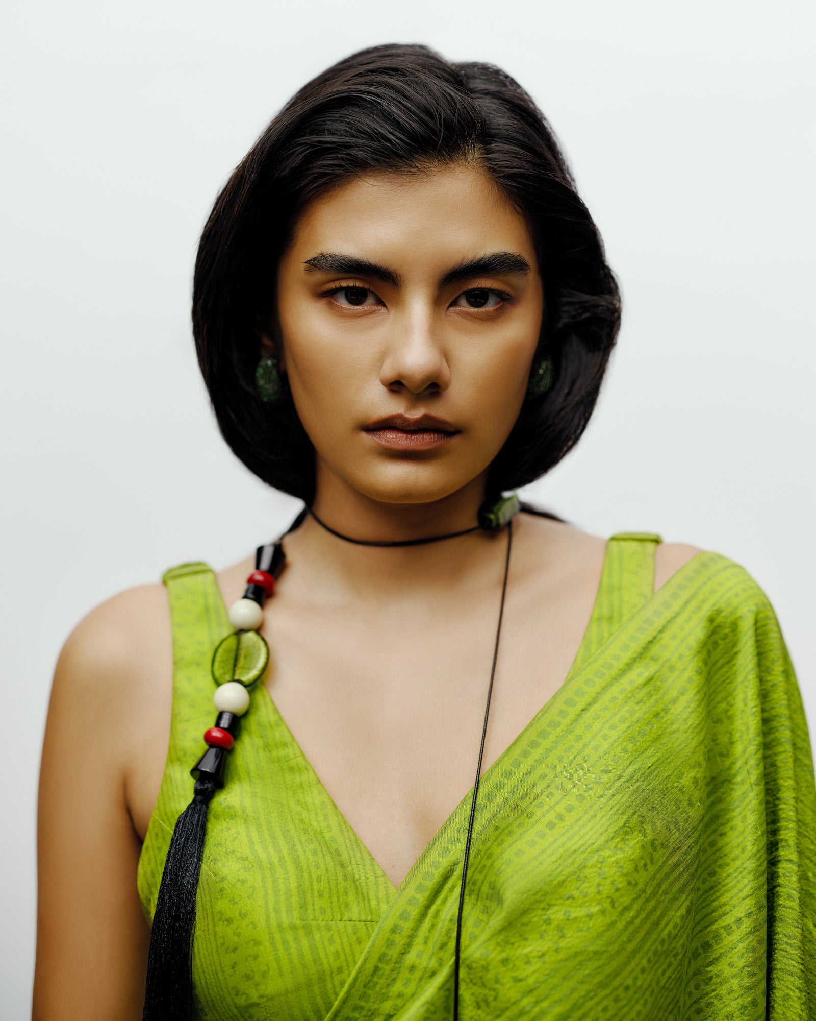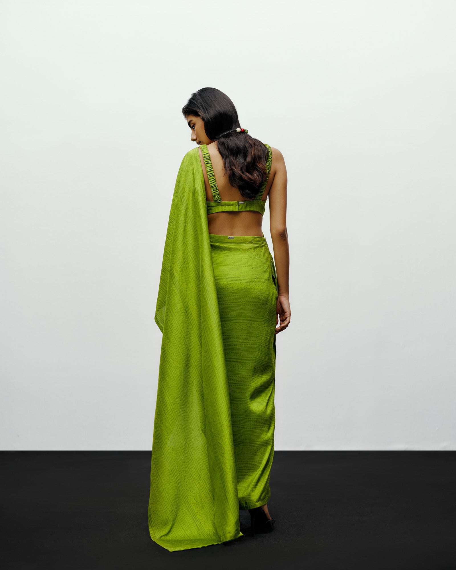 The printed silk blouse in lime green embodies refined sensuality through clean lines and thoughtful construction. Crafted from soft, lustrous silk with a subtle print, this sleeveless blouse offers a modern interpretation of traditional draping. Its deep V-neckline and precise tailoring contour the body effortlessly, allowing for versatile styling — from occasion wear to elevated everyday looks. Perfectly paired with the brand’s signature draped sari or layered under a structured jacket, this blouse transitions seamlessly between contemporary and classic aesthetics.