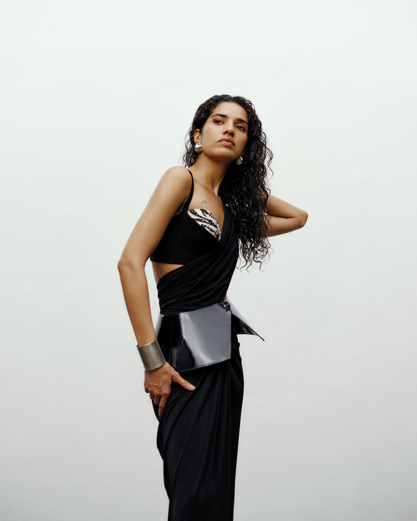 The Knot Sari embodies effortless modern glamour. Crafted in fluid stretch jersey, this contemporary interpretation of the sari blends movement and structure with signature precision draping. The asymmetrical Knot detail on the waist creates a bold, sculptural line, while the fabric’s natural sheen enhances its luxurious depth and flow.