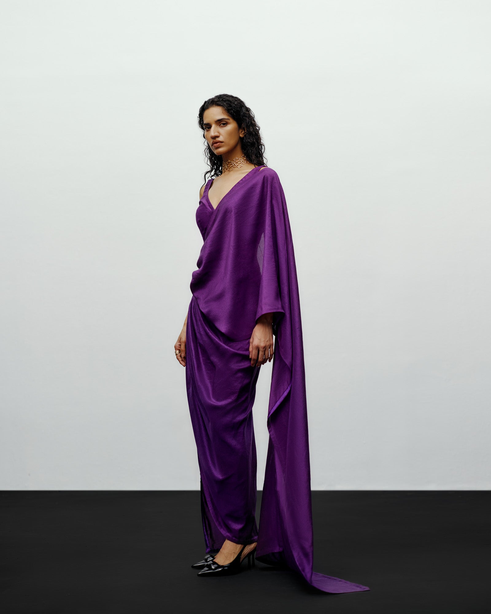 The printed silk blouse in purple embodies refined sensuality through clean lines and thoughtful construction. Crafted from soft, lustrous silk with a subtle print, this sleeveless blouse offers a modern interpretation of traditional draping. Its deep V-neckline and precise tailoring contour the body effortlessly, allowing for versatile styling — from occasion wear to elevated everyday looks. Perfectly paired with the brand’s signature draped sari or layered under a structured jacket, this blouse transitions seamlessly between contemporary and classic aesthetics.