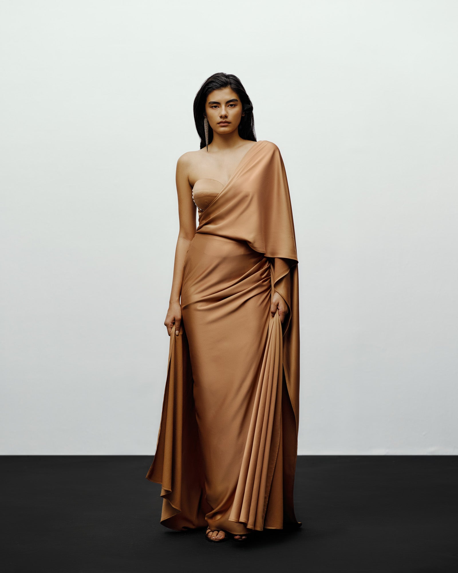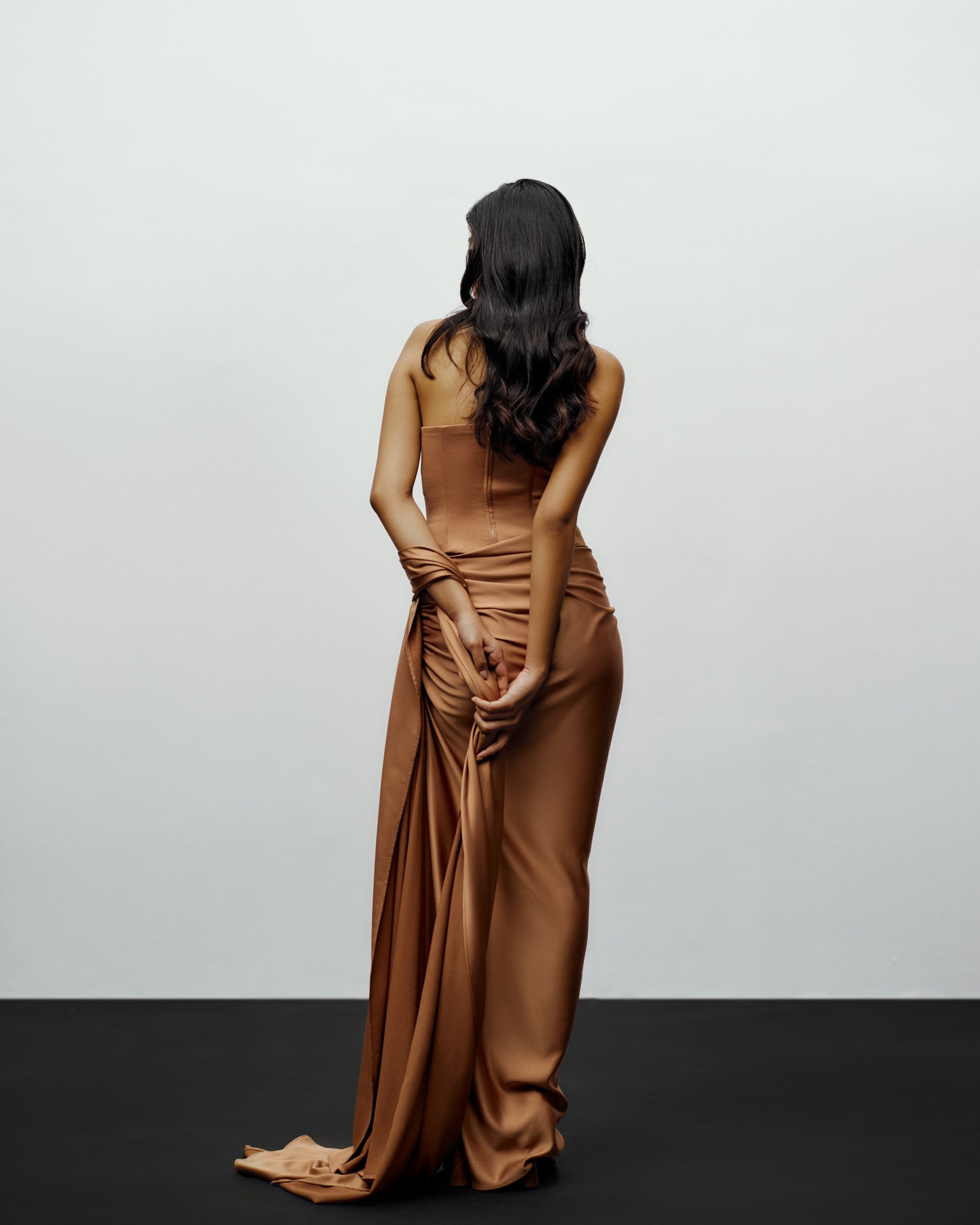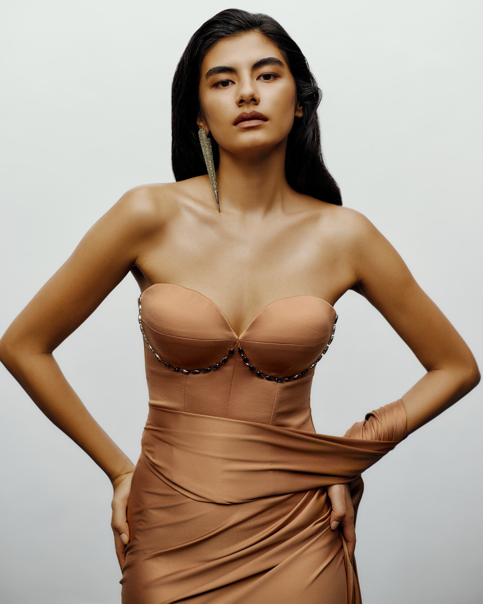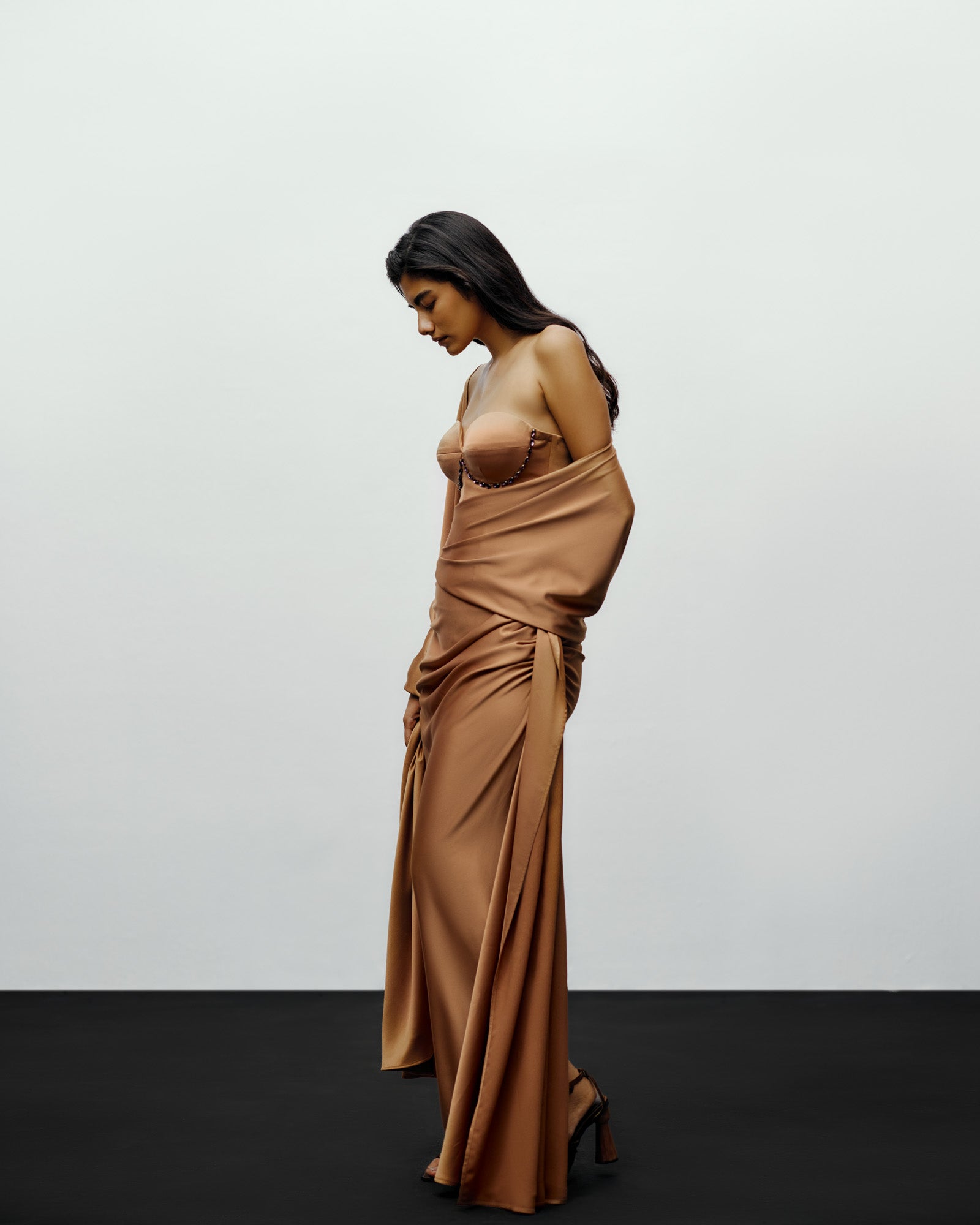 Elevate your wardrobe with our sculpted satin strapless corset, a statement piece designed for bold elegance. Crafted from premium crepe, this corset features a structured sweetheart neckline that beautifully accentuates your silhouette. The fitted bodice includes builtin boning for shape and support, while the subtle embroidery detailing under the bust adds a touch of modern edge and luxury. A sleek back zipper ensures a secure and seamless fit.