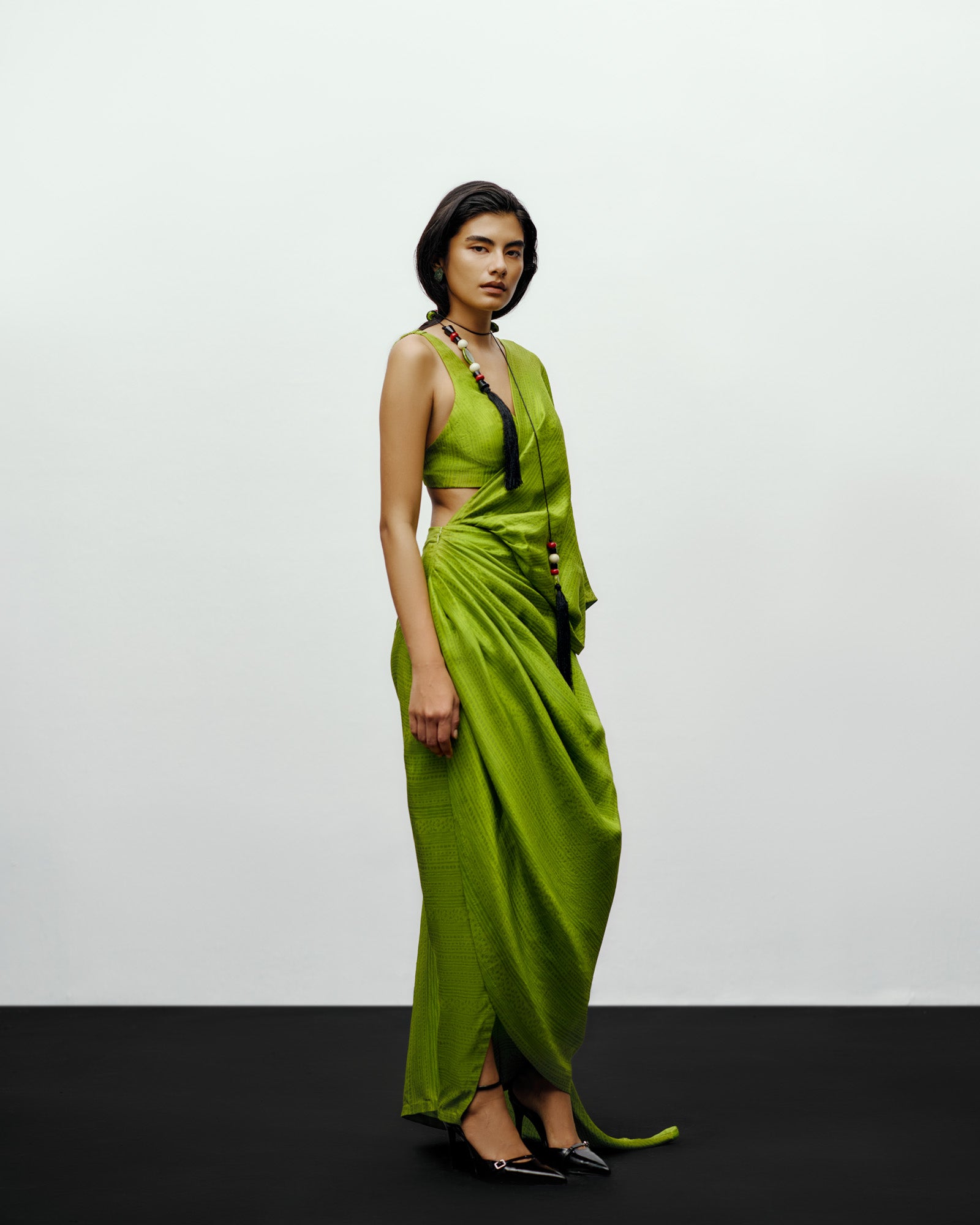 The Mose Sari in lime green redefines modern elegance through fluid structure and bold simplicity. Crafted from luminous silk with a subtle print , the drape accentuates natural movement while maintaining architectural precision. The vibrant lime hue embodies the brand’s contemporary edge, refreshing, refined, and effortlessly sophisticated. This sari is pre-draped for ease of wear and paired with a tonal blouse to highlight its sculptural fall. Designed for the woman who moves seamlessly between tradition and modernity, it merges timeless craftsmanship with a progressive silhouette.