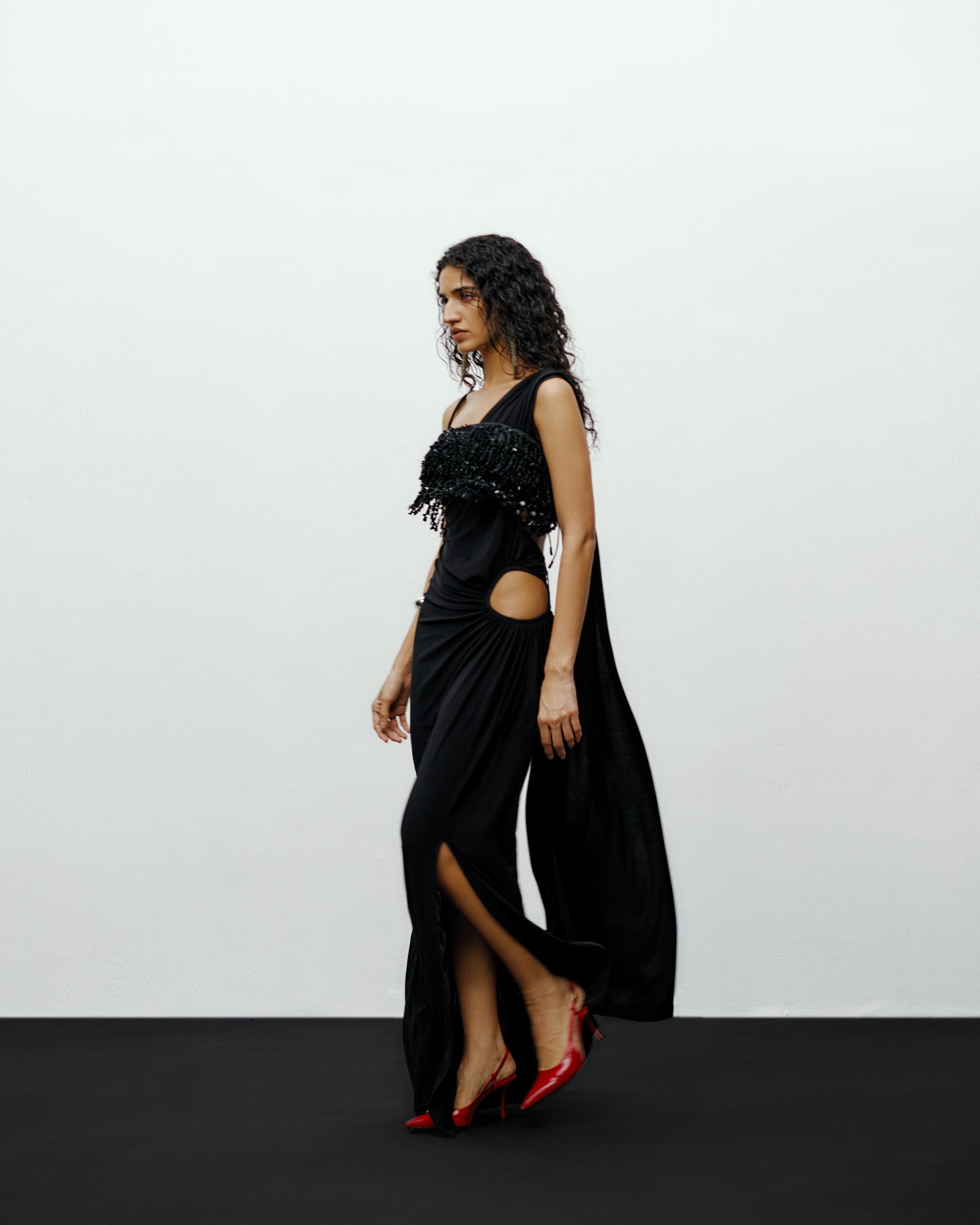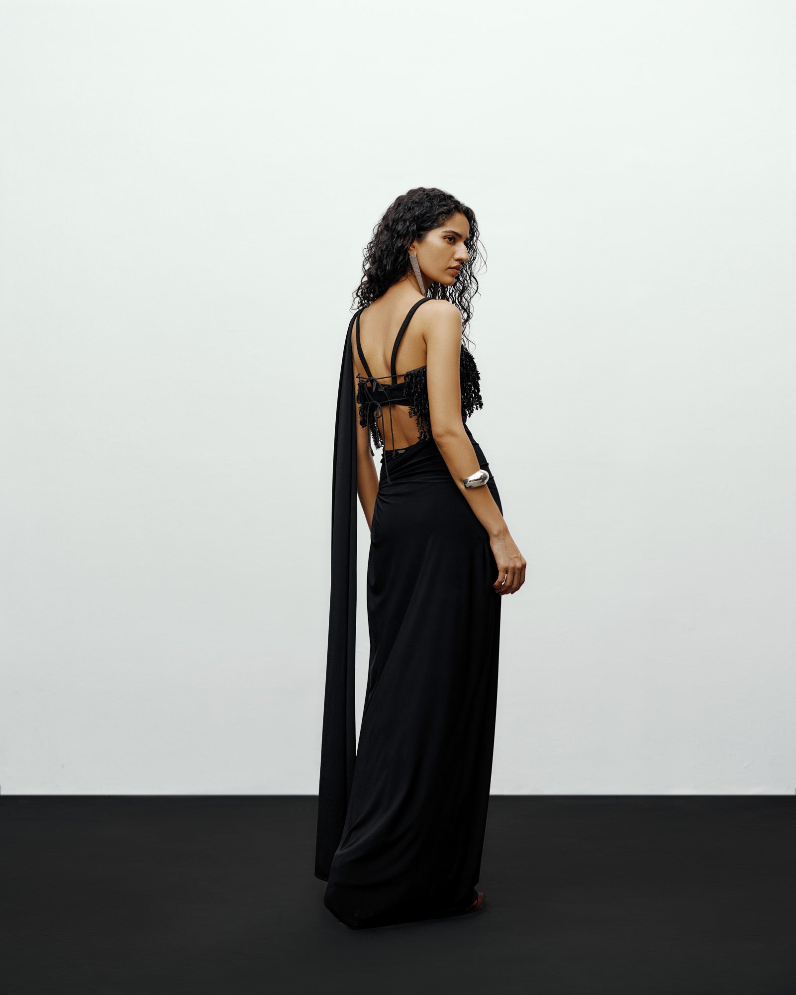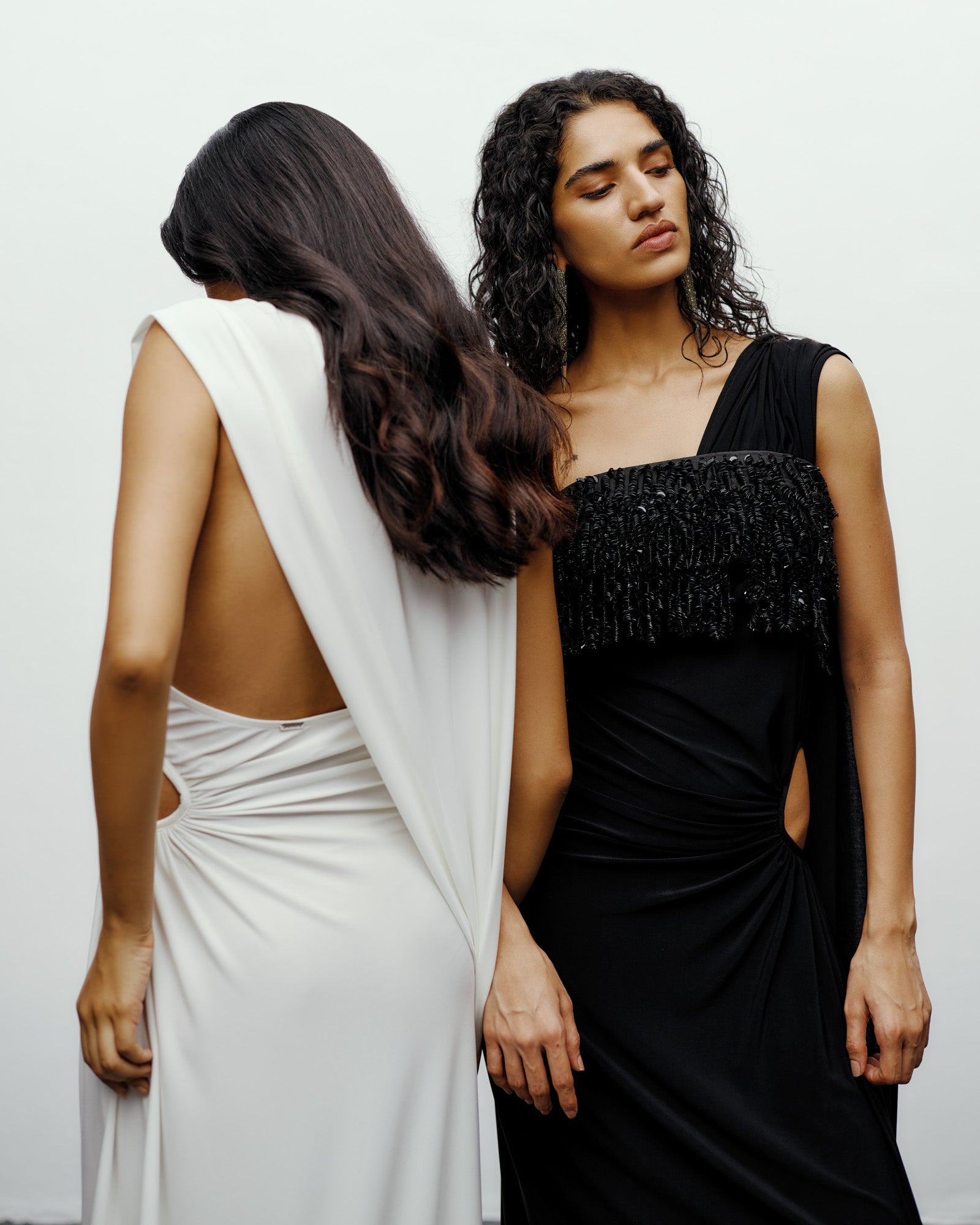 The Mule Sari redefines classic draping through a modern lens. Crafted from fluid stretch jersey, this pre-stitched sari falls effortlessly over the body, creating a sculptural yet relaxed silhouette. The design features an keyhole on side with ruched detailing that frames the shoulders and transitions seamlessly into soft, gathered pleats at the waist, signature elements that balance structure with fluidity. Designed for the contemporary woman, this sari offers ease of movement without compromising on elegance.