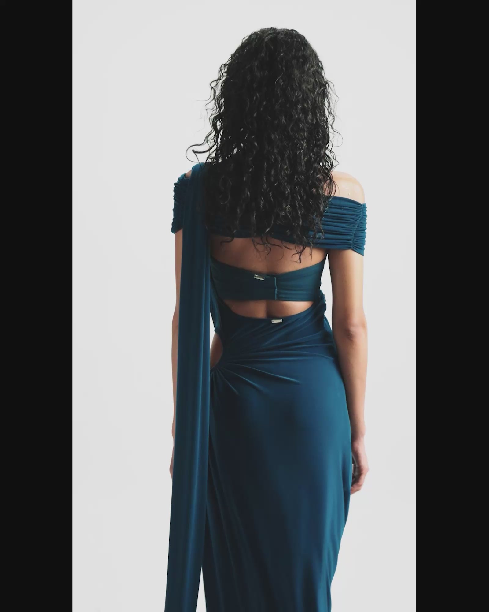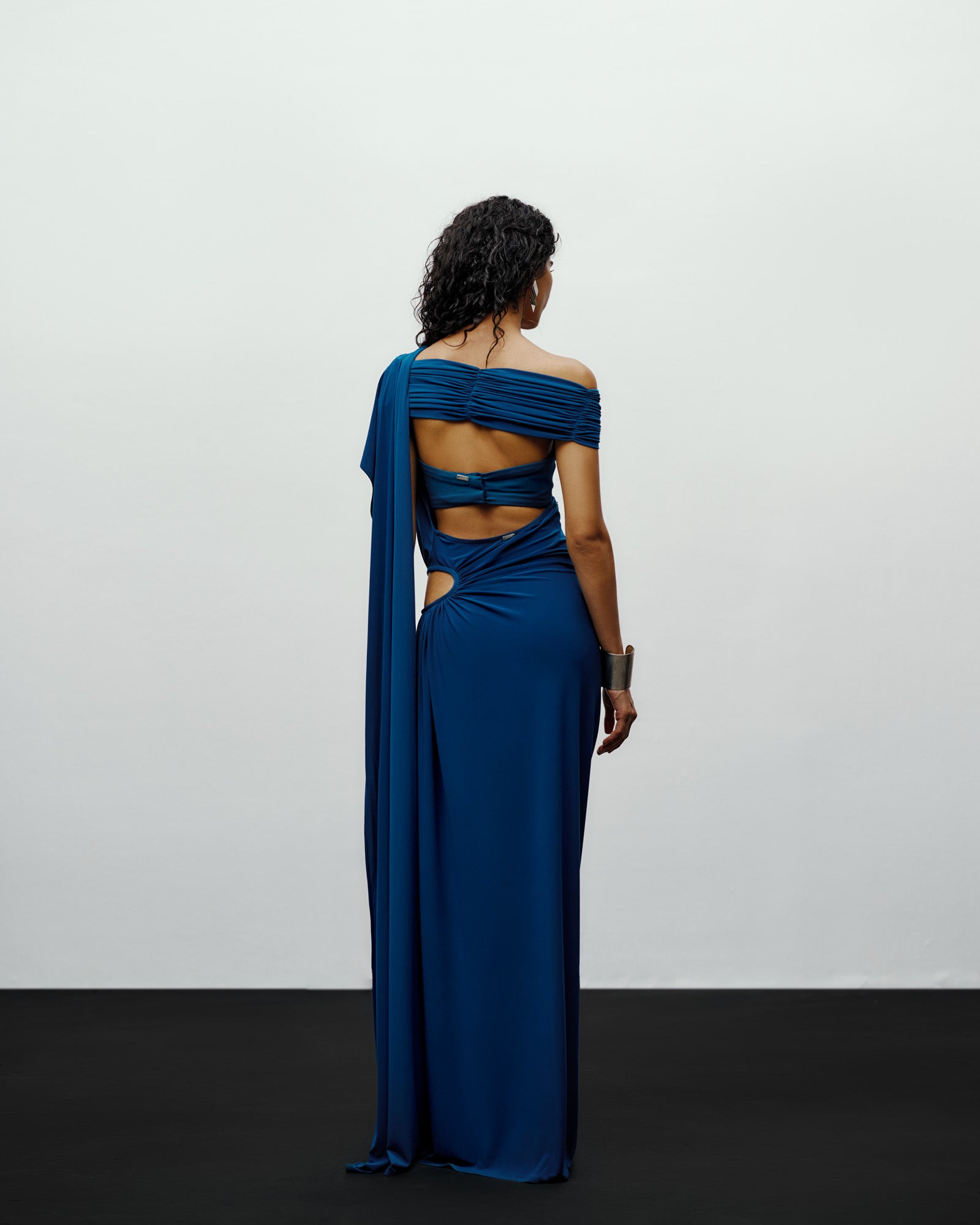 The Mule Sari redefines classic draping through a modern lens. Crafted from fluid stretch jersey, this pre-stitched sari falls effortlessly over the body, creating a sculptural yet relaxed silhouette. The design features an keyhole on side with ruched detailing that frames the shoulders and transitions seamlessly into soft, gathered pleats at the waist, signature elements that balance structure with fluidity. Designed for the contemporary woman, this sari offers ease of movement without compromising on elegance. Its rich teal hue adds depth and sophistication, making it an ideal choice for evening soirées, weddings, or elevated festive occasions.