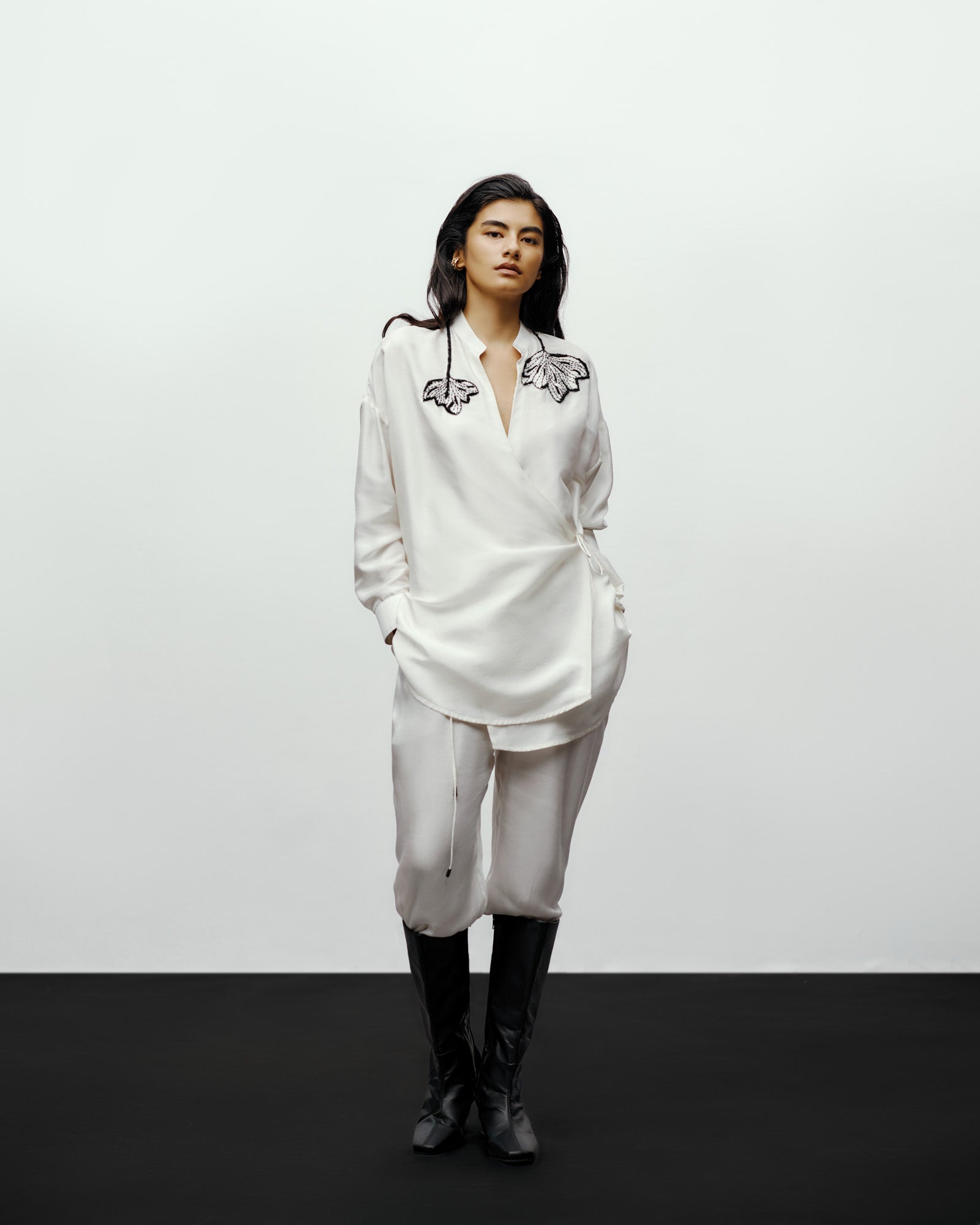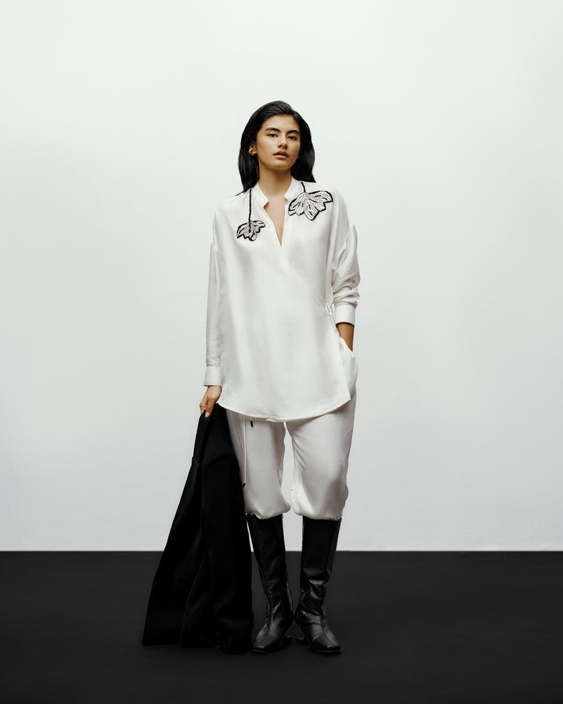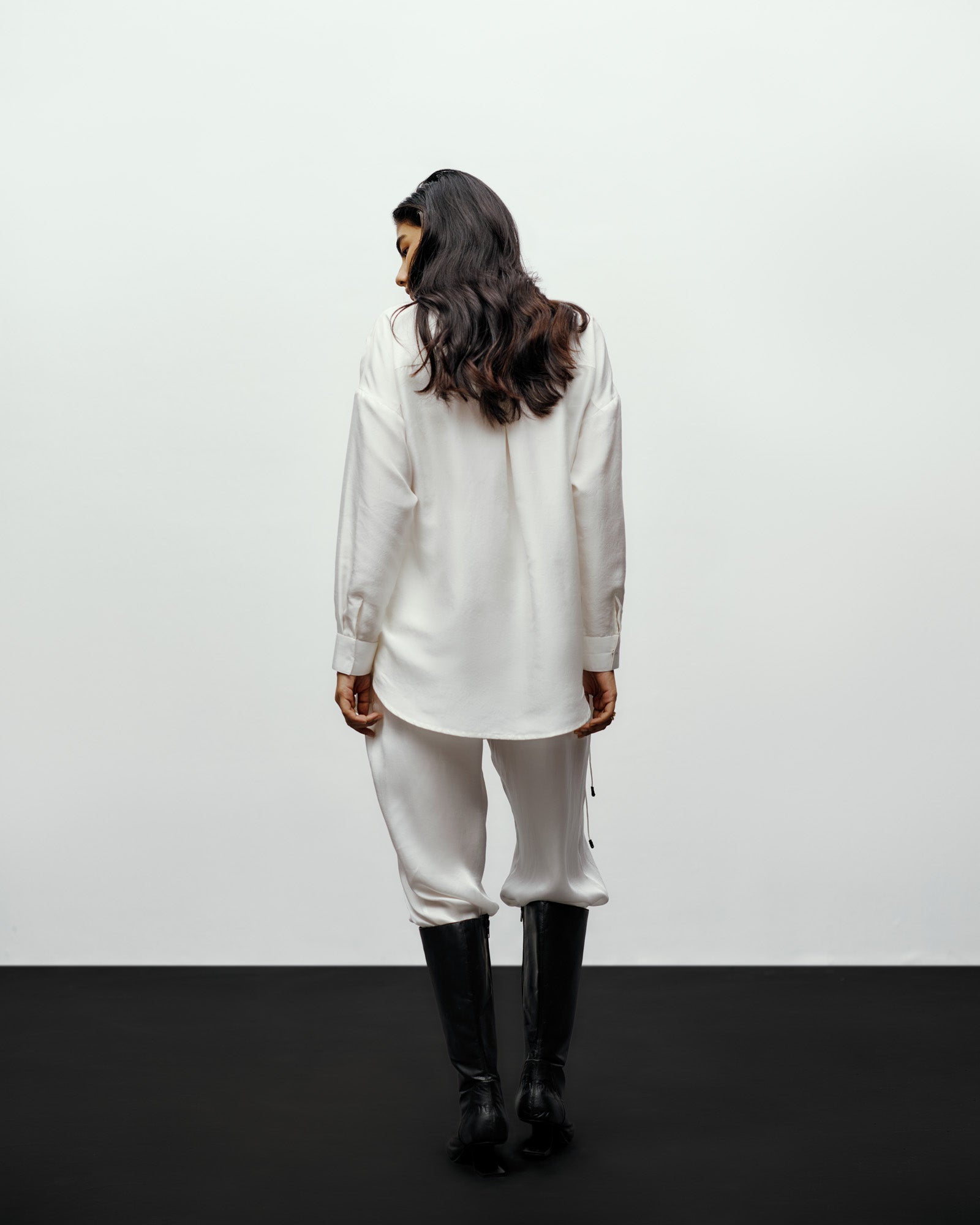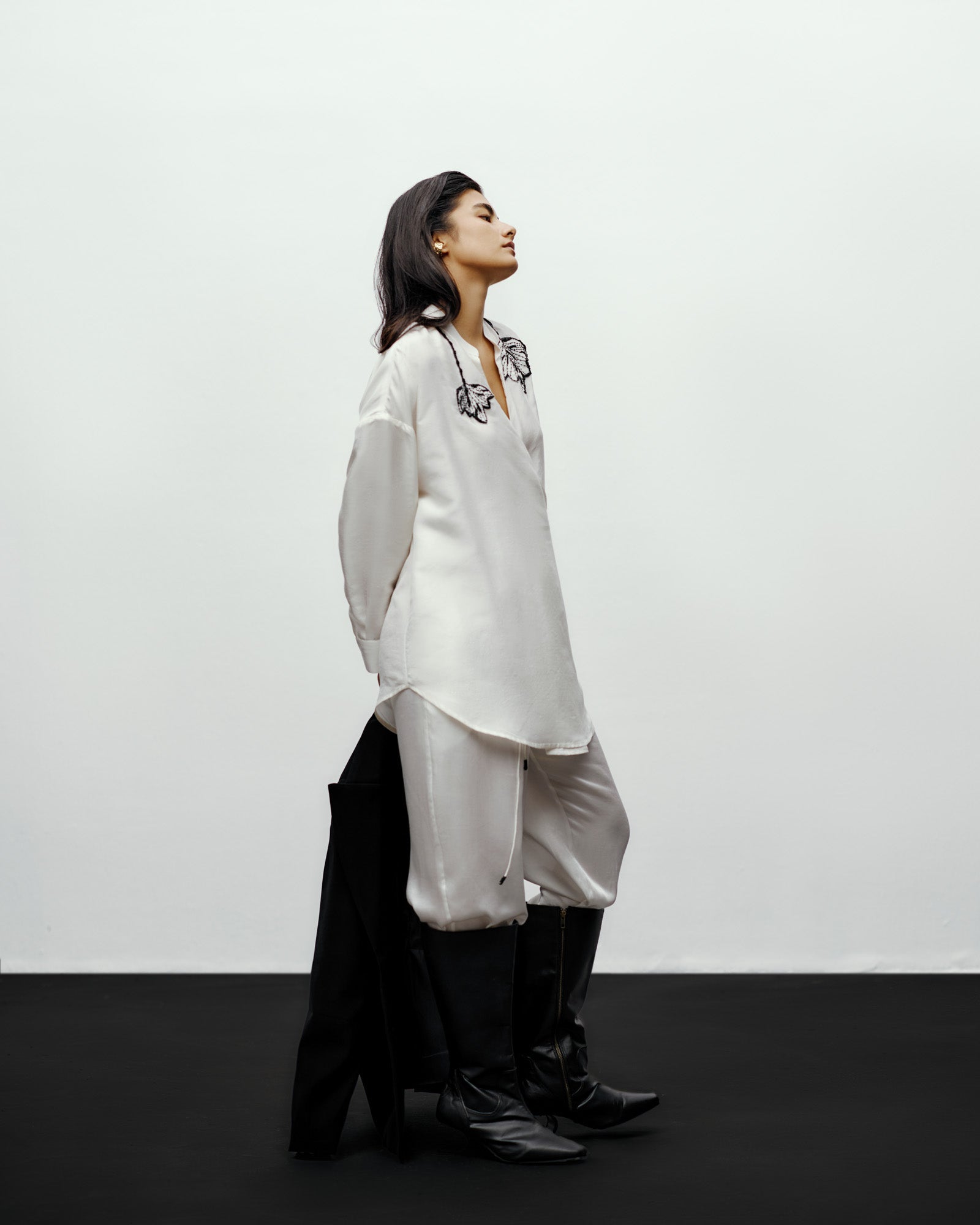 A modern interpretation of power dressing, the PJ Pants by 431-88 redefine sophistication with effortless ease. Crafted from a lightweight silk blend fabric, these pants feature a high-waisted silhouette with soft pleats that flow into a wide-leg design, creating an elongated, fluid structure. Perfect for both structured and relaxed styling, these pants transition seamlessly from day to evening.