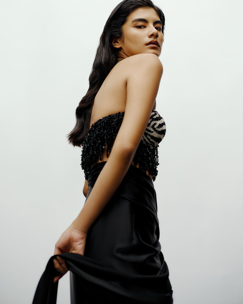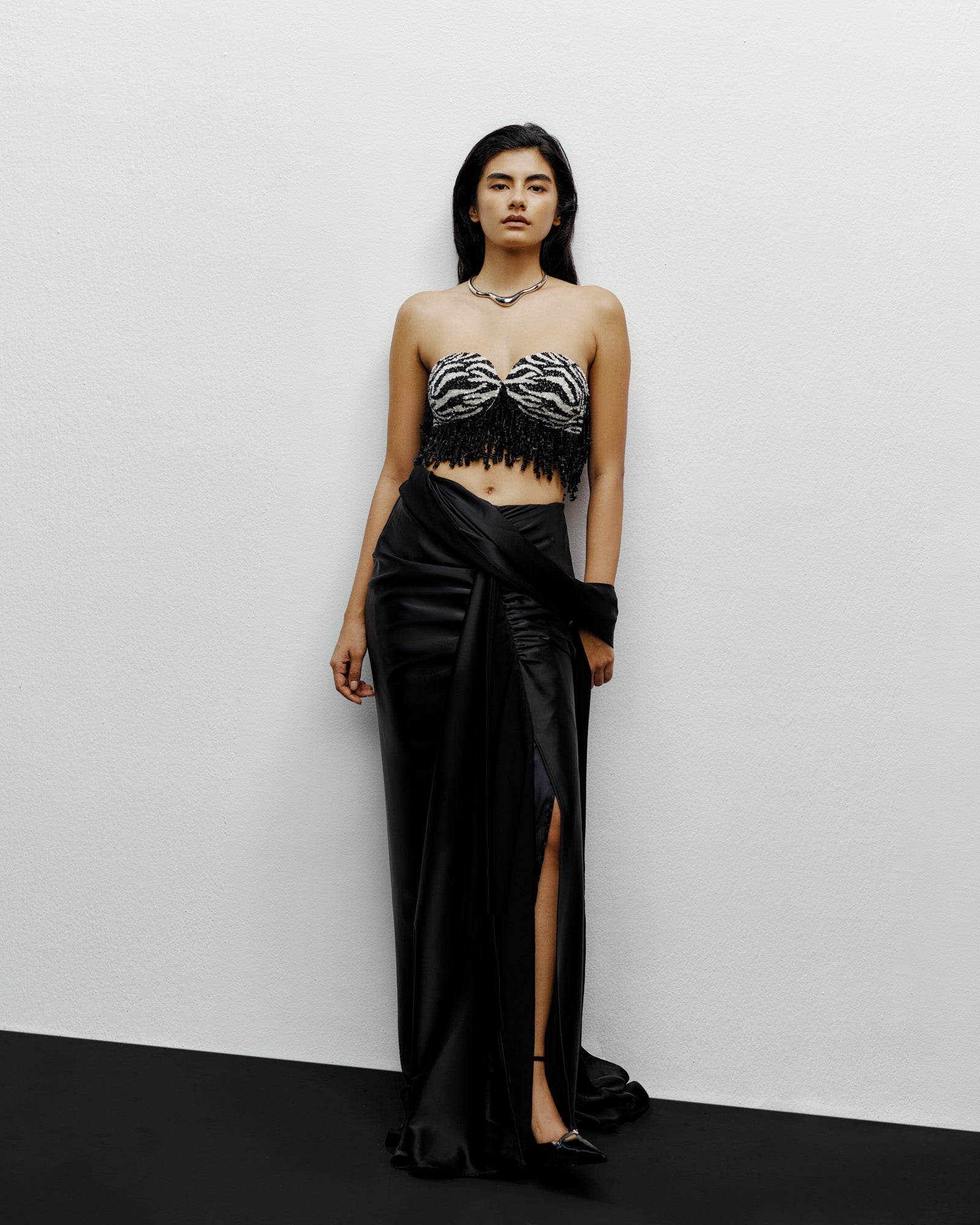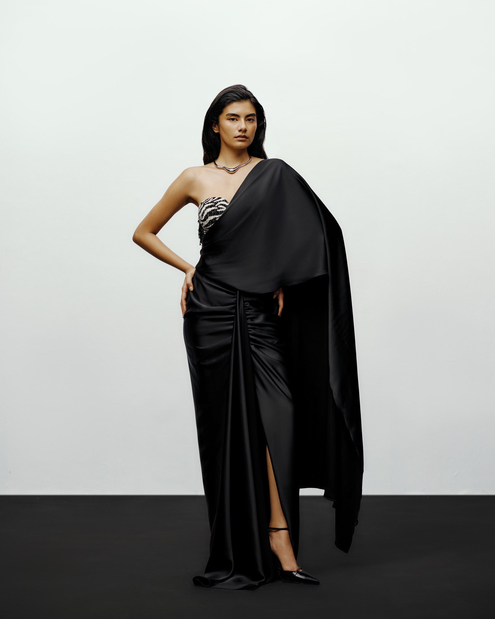 Reimagining the traditional sari through a contemporary lens, the Rimi Sari blends fierce glamour with effortless sophistication. Draped in our signature stretch satin, the pre-stitched sari silhouette hugs the body gracefully while offering fluidity and comfort. The body conturing drape with center pleats, is the perfect pick this season.