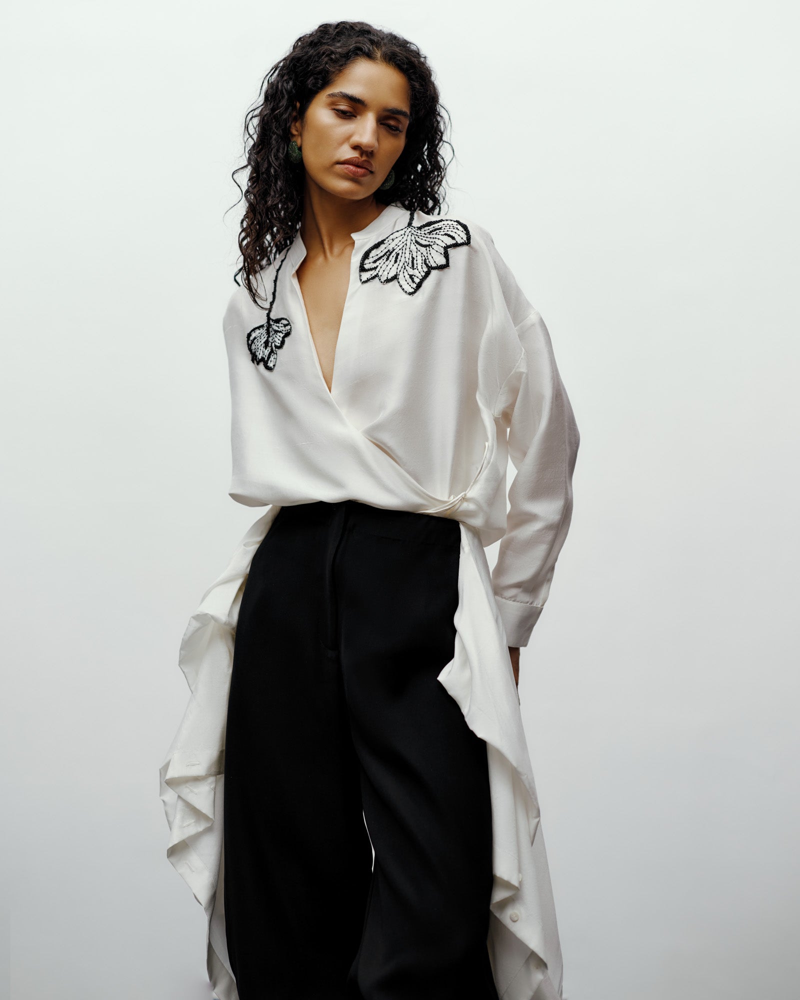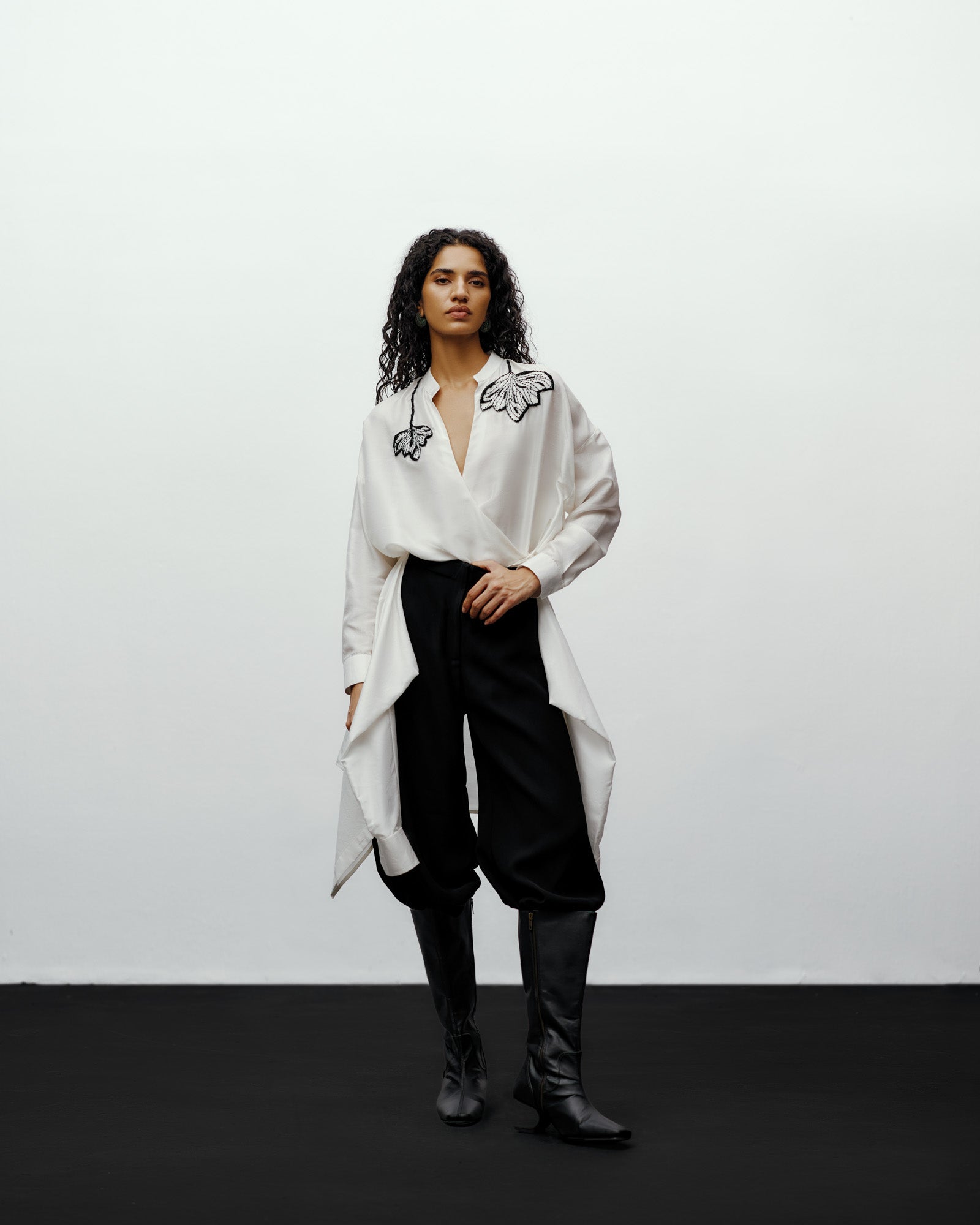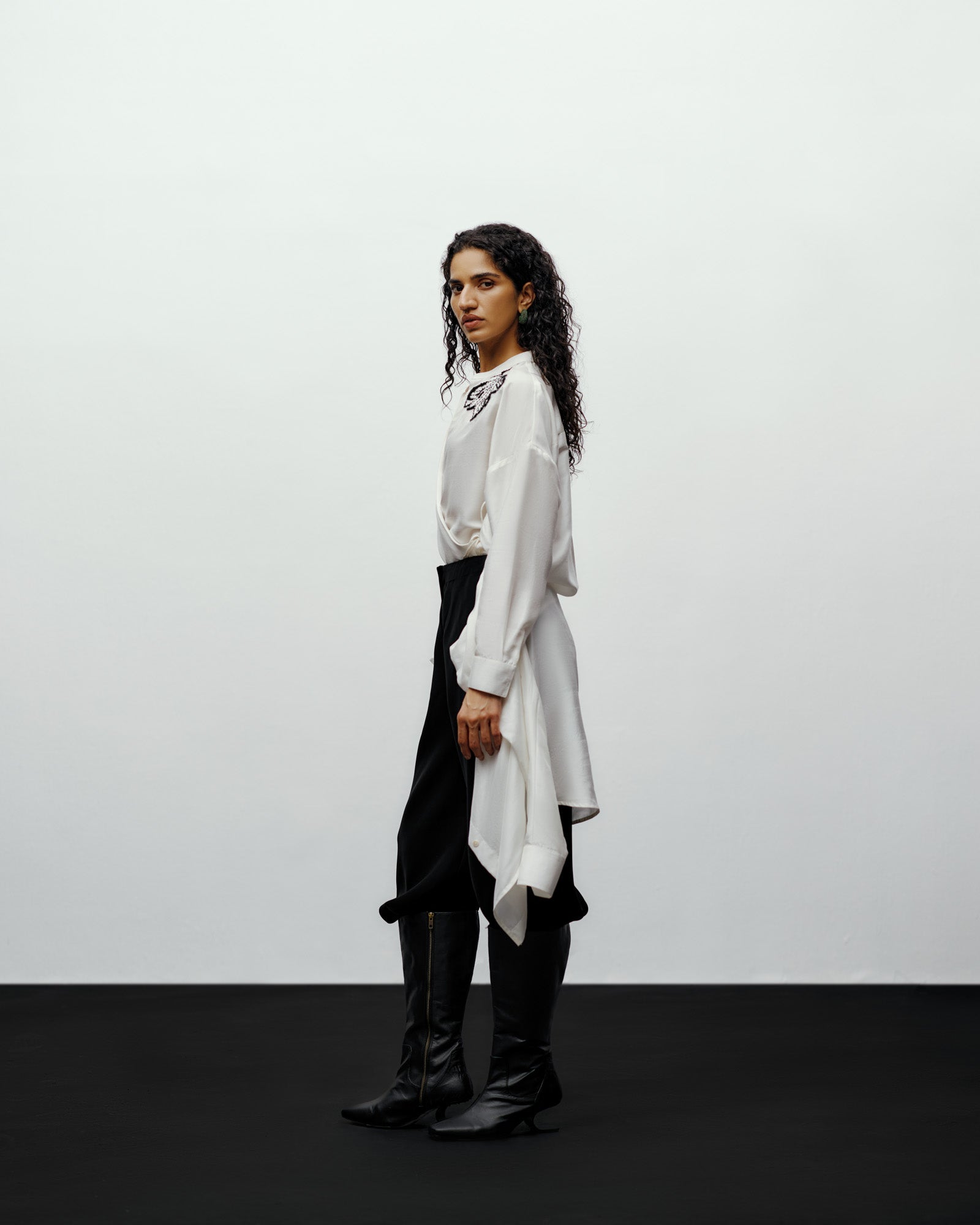 The 431-88 Shirt Pants merge architectural precision with fluid tailoring. Crafted in rich black fabric, the silhouette balances volume and structure, with a sculpted, cocoon-like shape that tapers at the hem for a clean, modern finish. The high-waisted fit offers a flattering frame, while soft pleats and curved seams create natural movement through the leg. The pants have a mock shirt tie-up detail which makes it looks like a complete look already . Finished with a cropped length that pairs effortlessly with boots or heels, these pants redefine everyday elegance with a contemporary edge.