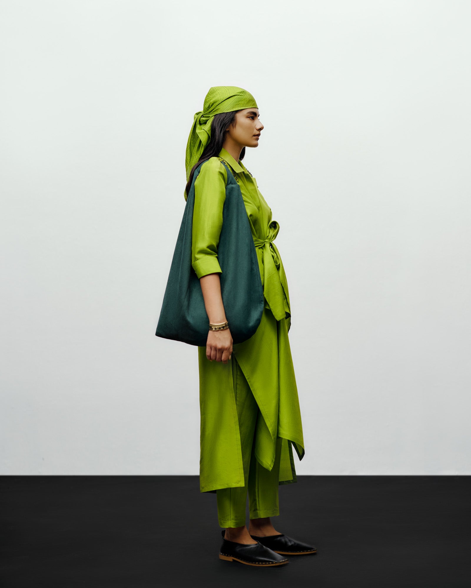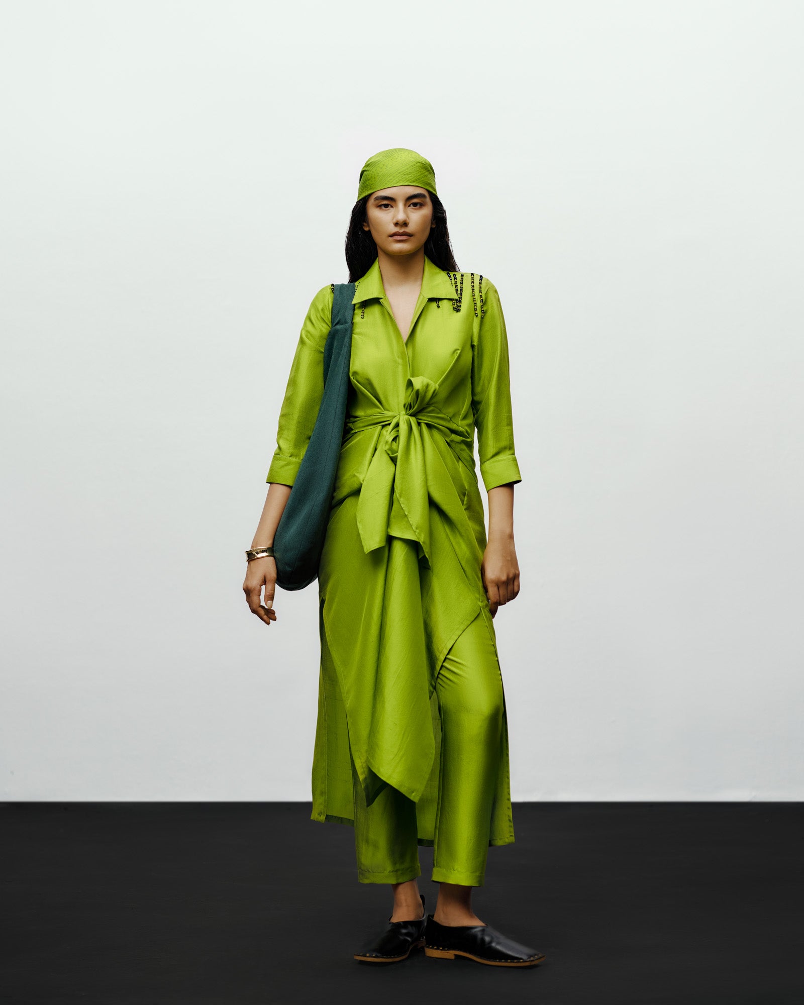 The Tancy Kurta Set in lime green redefines contemporary tailoring. Crafted from lustrous silk in a subtle print, this kurta features a front-tie silhouette that cinches at the waist, creating a sculptural drape that flatters every form, with tassels on shoulder. Designed with a collared neckline and extended front panels, it transitions effortlessly from daywear to evening sophistication. The lightweight sheen and asymmetric hemline lend a sense of movement and understated luxury with comfortable pants — a modern interpretation of effortless polish.