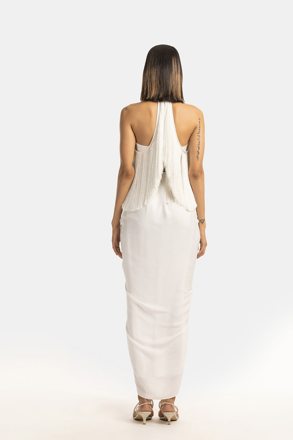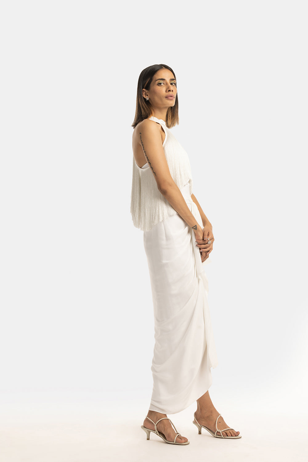 A halter neck style Halter Fringe Top with a layer of fringe. A fun and flirty piece that moves with you. Pair it with the draped skirt or saris for a festive look.