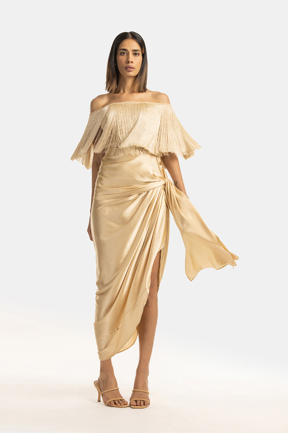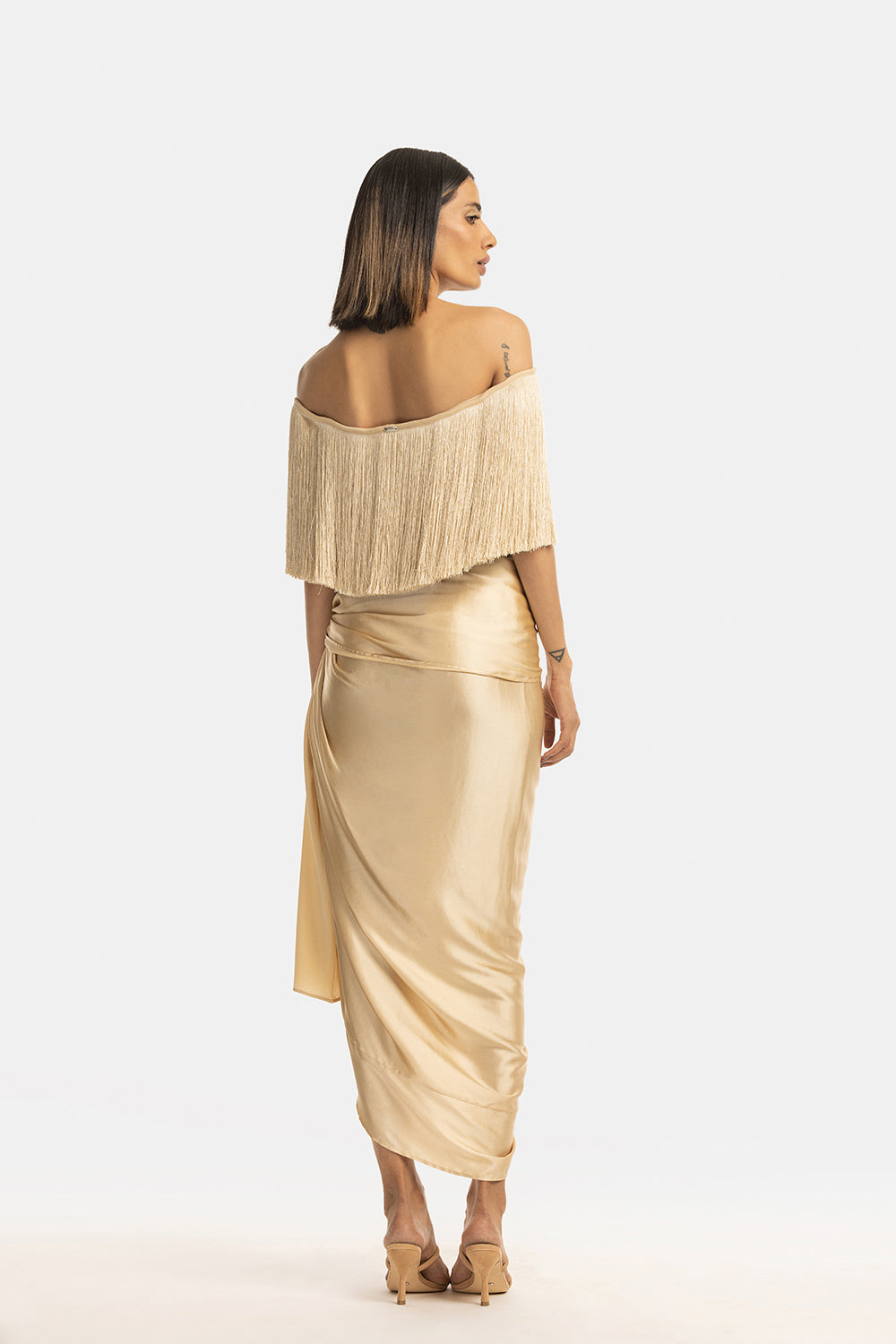 Our bestseller fringe top that has an off shoulder silhouette. Cut in stretch crepe, the base fits well on the body and the fringe moves with you. Pair it with our draped saris or skirts.