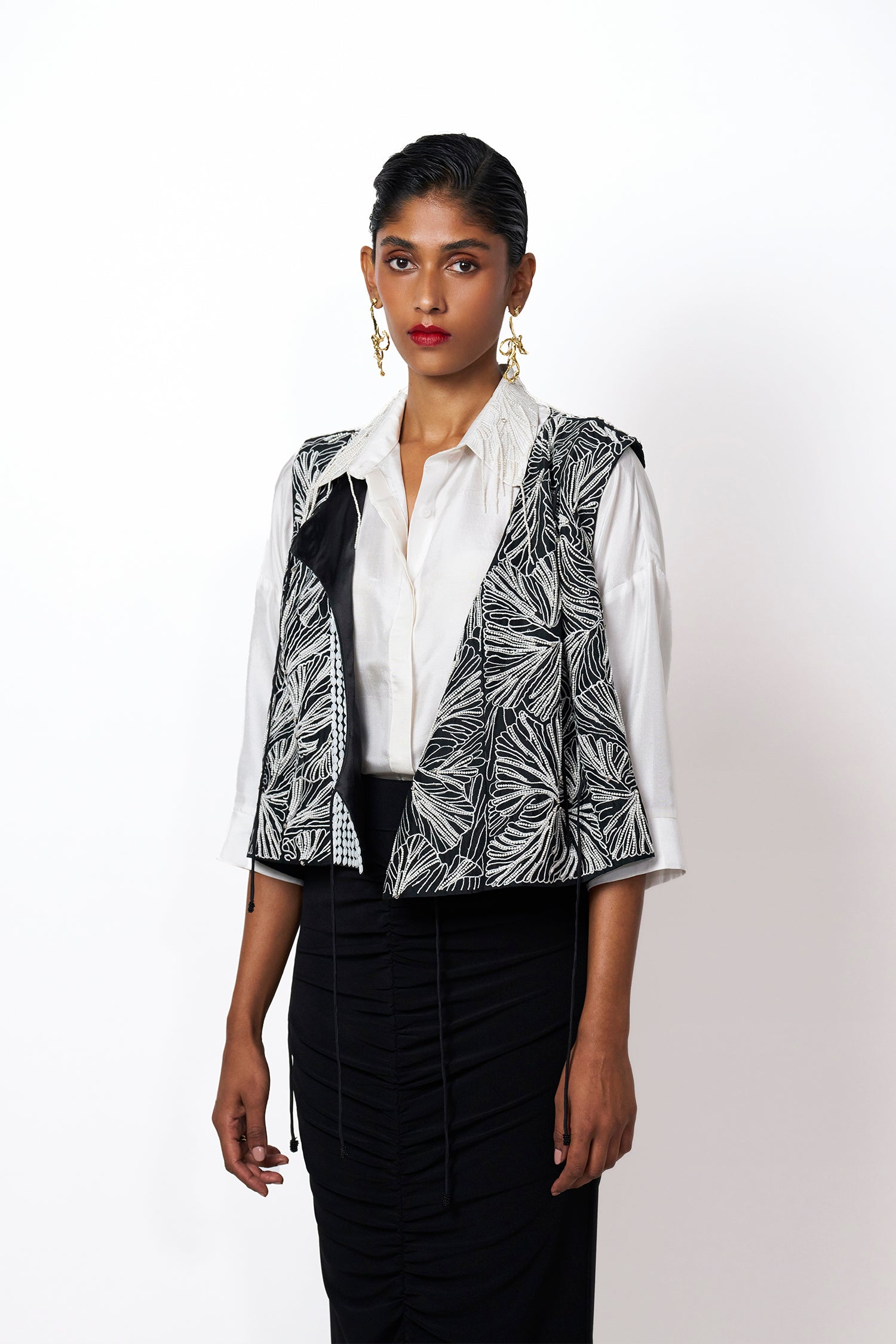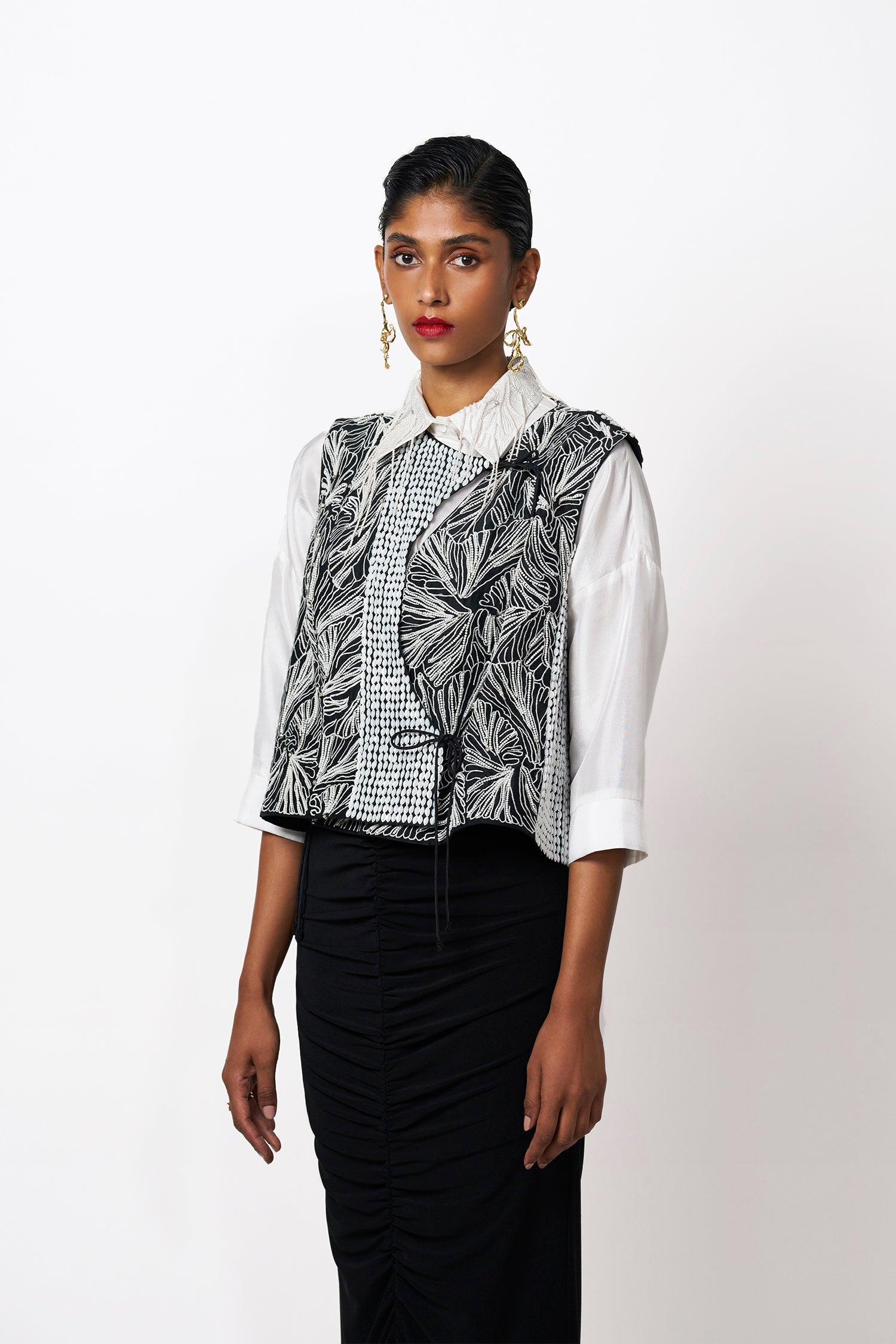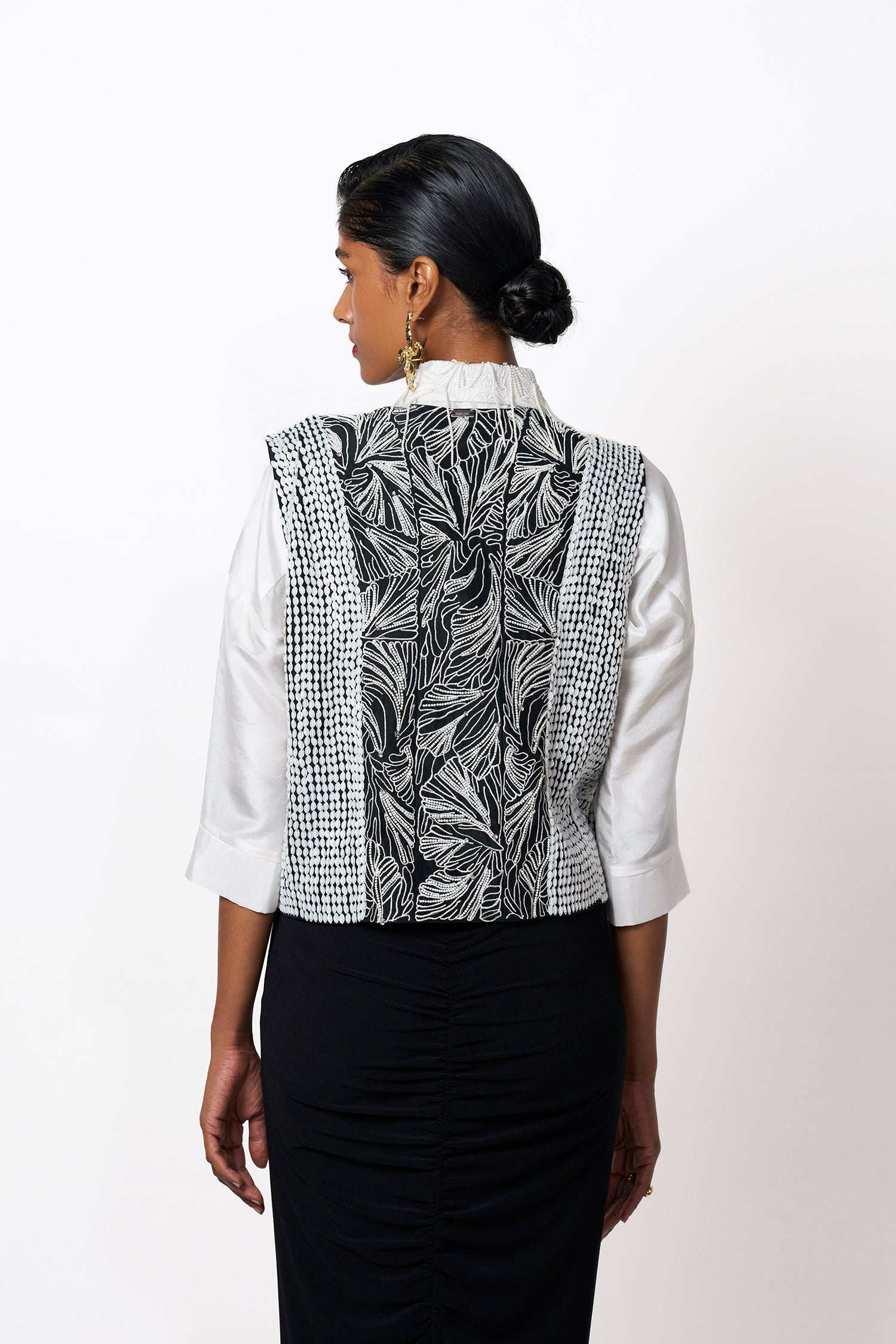The 88 Angrakha is a signature piece in the collection, showcasing a blend of hand and machine embroidery. This sleeveless garment is expertly tailored for a flattering fit, featuring meticulously crafted embroidery panels. Designed with a round neckline, it fastens at the front with doris. Ideal for layering over a shirt or a blouse.