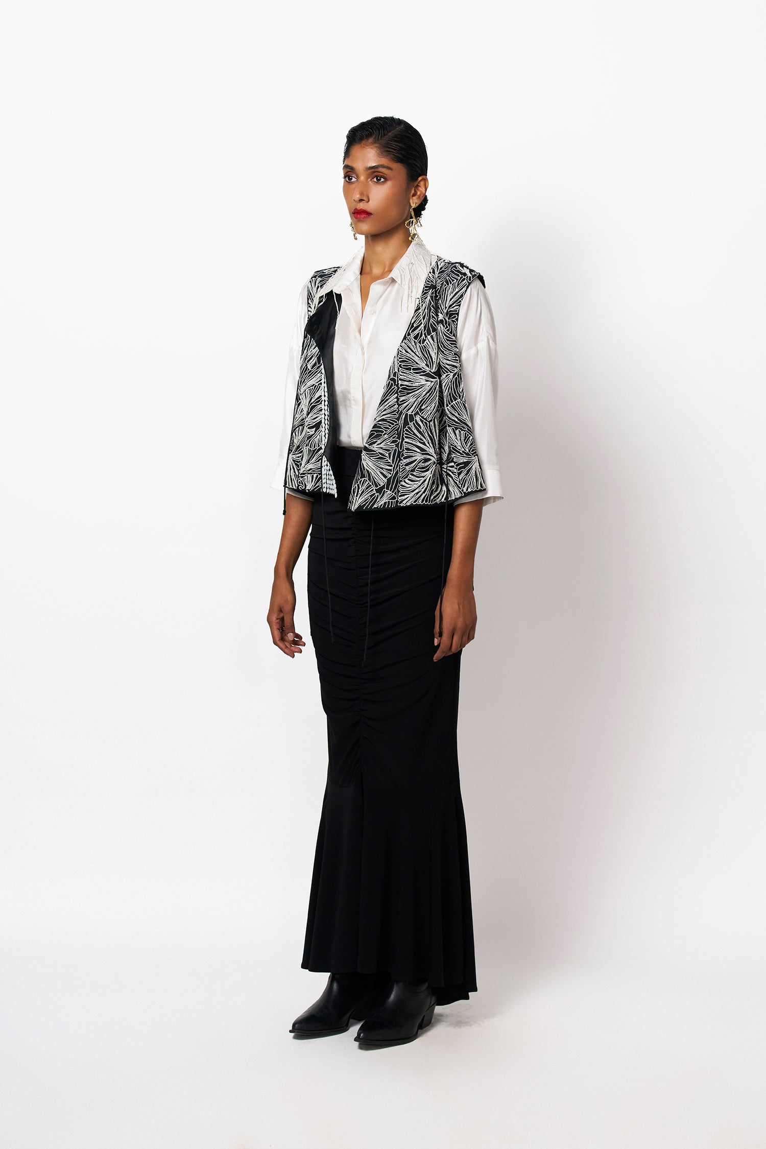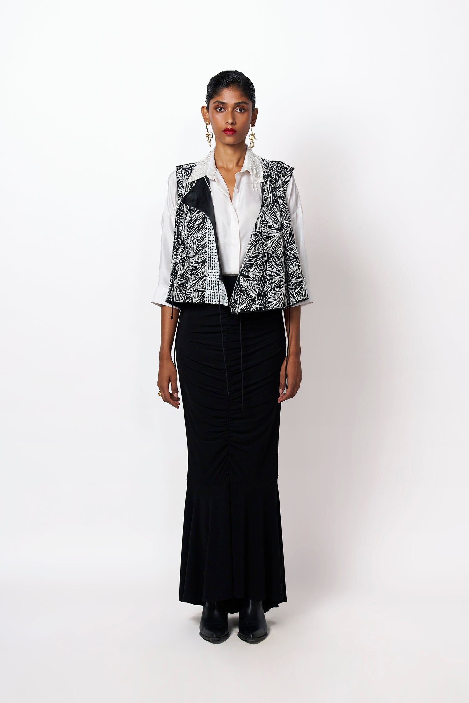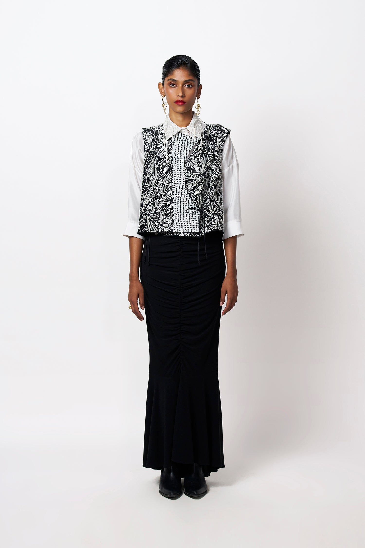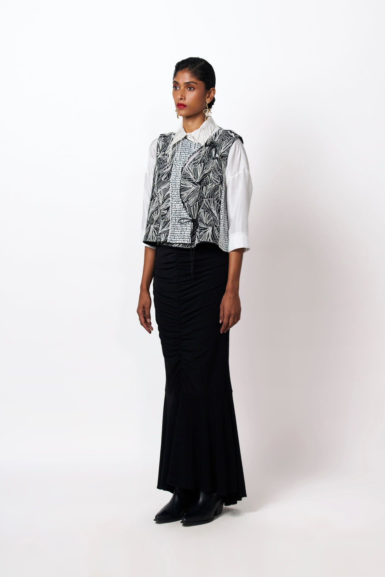 The 88 Angrakha is a signature piece in the collection, showcasing a blend of hand and machine embroidery. This sleeveless garment is expertly tailored for a flattering fit, featuring meticulously crafted embroidery panels. Designed with a round neckline, it fastens at the front with doris. Ideal for layering over a shirt or a blouse.