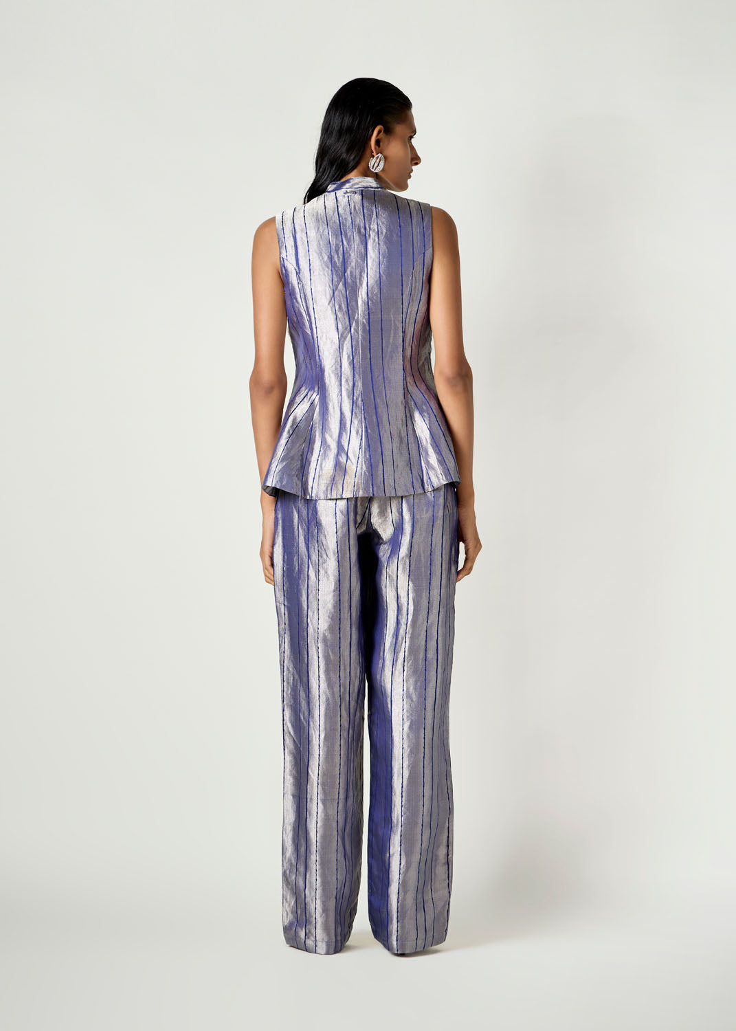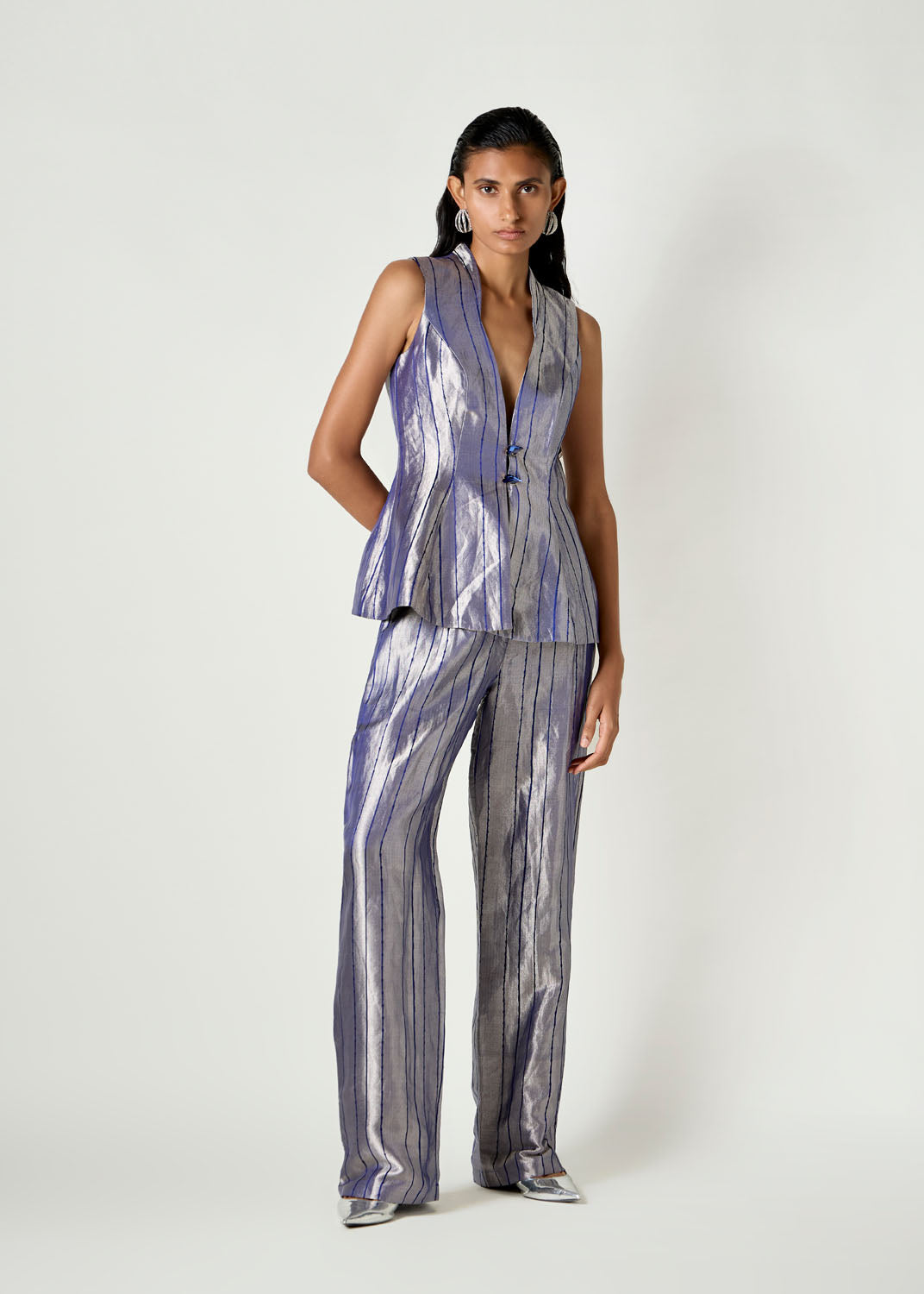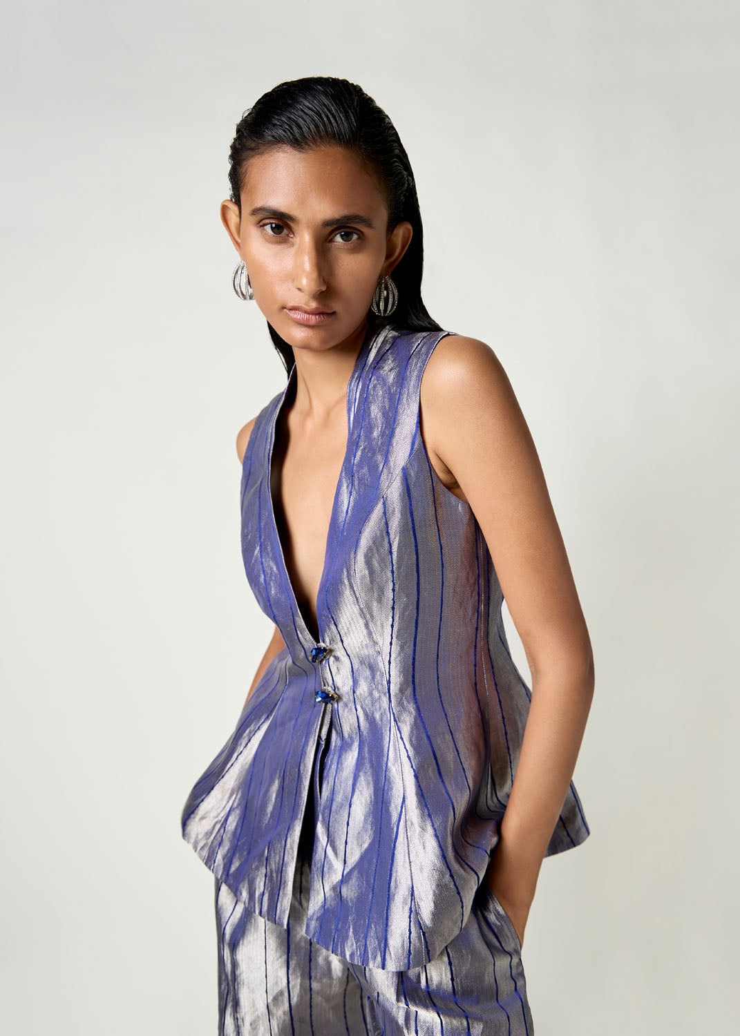 The Andy Blazer is a tailored sleeveless blazer with a flared peplum bottom. It has a thin round collar and a deep neckline and closes in the front with loops and maxi crystal buttons.