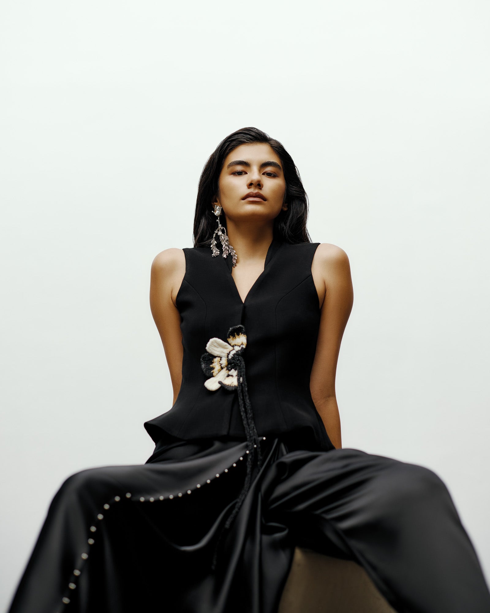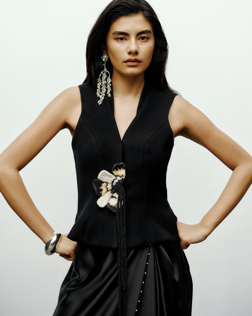 Sculptural elegance meets artisanal detailing in the 431-88 embellished black structured jacket. Tailored to perfection, this sleeveless piece features a clean, contoured silhouette that flatters the form while exuding quiet strength and sophistication. At its center, a hand-beaded floral applique in soft ivory, beige, and black tones adds a touch of intricate artistry—each bead meticulously placed to create a three-dimensional Flower. The subtle shaping at the hem enhances movement, maintaining a balance between precision and fluidity.