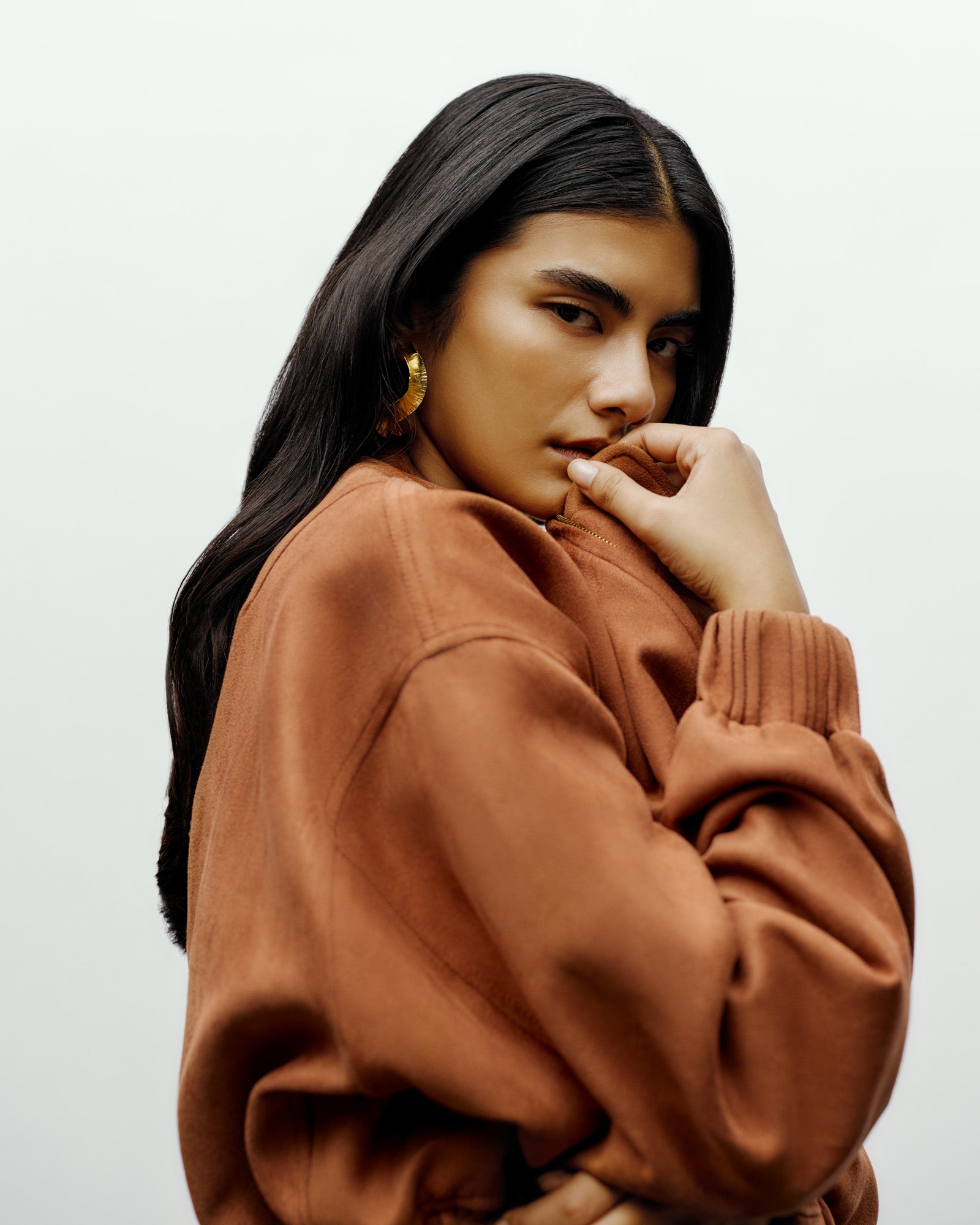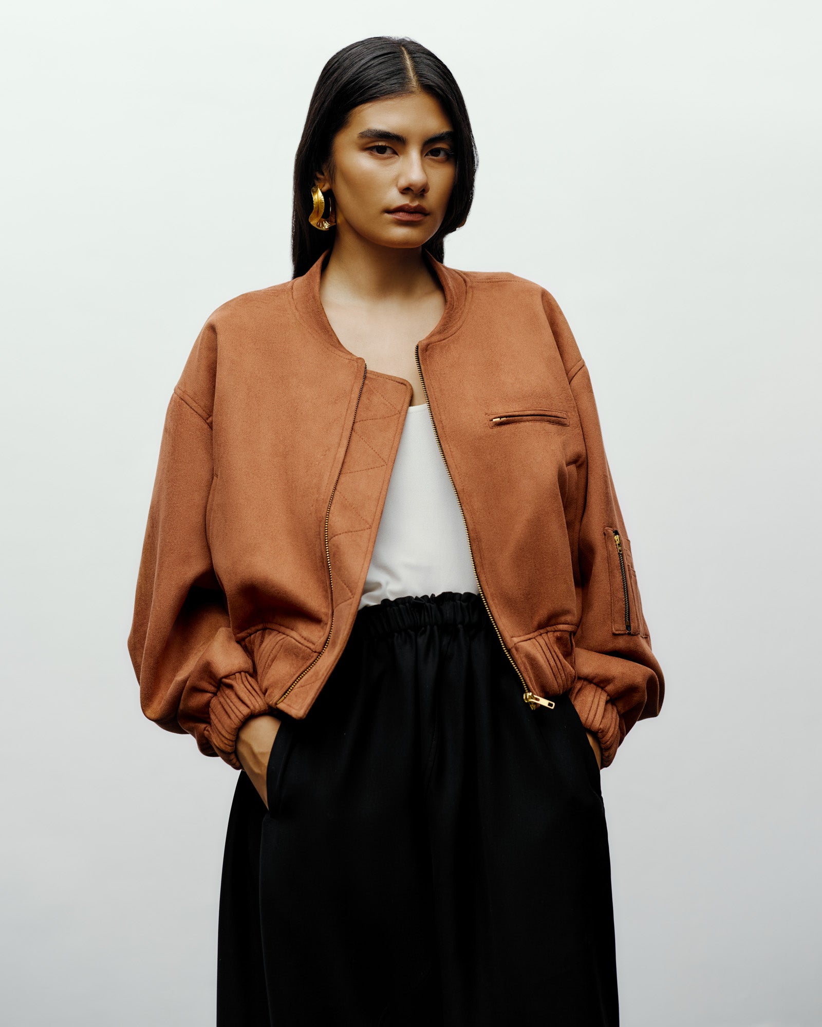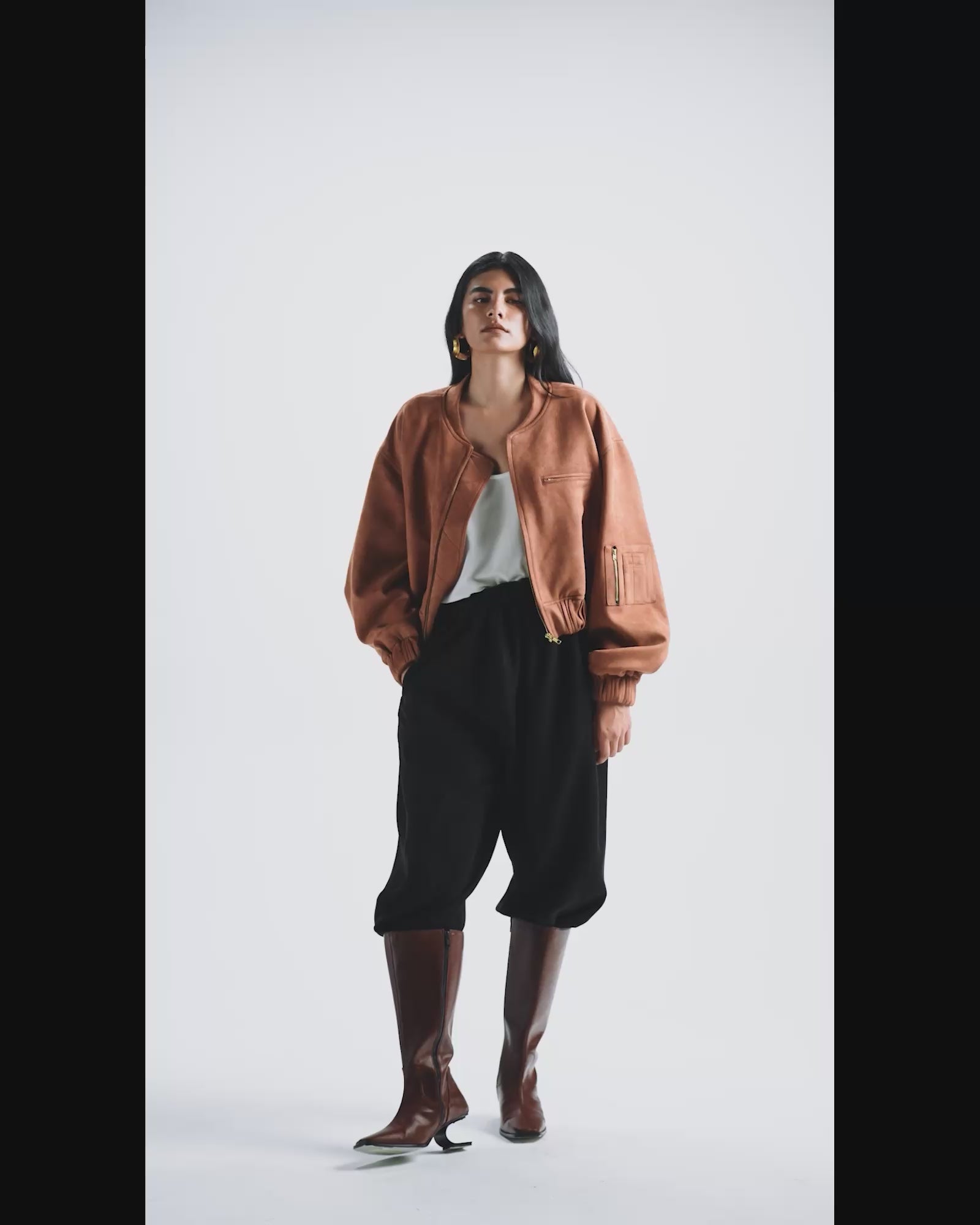 The suede Bomber Jacket redefines utilitarian minimalism with a refined, sculptural edge. Crafted from soft faux suede, this jacket offers a structured yet fluid silhouette, creating a perfect contrast against the brand’s signature draped separates. The boxy fit, exaggerated sleeves, and gold-tone zipper details lend a touch of modern luxury while maintaining effortless wearability. Layered over bold hues or monochrome foundations, this jacket adds dimension, texture, and quiet confidence to any look, a true 431-88 essential for transitional dressing.