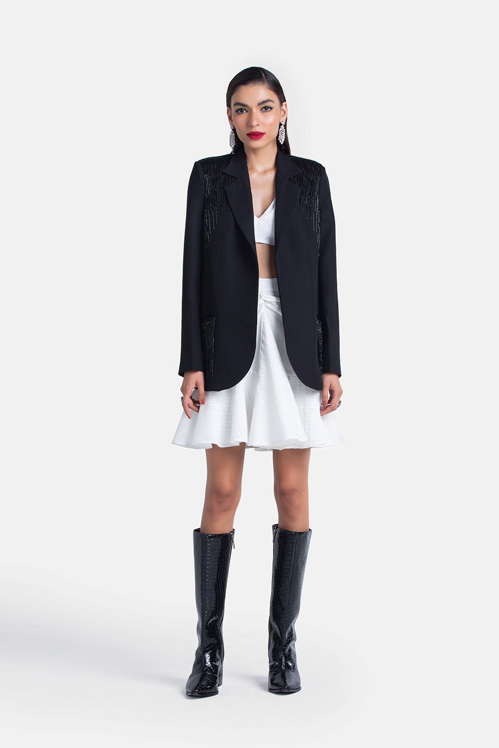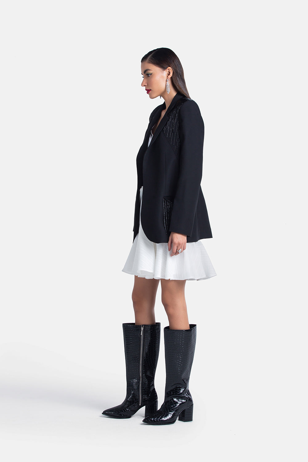 When formal meets fun. Our classic Dinner Blazer, hand embroidered with our signature streamline embroidery, is that one piece that you can throw over every Little Black Dress.