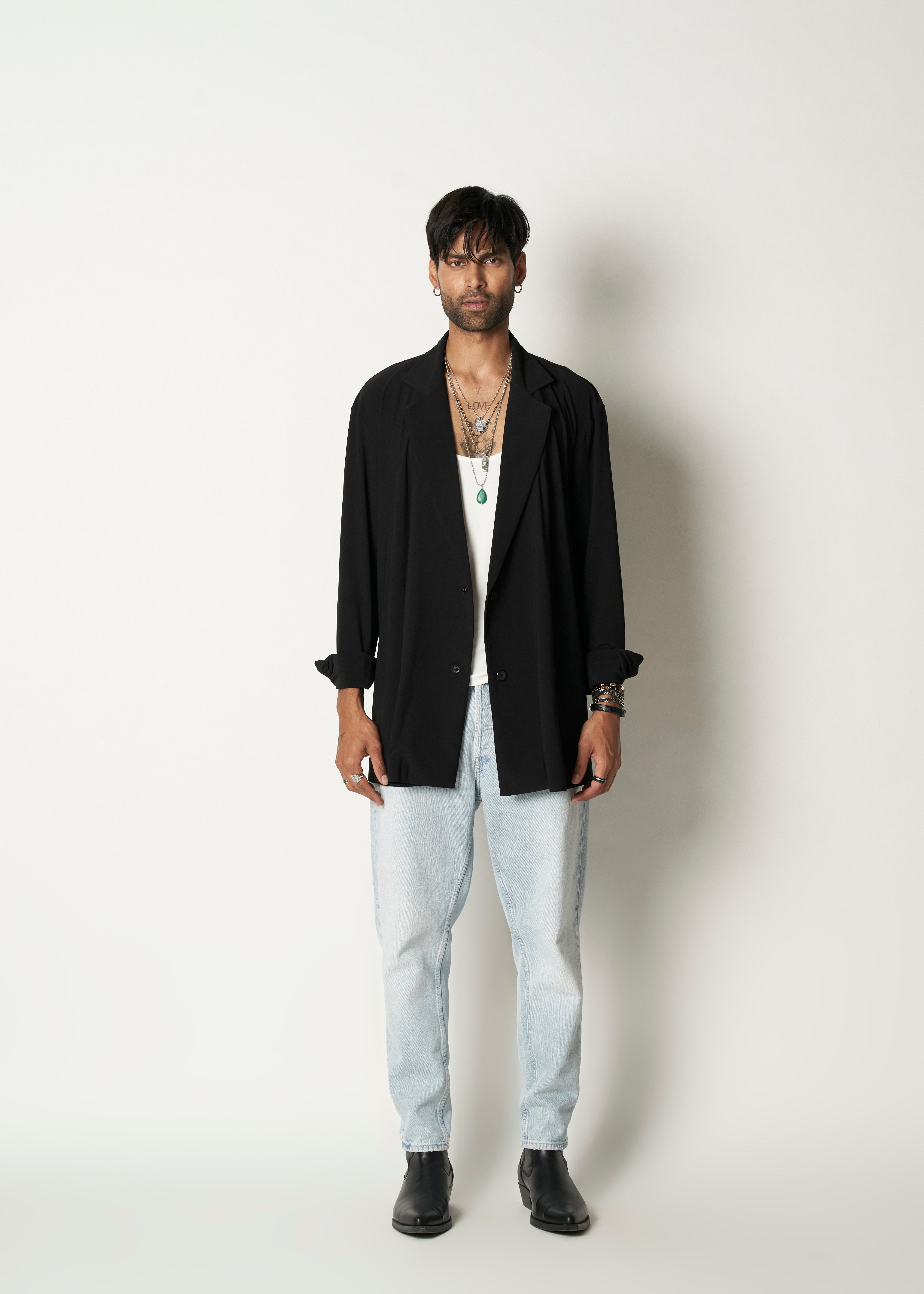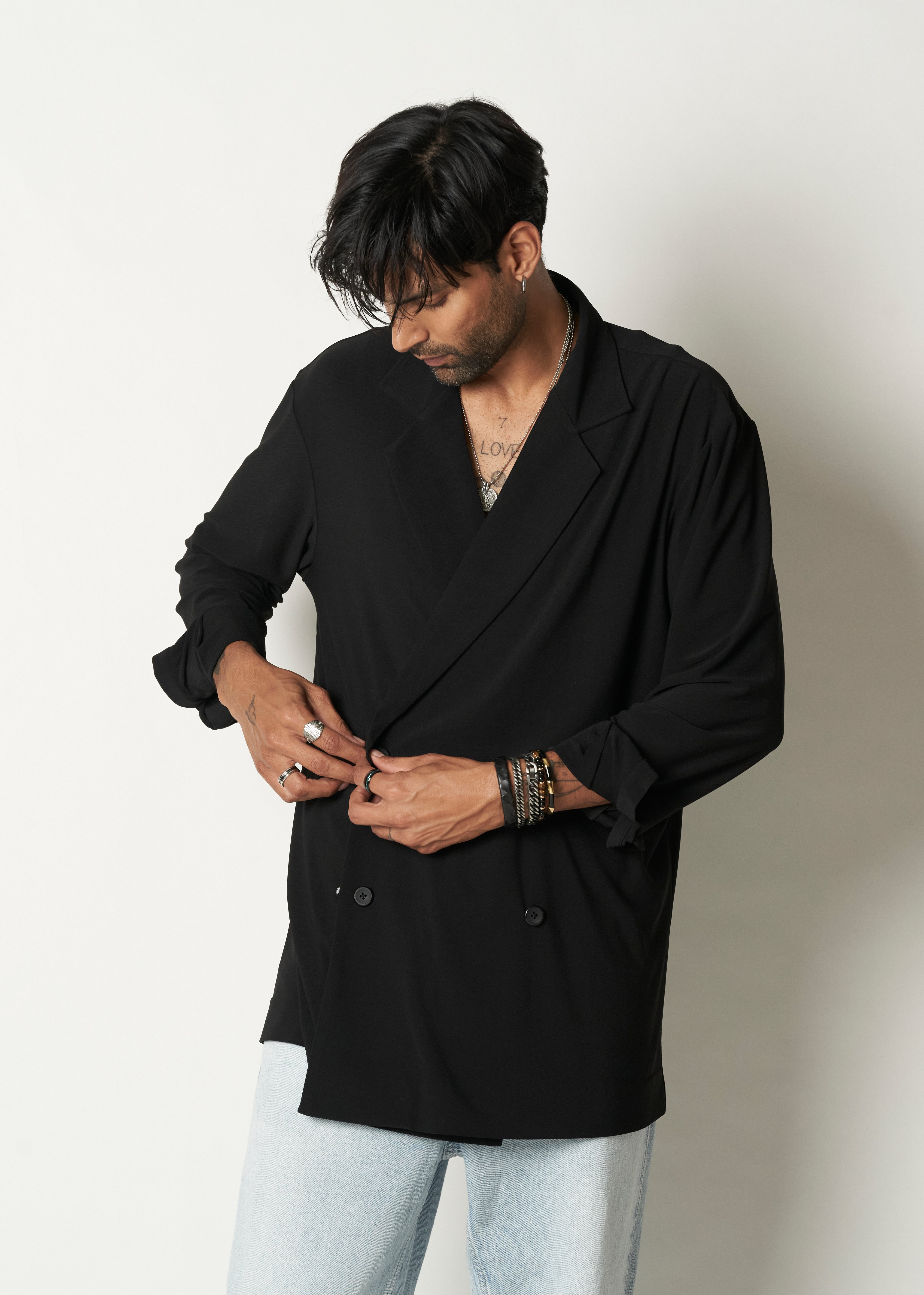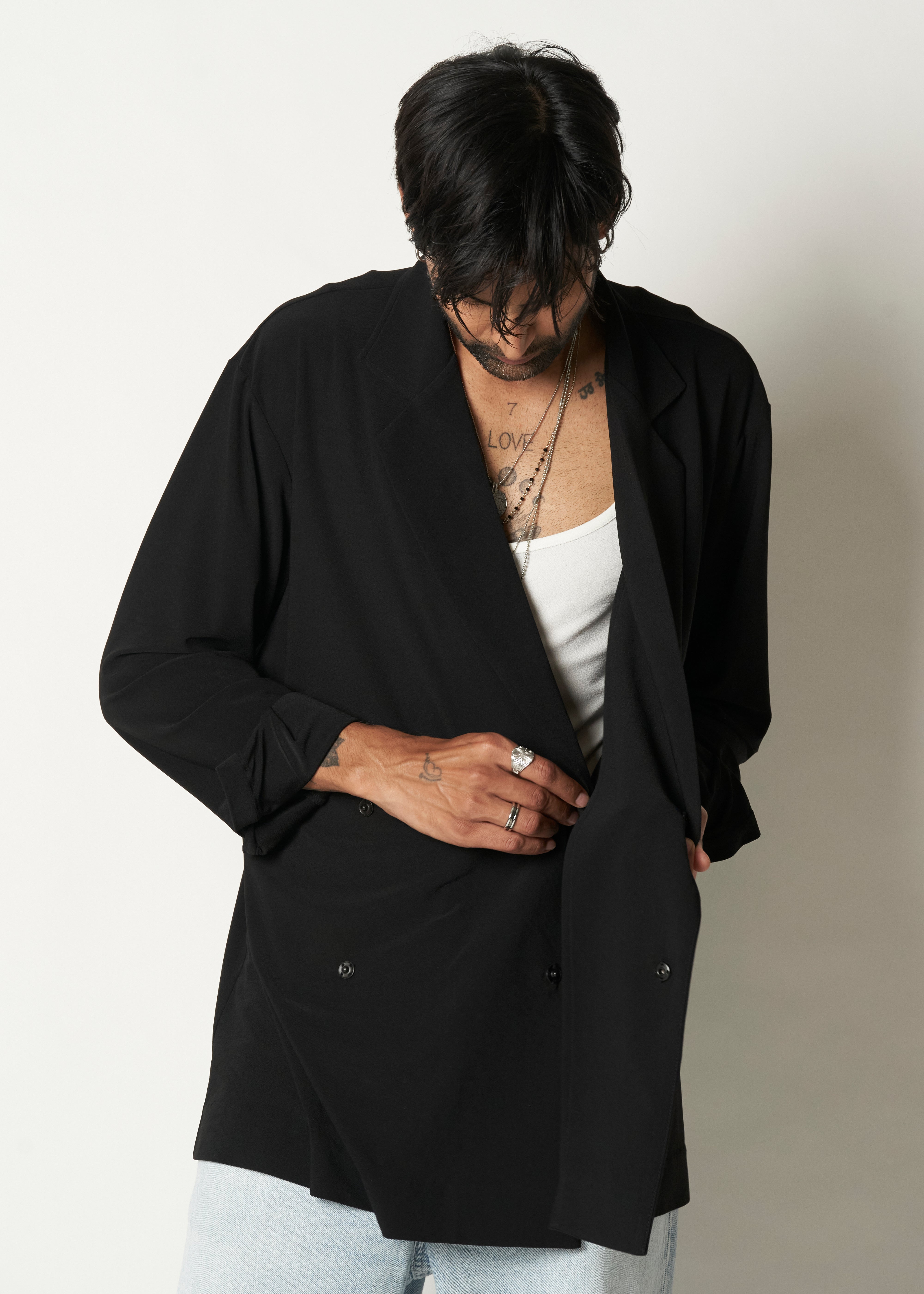The DP Blazer is a double-breasted blazer with the comfort of a cardigan. Made in jersey, it drapes flawlessly on the body with a loose cut.