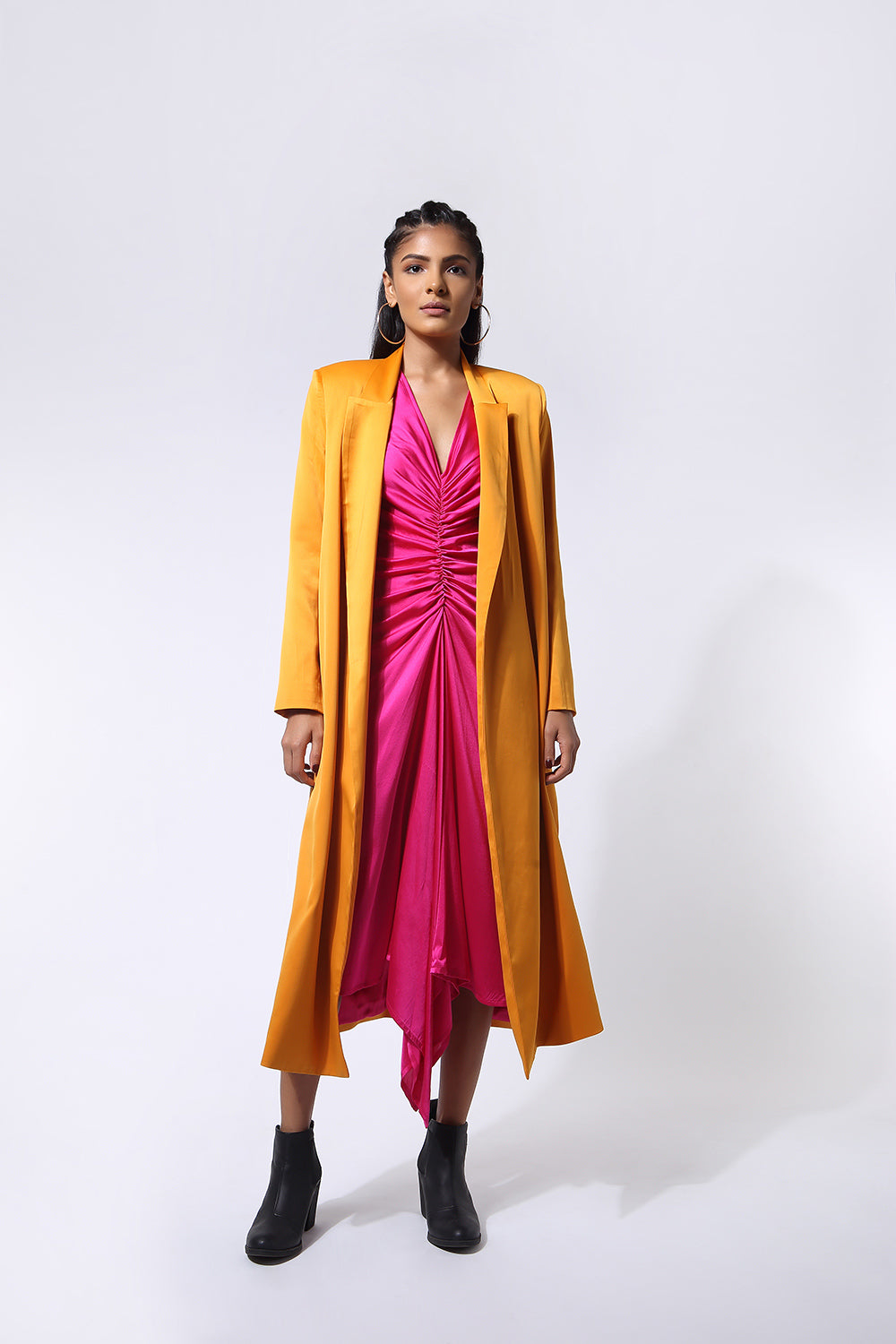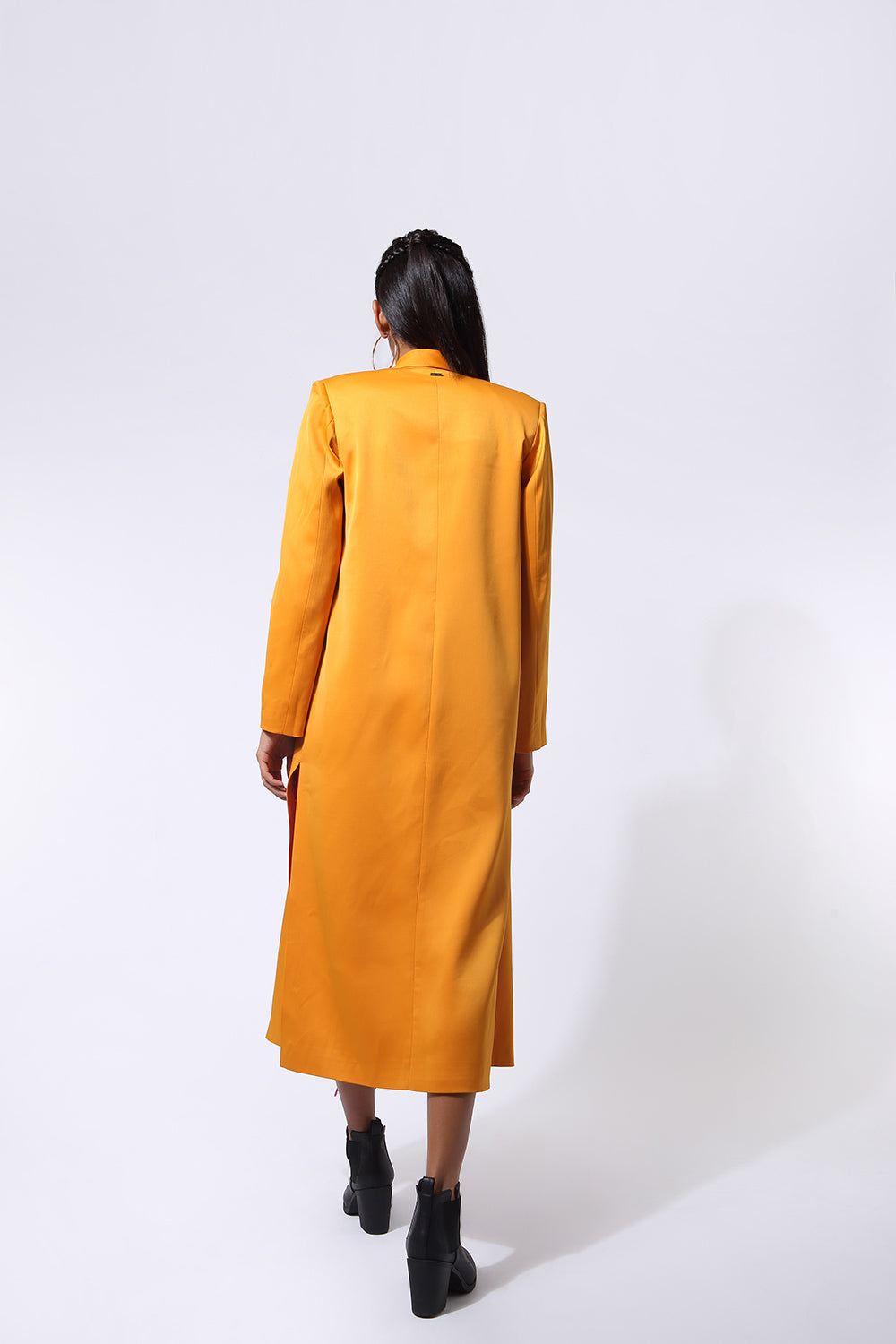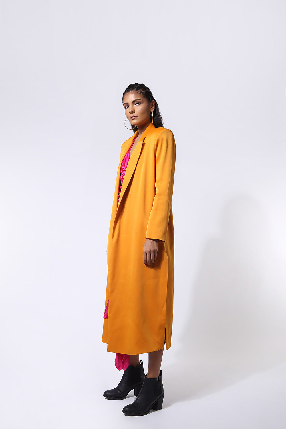 Our minimal flora jacket is an outerwear staple that instantly refines any look. It is a mid-length coat that features a notch collar with full sleeves. Pair this jazzy orange flora jacket over your favorite dress.