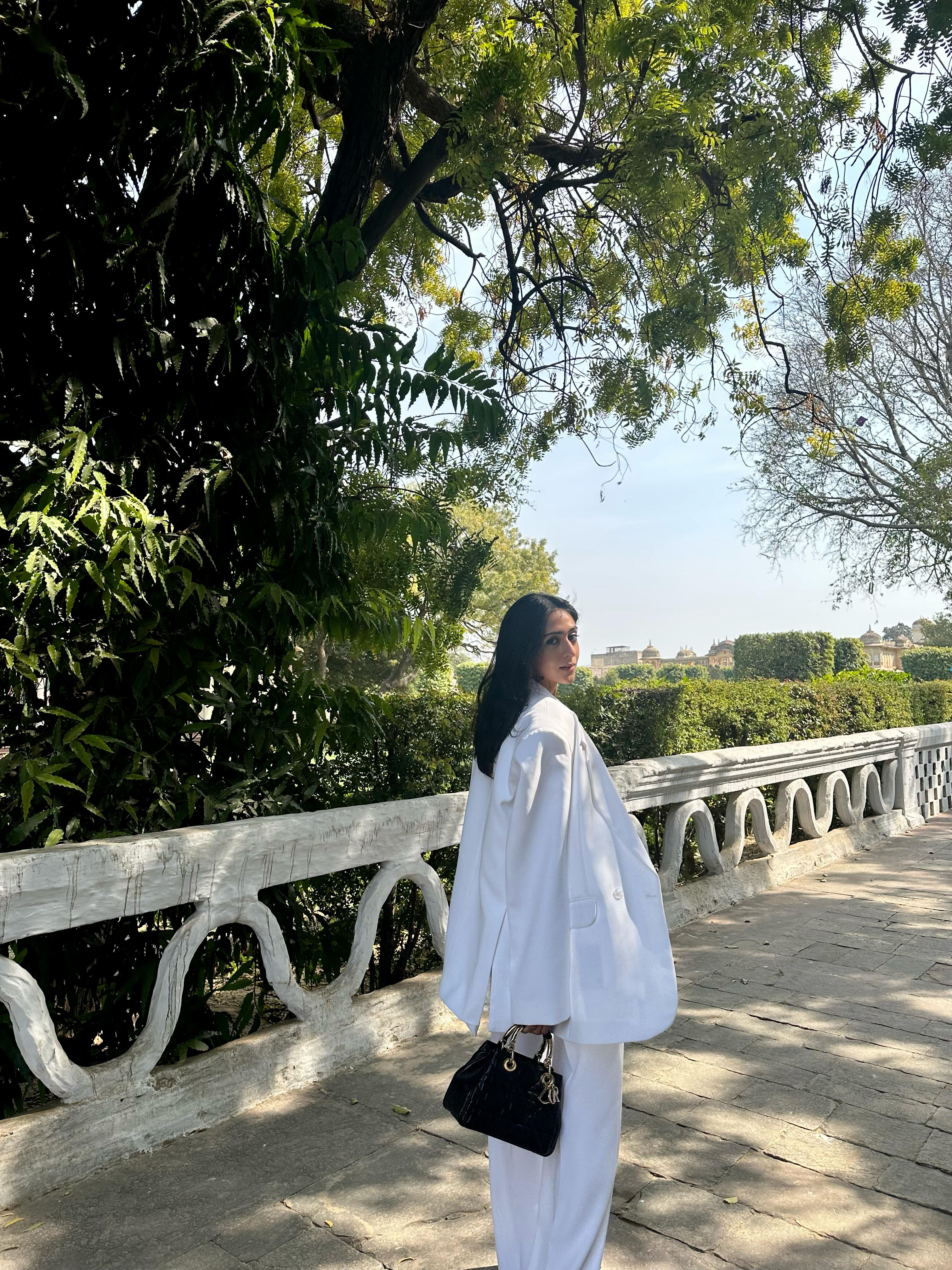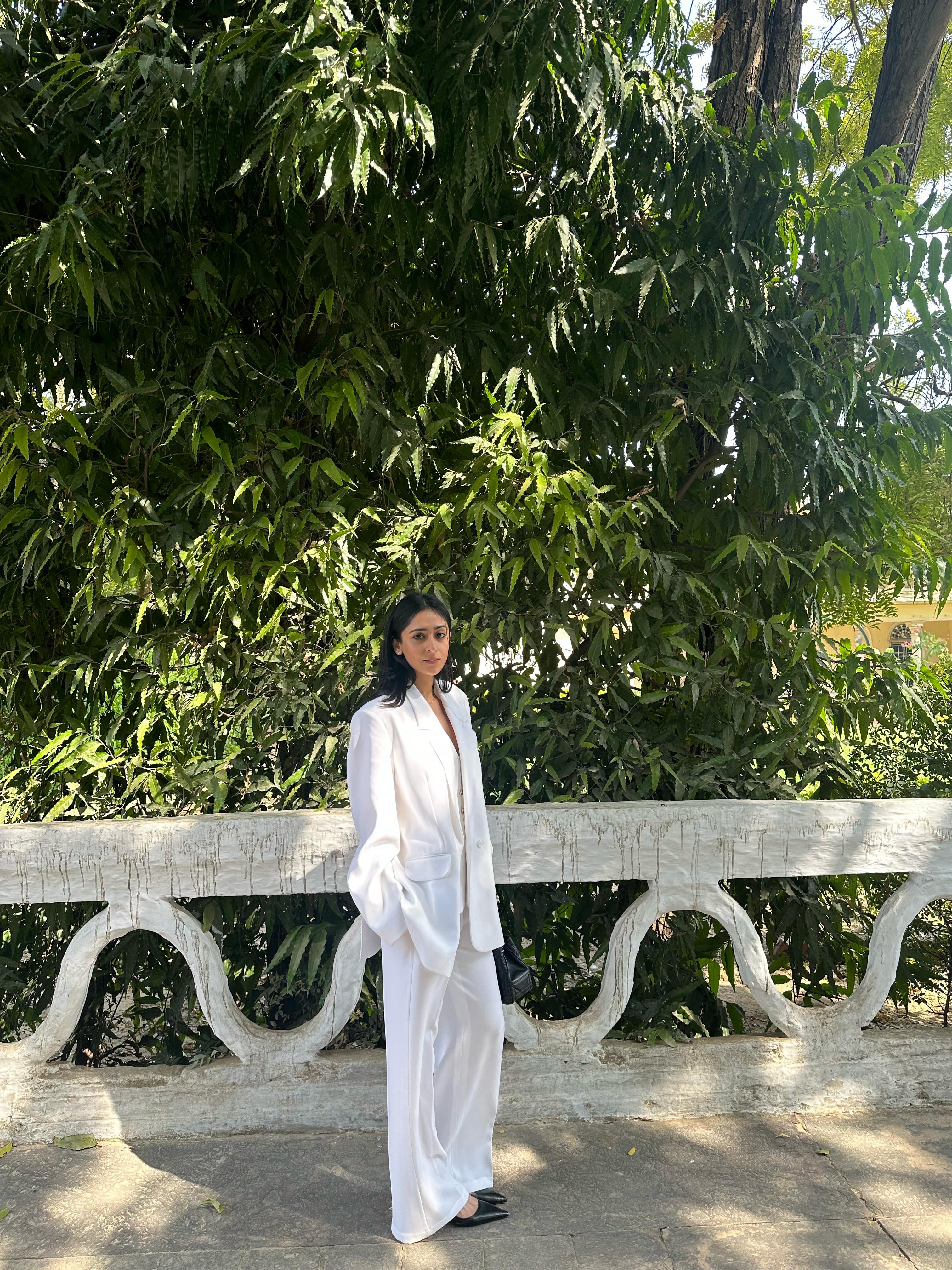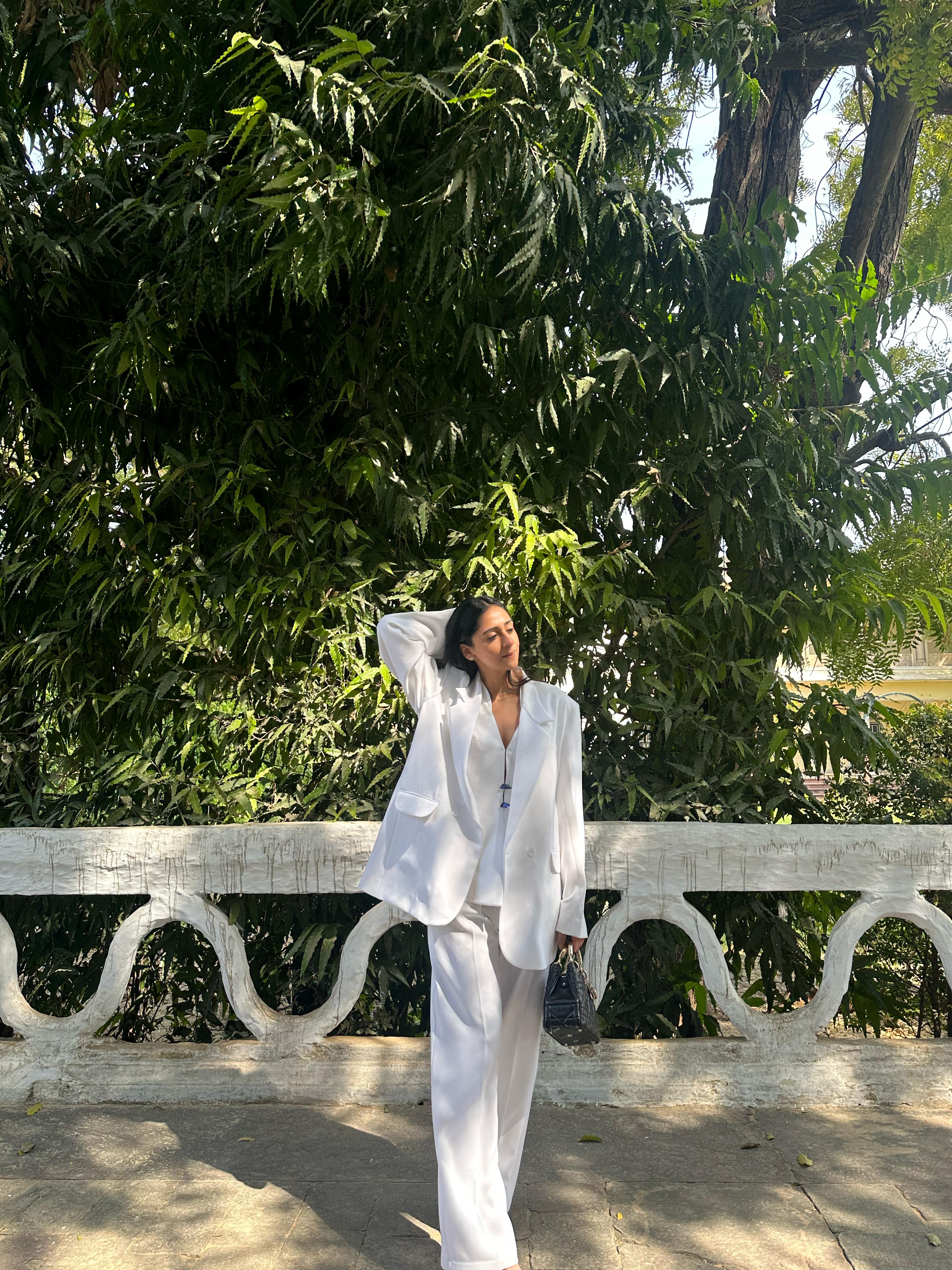 The perfect pantsuit for the day. The Tan Blazer is a tailored sleeveless blazer with a flared peplum bottom. It has a thin round collar and a deep neckline and closes in the front with loops and maxi crystal buttons. Can be worn over your shirts as well. The Tan Trousers are the perfect high-waisted flared trousers. It is tailored with front darts and pleats to give it that perfect fit and has side pockets. Closes in the front with a zipper and hooks. The Alex Blazer is an ode to classic tailoring. Cut from a comfortable suiting fabric it has an oversized fit. It is designed with notched lapels, shoulder pads for added structure, and a single-breasted button fastening. Complete your set with our matching trousers and waistcoat or style it as a separate over your dresses or jeans.