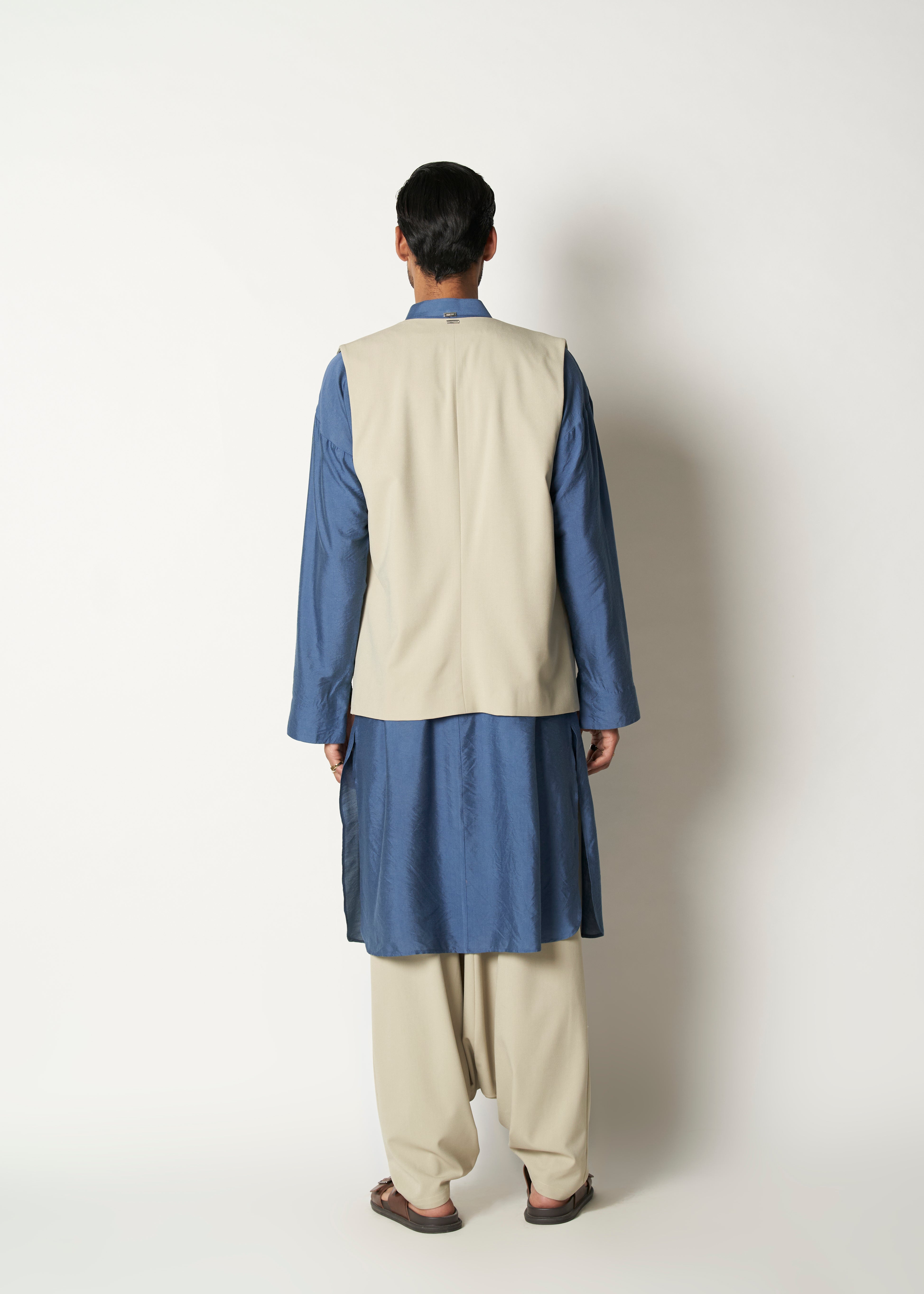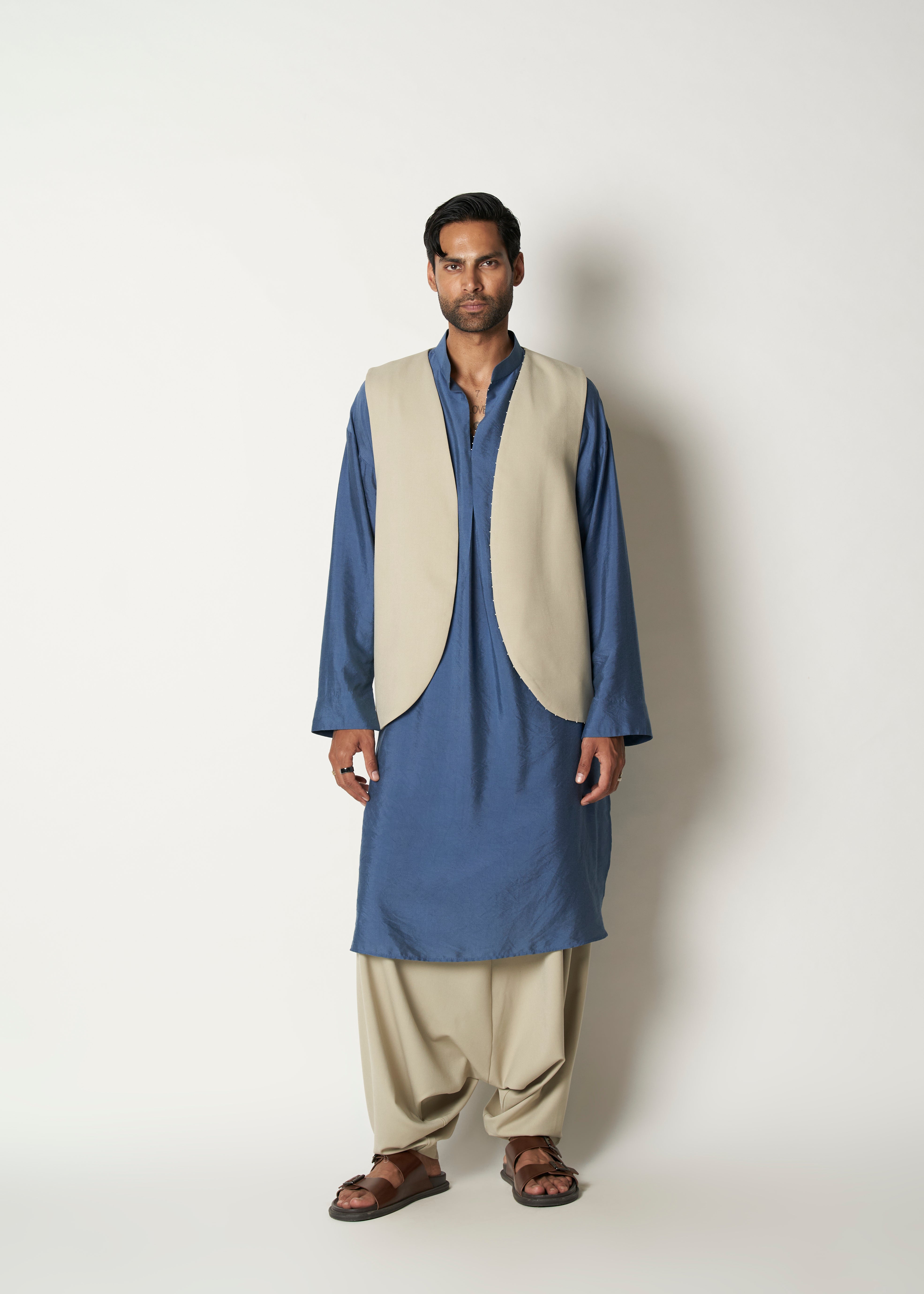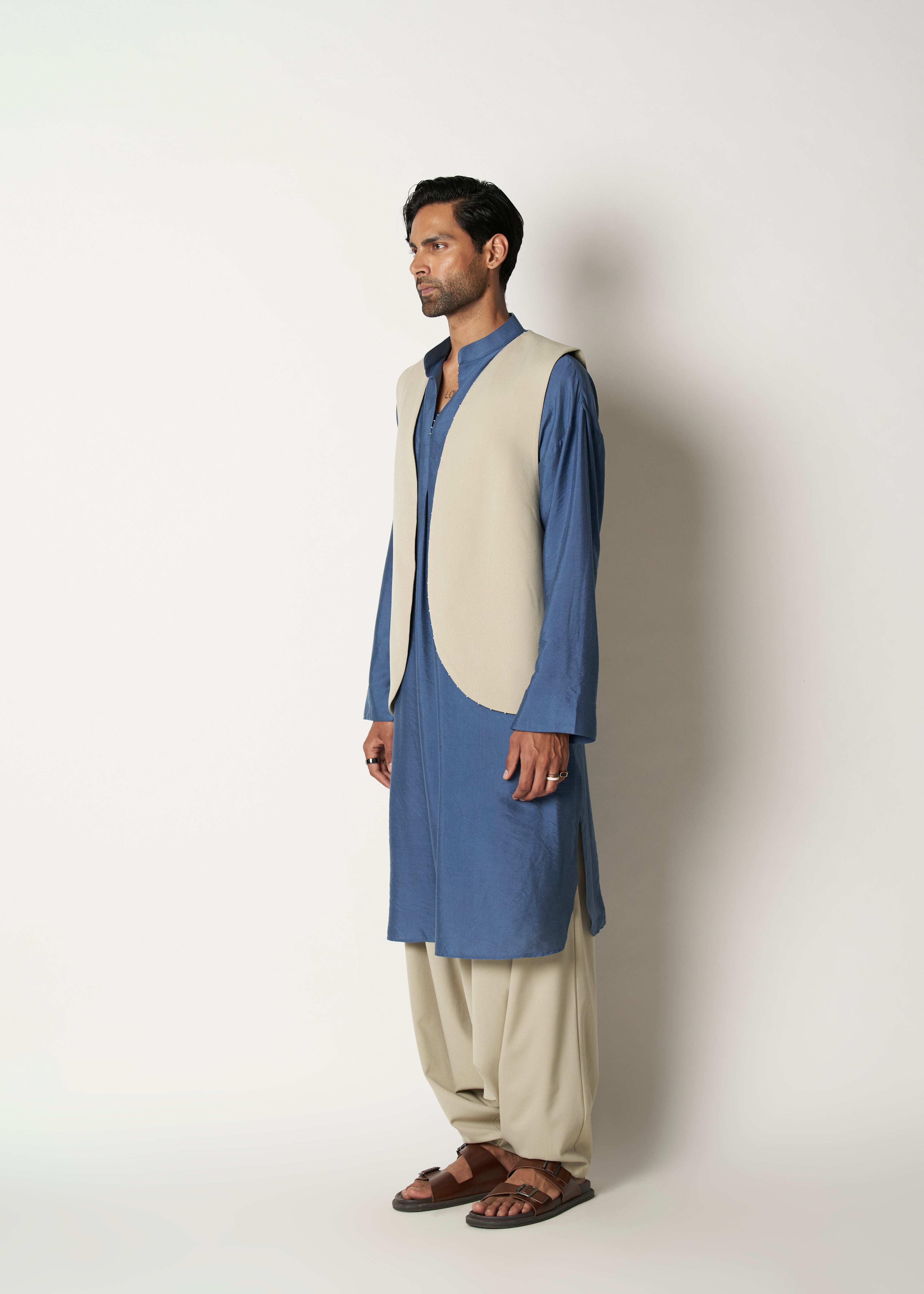 Men's Vest is a loose cut, open bundi. It's got a minimal embroidery detail in the front. Pair it with our Nav Kurta and Neo Pants.
