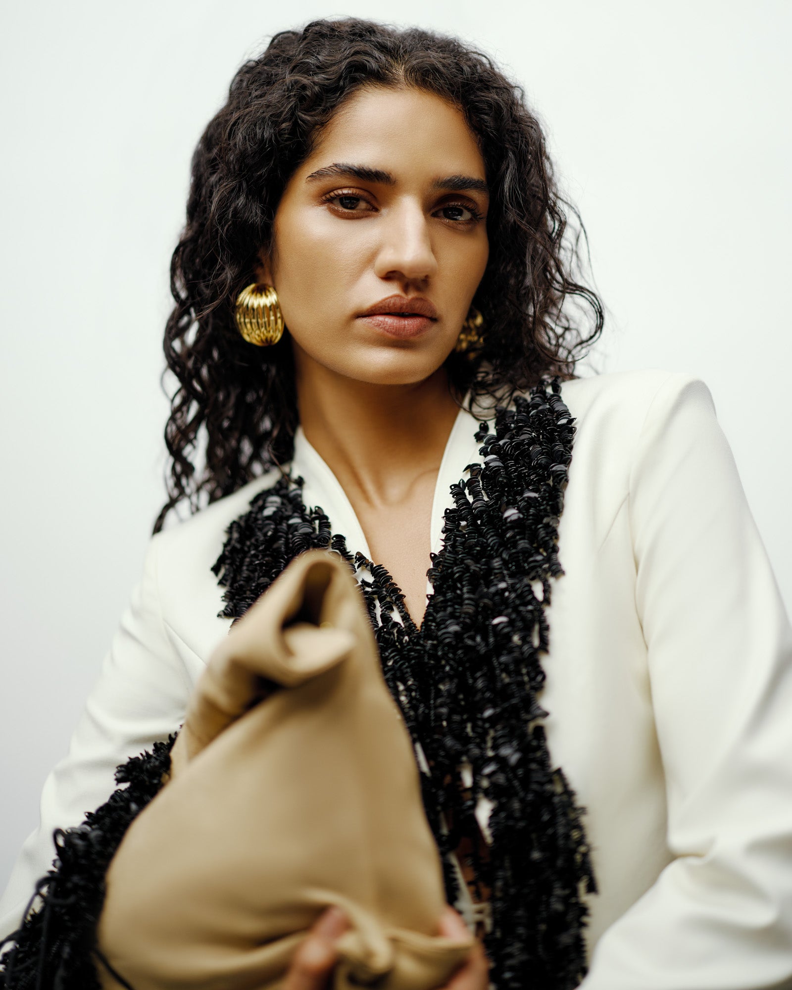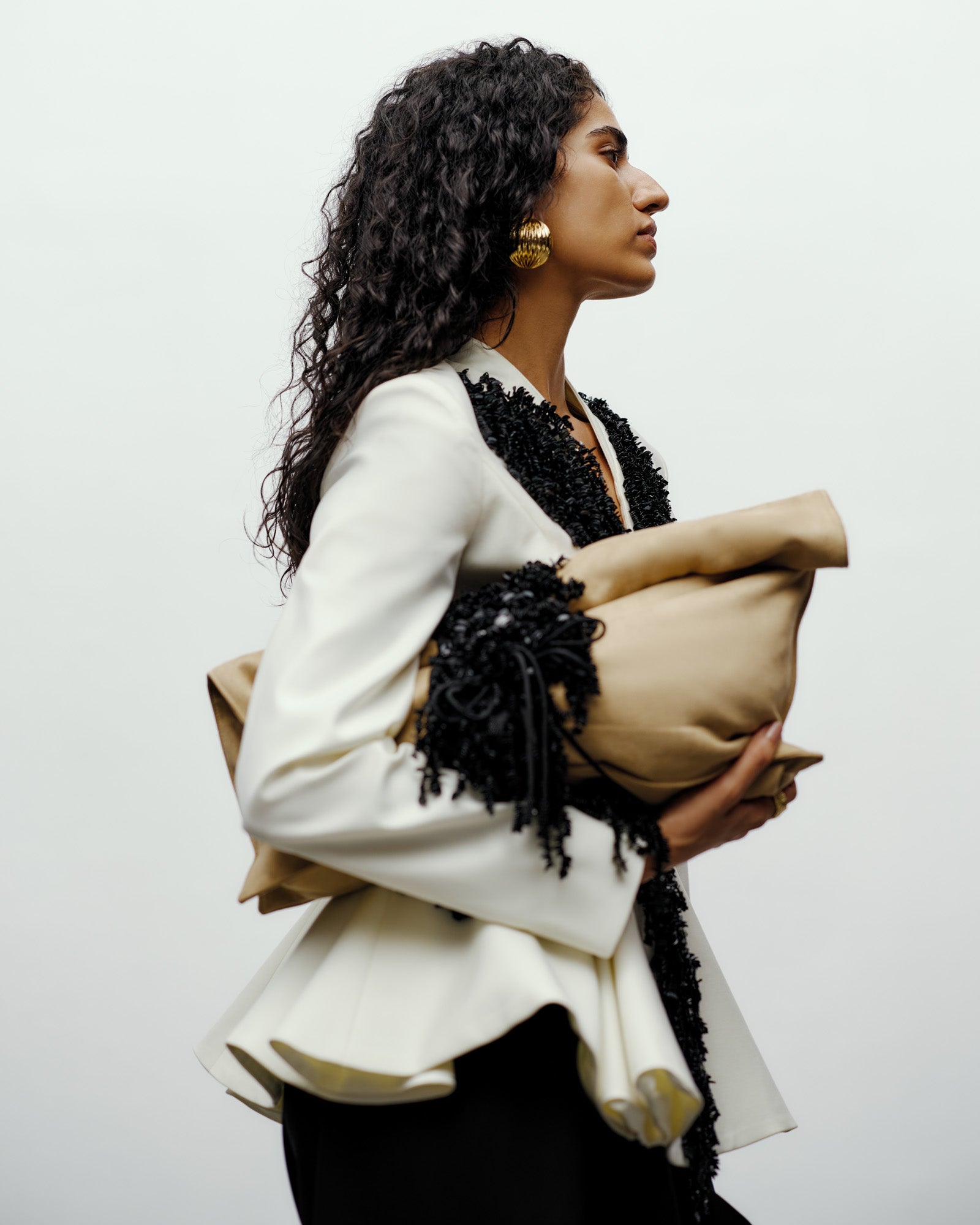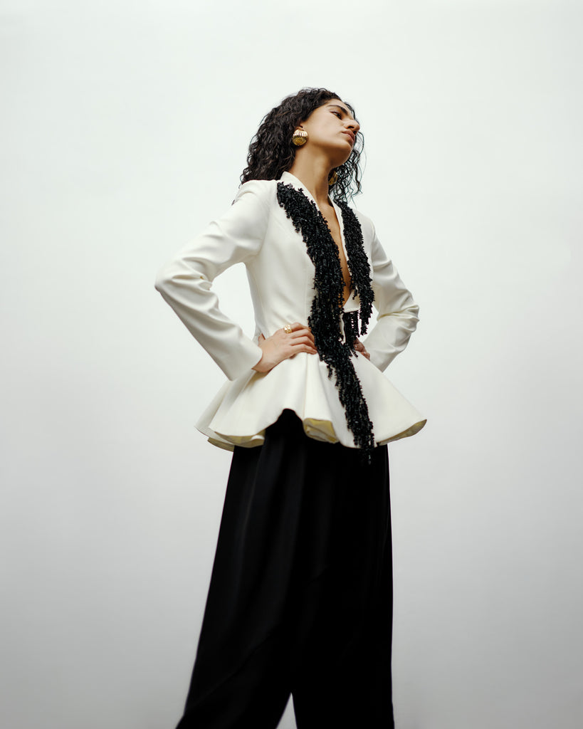 Sculptural elegance meets tactile artistry in the 431-88 embellished peplum jacket. This structured ivory jacket is meticulously tailored to accentuate form, featuring a cinched waist and flared peplum hem that creates an effortlessly feminine silhouette. A striking hand-embroidered black beaded embellishments, tassel down the front, adding depth, texture, and movement to the minimalist design. The open plunge neckline introduces a sense of fluid sensuality, perfectly balancing the jacket’s sharp architectural lines. Designed to be both statement and staple, this piece transitions seamlessly from editorial sophistication to modern eveningwear.