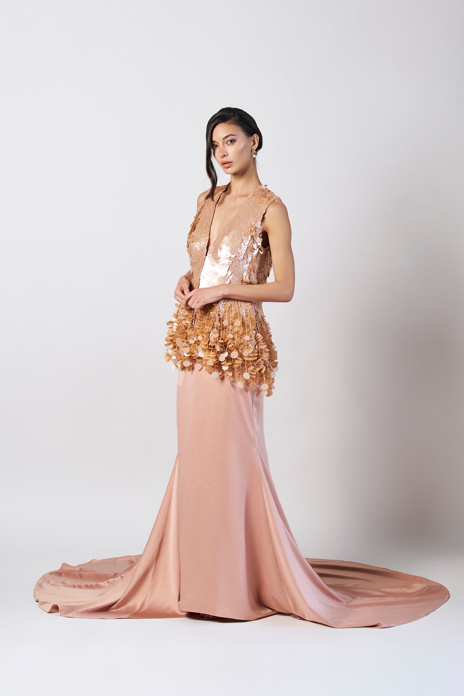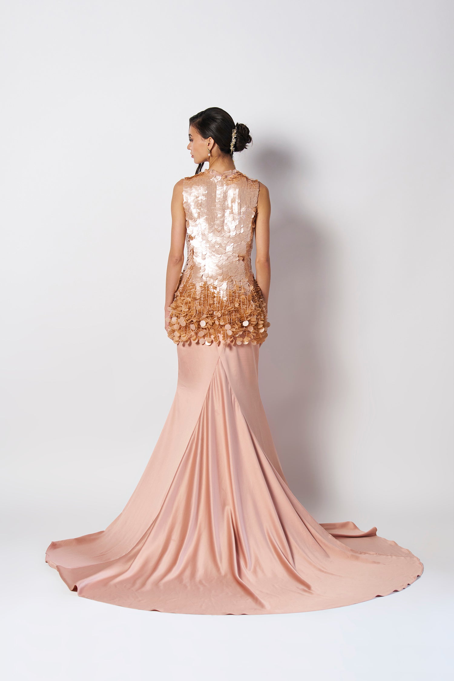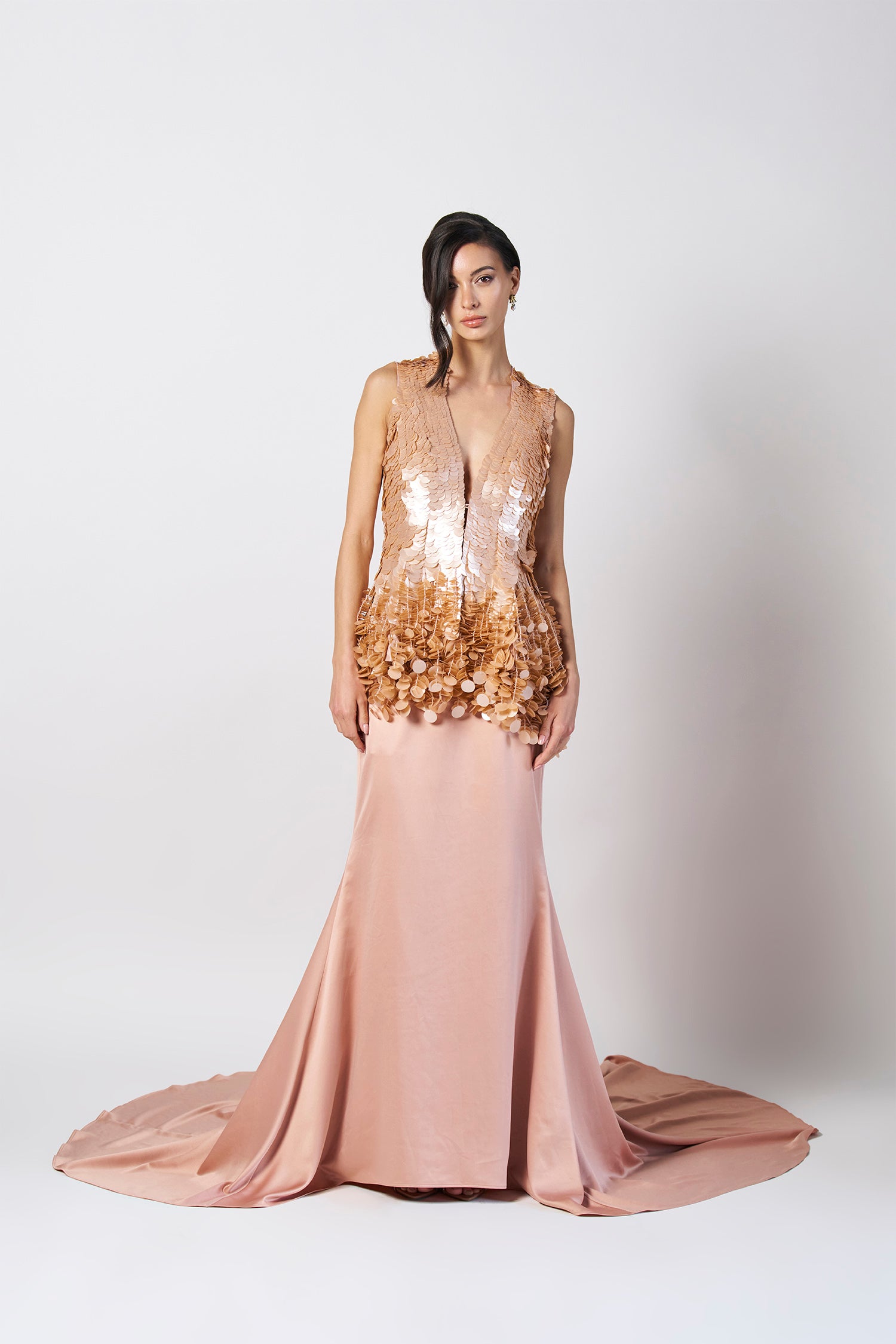 The Ro jacket is a meticulously hand-embroidered piece adorned with sequins throughout. This sleeveless jacket is tailored for a flattering fit, featuring a flared peplum at the hem with sequin tassel details. It is designed with a thin round collar, a deep neckline, and fastens at the front with a button and loop closure. Perfect for layering over a sari or skirt. This can be paired with our Anaya skirt, The skirt offers timeless elegance, made from soft, luxurious crepe fabric that drapes beautifully around the body. It features a long trail at the back and a side zipper closure.
