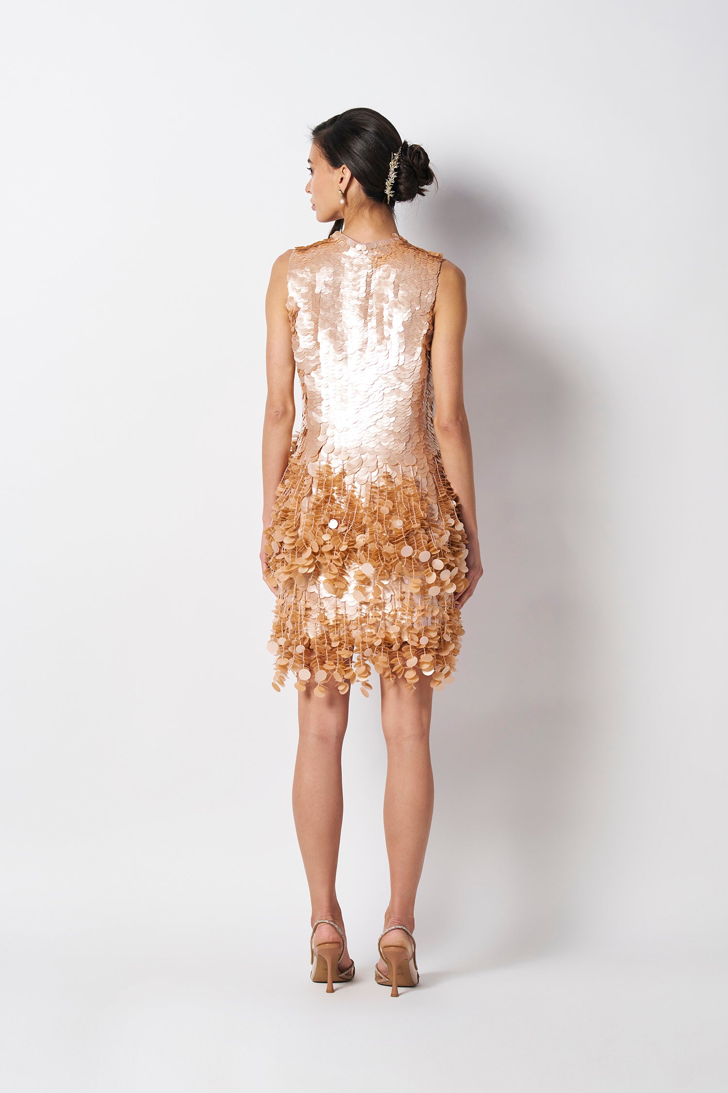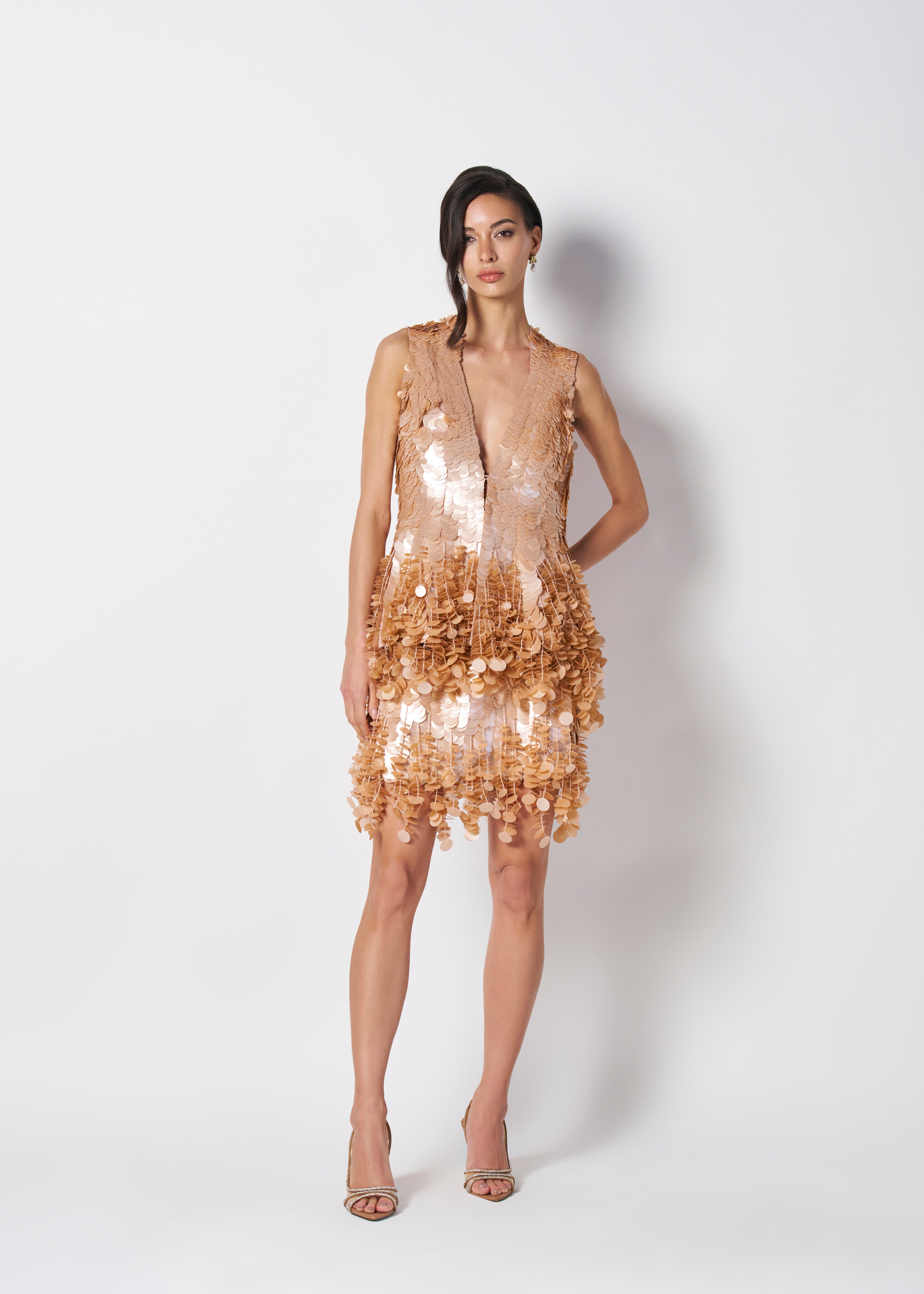 The Ro jacket is a meticulously hand-embroidered piece adorned with sequins throughout. This sleeveless jacket is tailored for a flattering fit, featuring a flared peplum at the hem with sequin tassel details. It is designed with a thin round collar, a deep neckline, and fastens at the front with a button and loop closure. Perfect for layering over a sari or skirt.