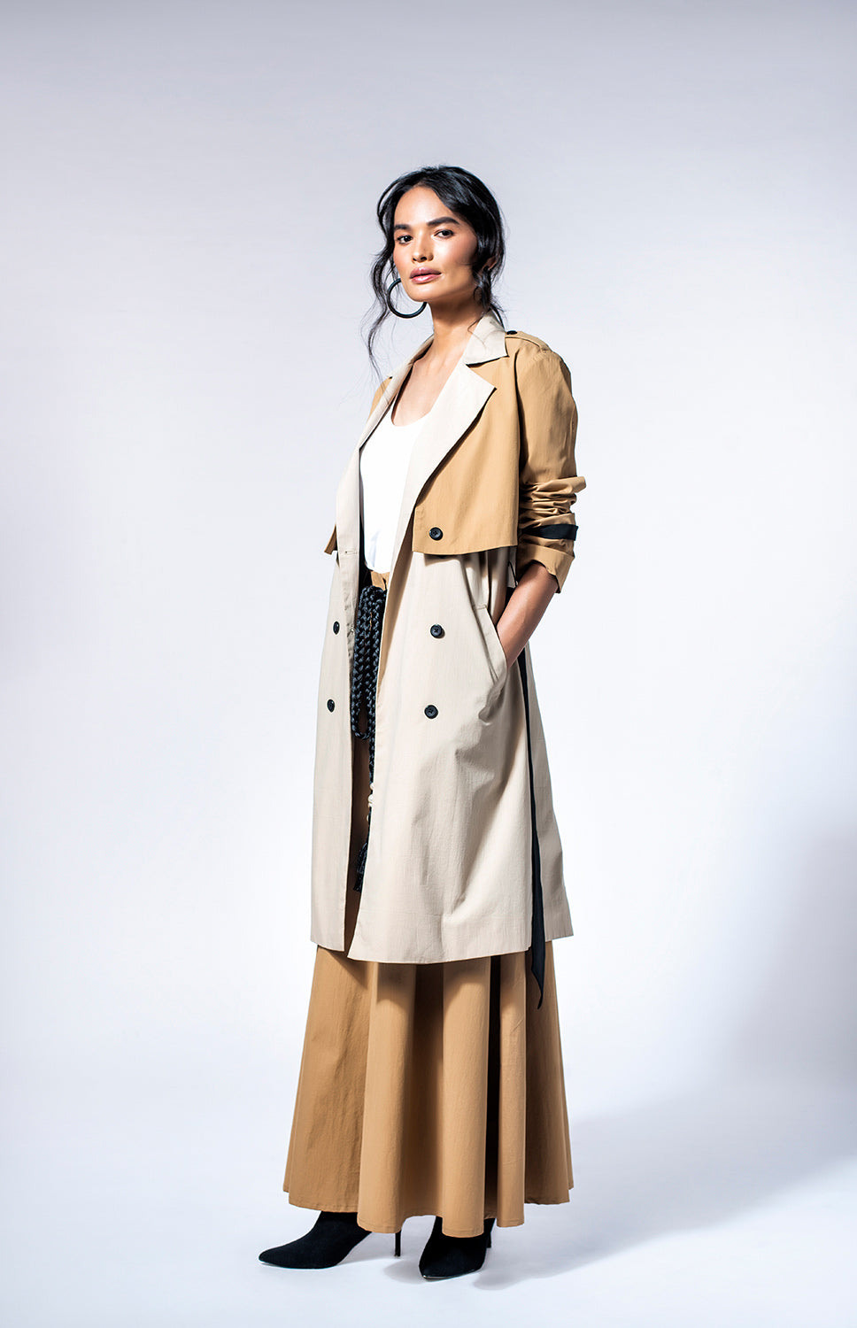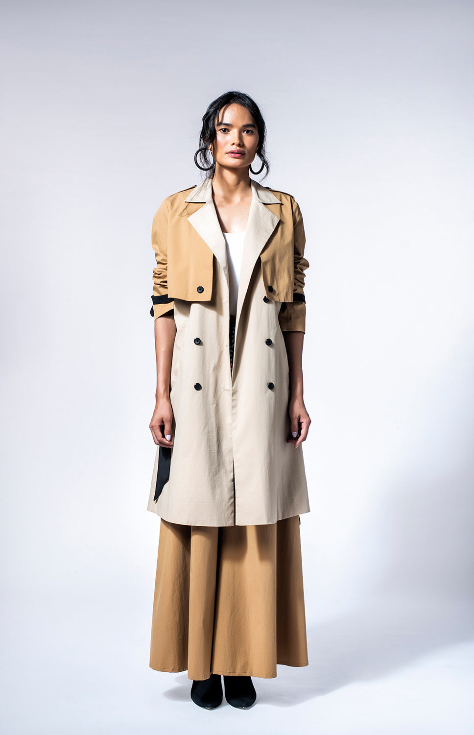 A versatile dual Sumera trench coat that can be worn either with the upper layer that has sleeves or without to make it sleeveless. A perfect travel companion.