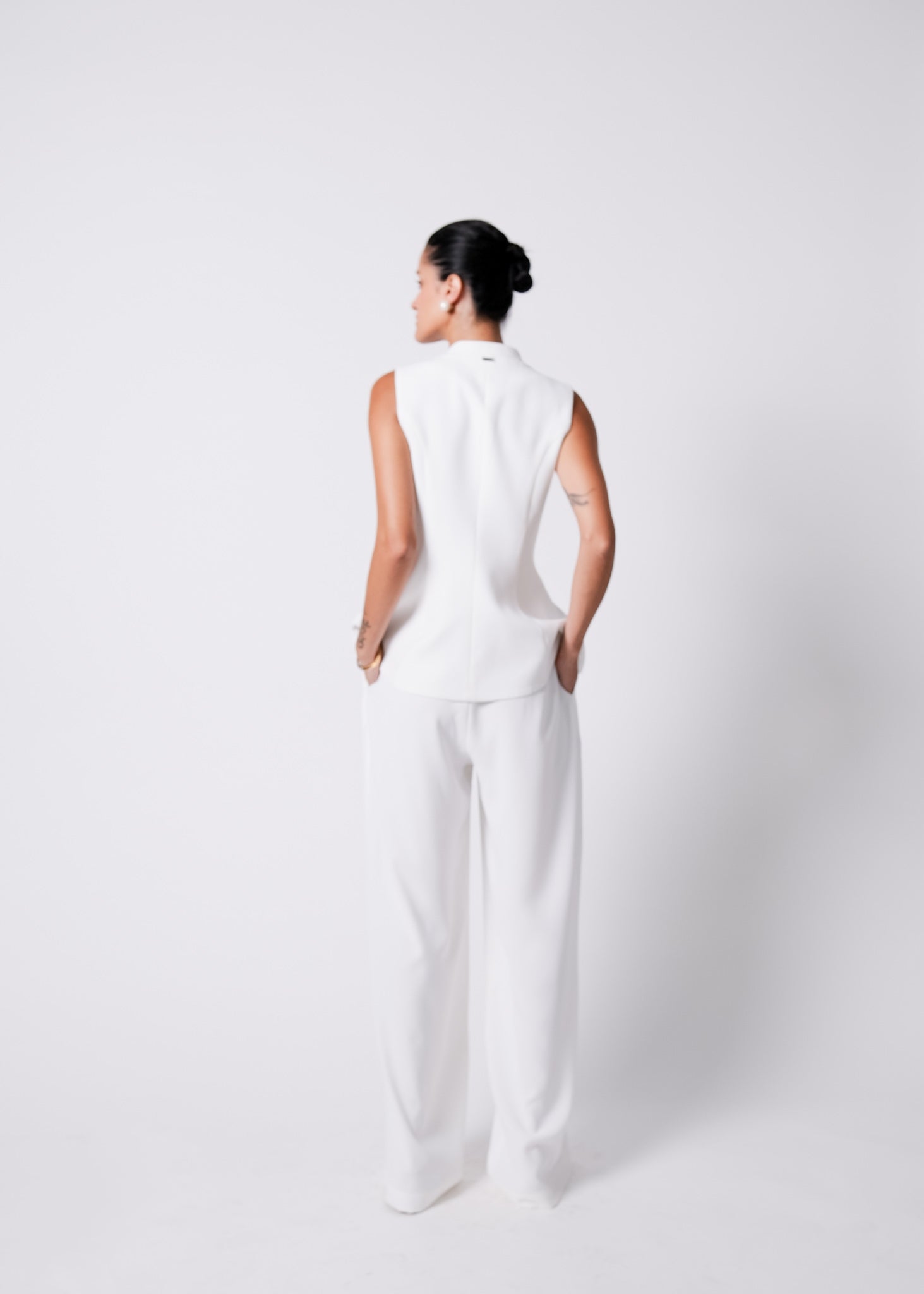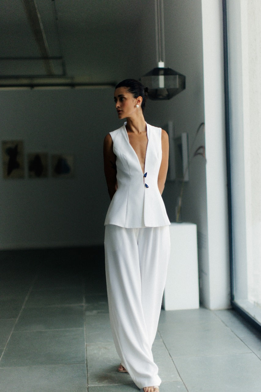 The perfect pantsuit for the day. The Tan Blazer is a tailored sleeveless blazer with a flared peplum bottom. It has a thin round collar and a deep neckline and closes in the front with loops and maxi crystal buttons. Can be worn over your shirts as well.
