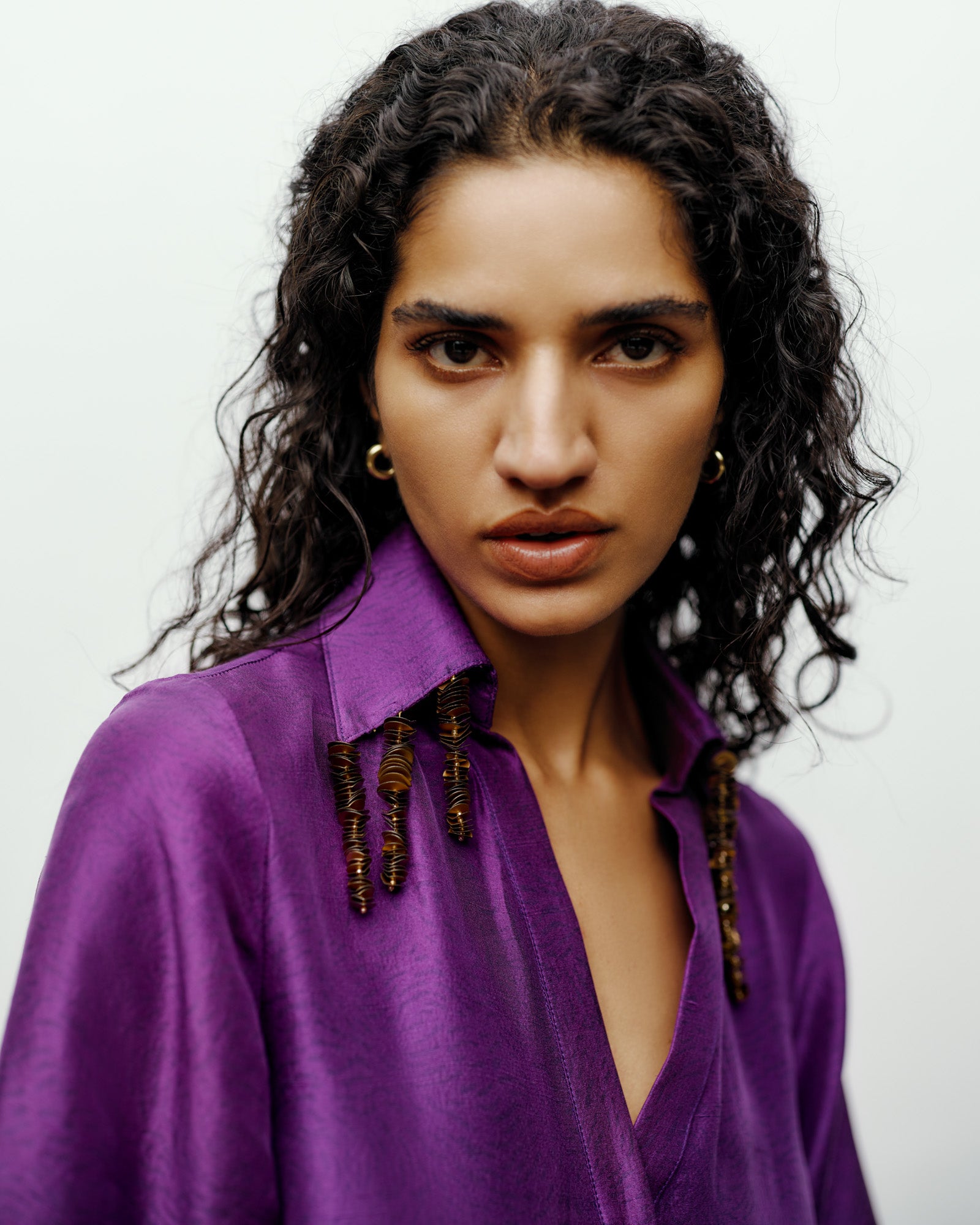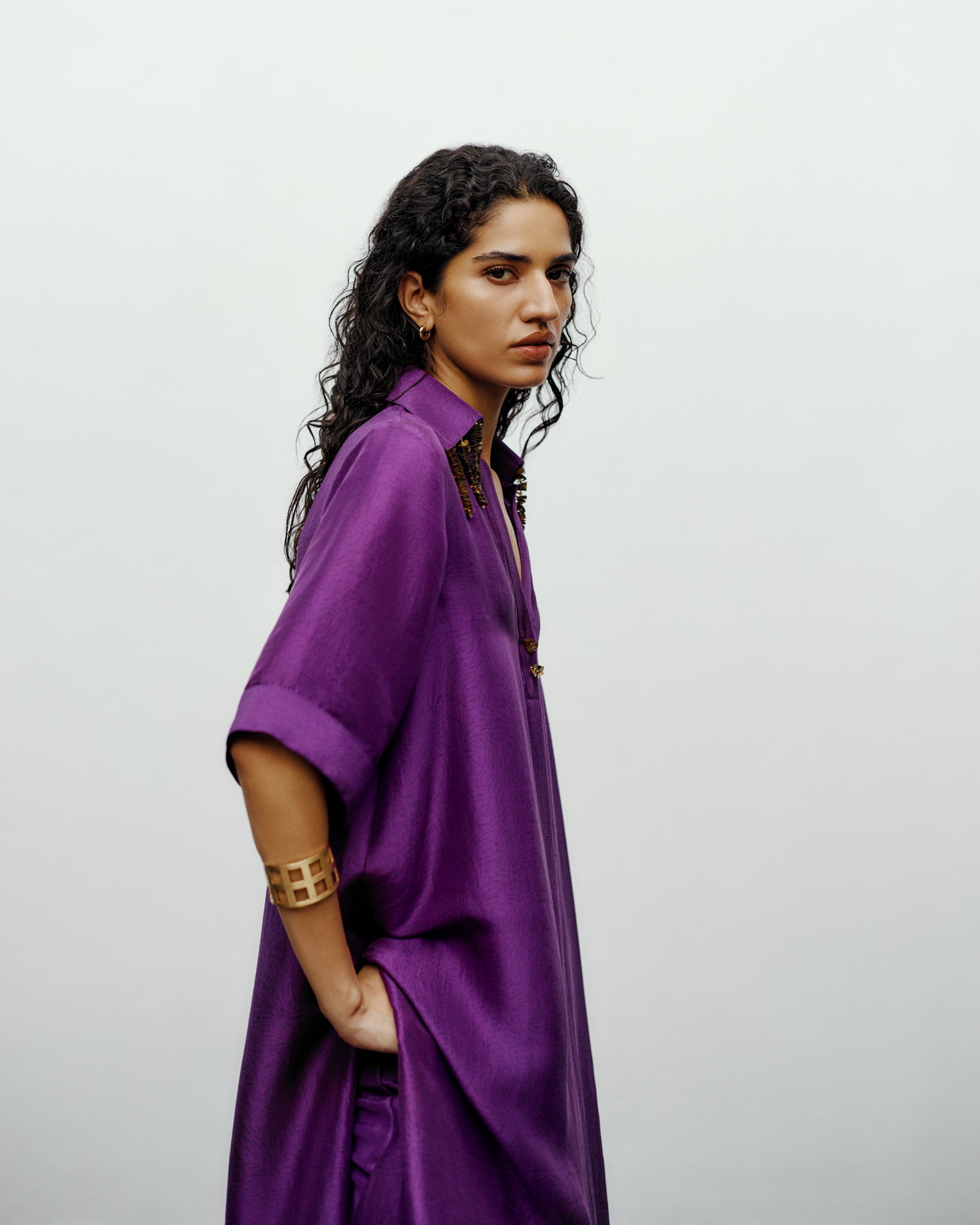 The Fern Kurta Set in purple channels understated sophistication with fluid tailoring and luminous texture. Cut from lightweight silk, this silhouette features a relaxed drape with a collared neckline and soft front pleats that create subtle volume and movement paired with comfortable pants . Designed for ease and elegance, the kurta falls gracefully to an asymmetric hemline, offering both comfort and effortless poise. A deep purple hue enhances its timeless appeal, making it ideal for both intimate gatherings and elevated daywear.