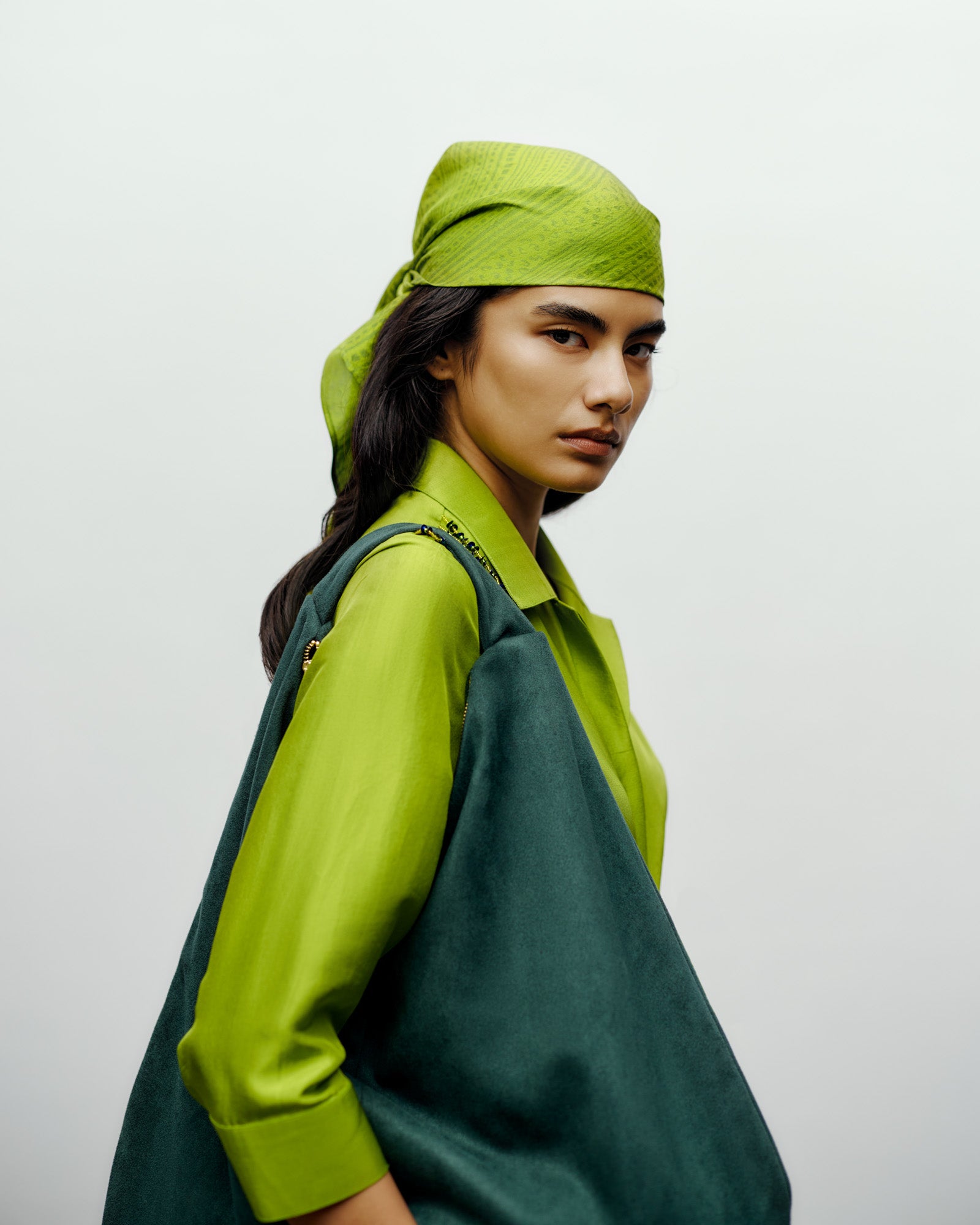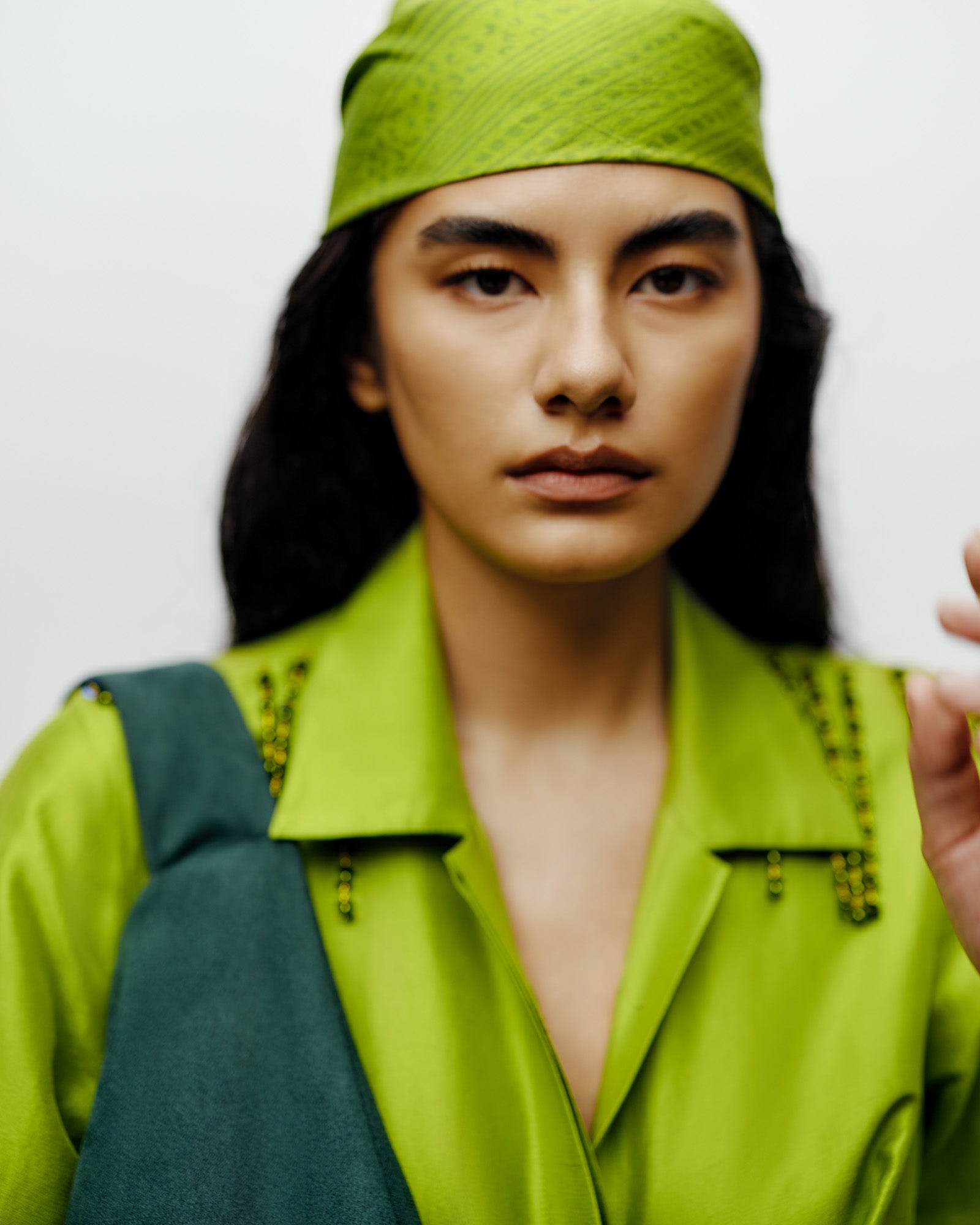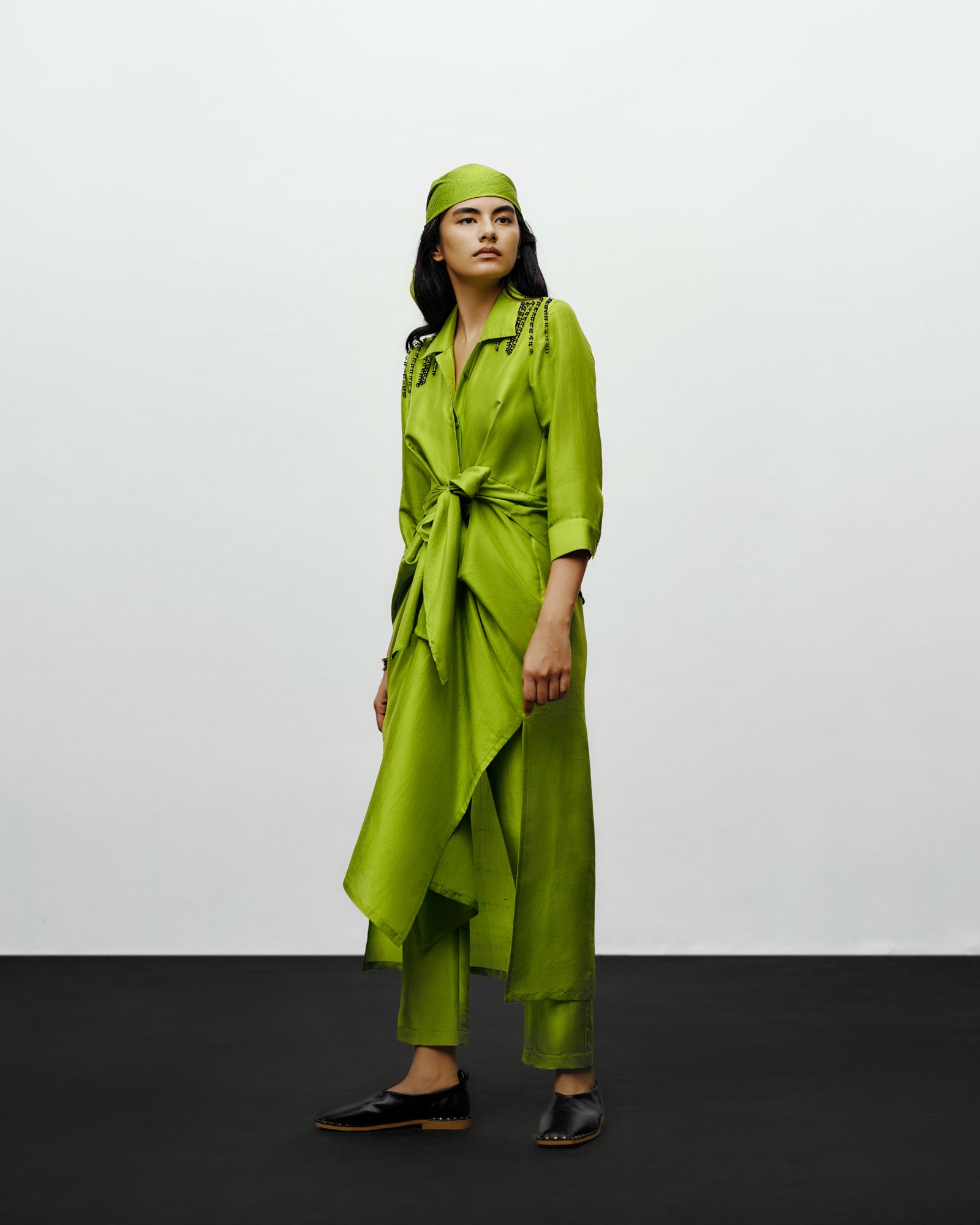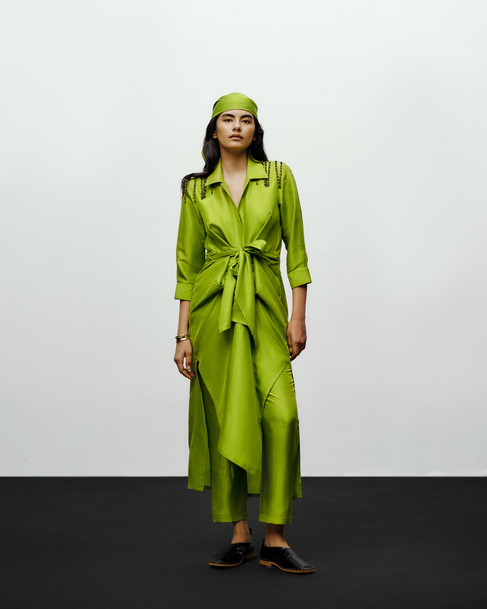 The Tancy Kurta Set in lime green redefines contemporary tailoring. Crafted from lustrous silk in a subtle print, this kurta features a front-tie silhouette that cinches at the waist, creating a sculptural drape that flatters every form, with tassels on shoulder. Designed with a collared neckline and extended front panels, it transitions effortlessly from daywear to evening sophistication. The lightweight sheen and asymmetric hemline lend a sense of movement and understated luxury with comfortable pants — a modern interpretation of effortless polish.