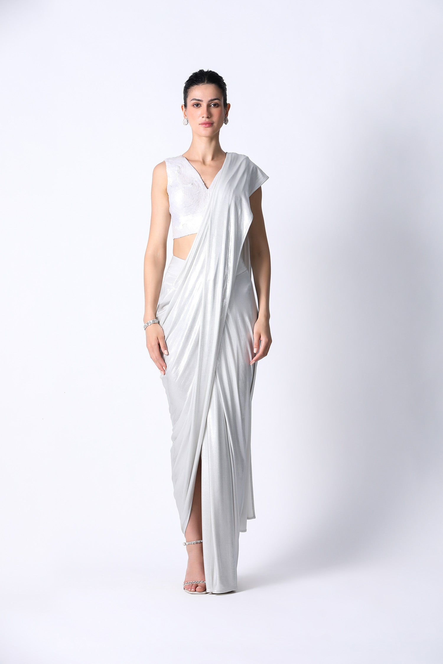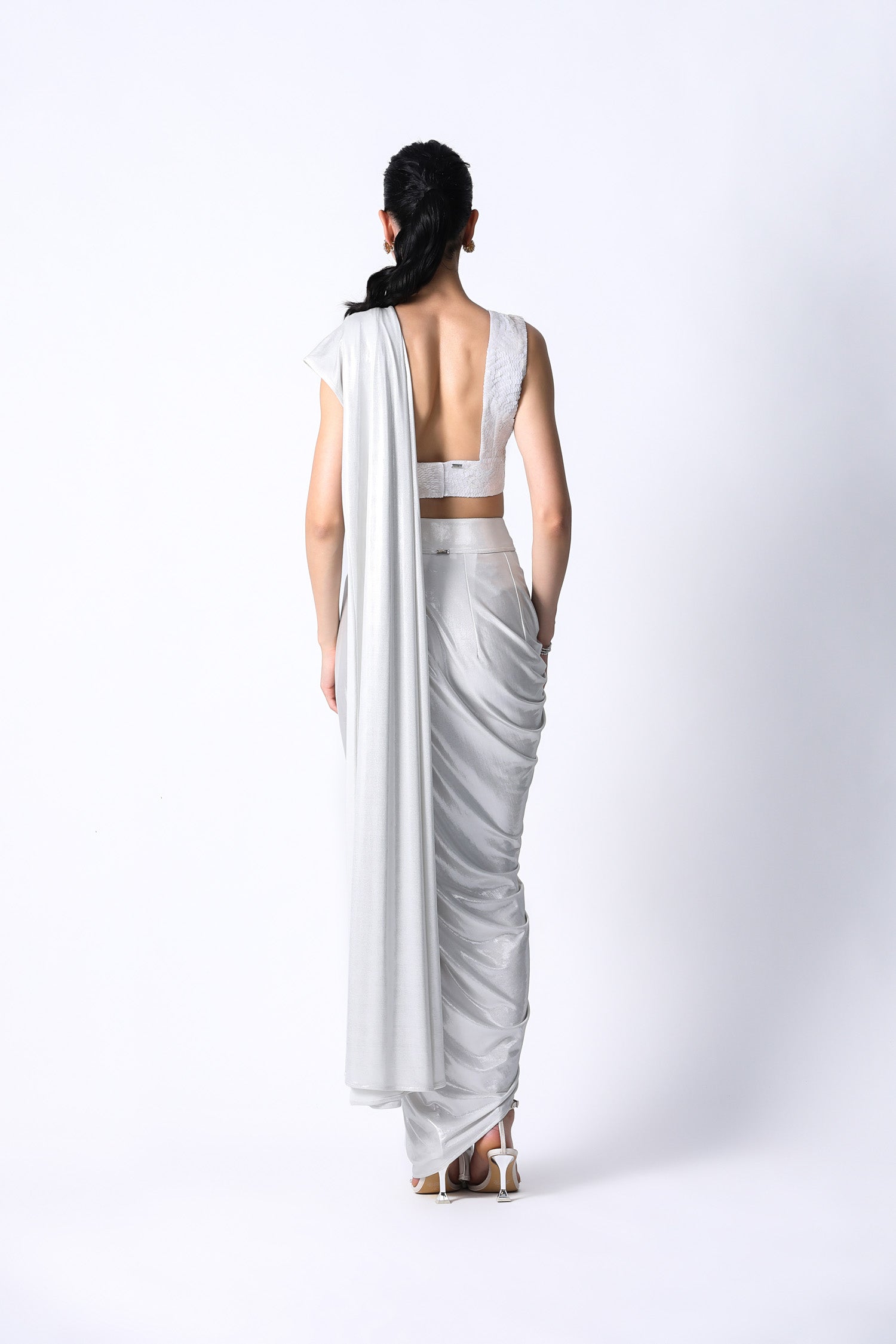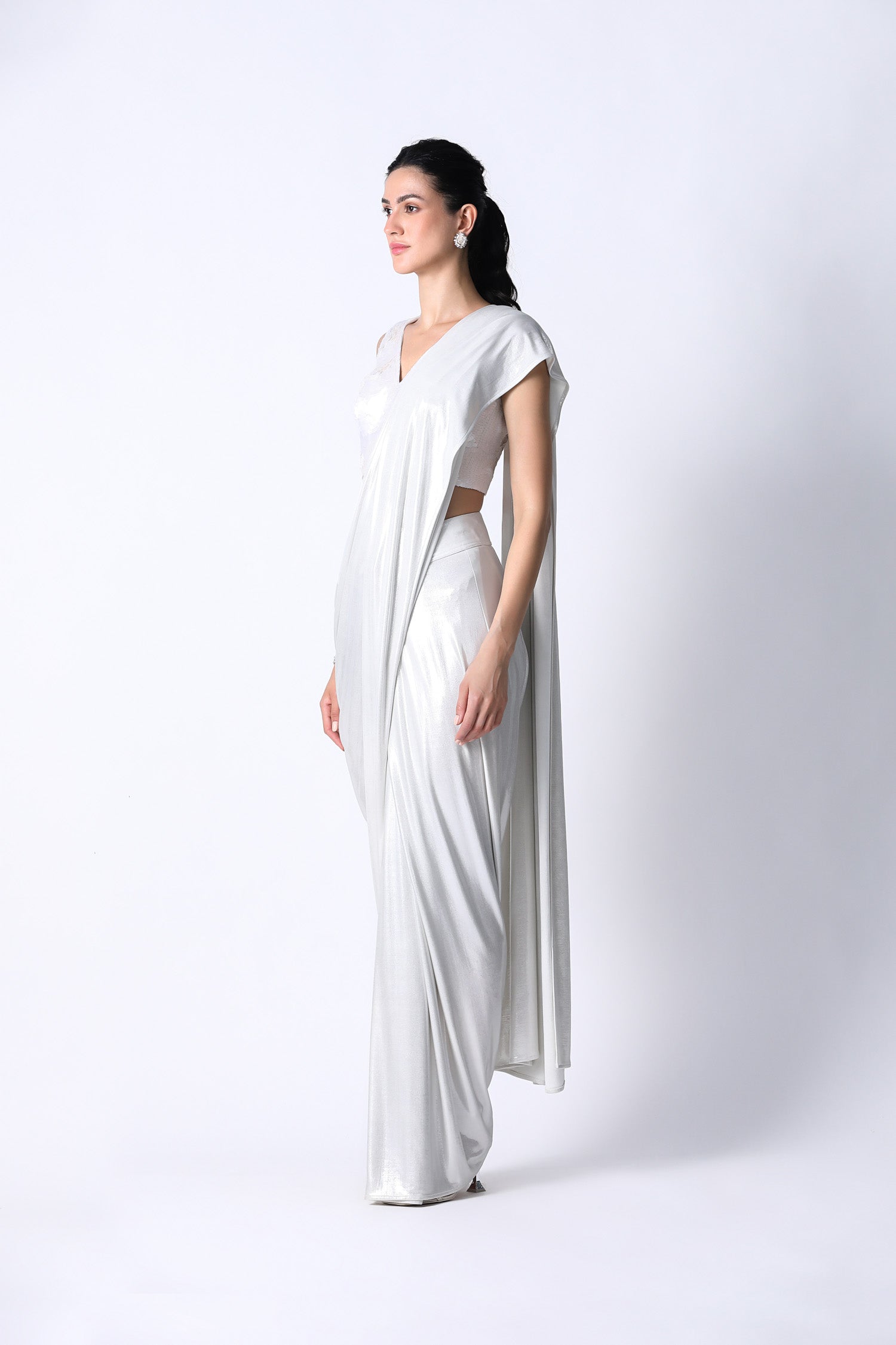 Our bestselling draped sari now in our new slinky jersey that literally feels like liquid. The Waterfall Sari is lightweight, crush free and easy to wear. All you need to do is button up the waist, throw the pallu over your shoulder and you are good to go. Pair it with our bestselling APS Blouse that is embroidered with sequins and glass beads. It has a deep V neck and closes at the back with hooks.